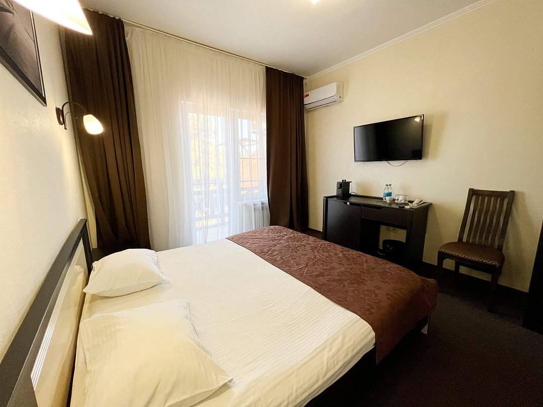 В номере двуспальная кровать, прикроватные тумбочки, шкаф, стул, телевизор, холодильник, капсульная кофемашина, чайник, телефон, фен туалетные принадлежности, халат, тапочки, полотенца.