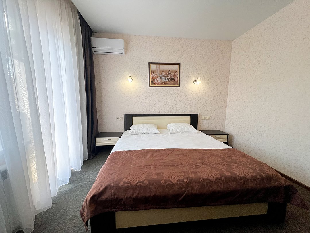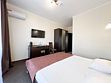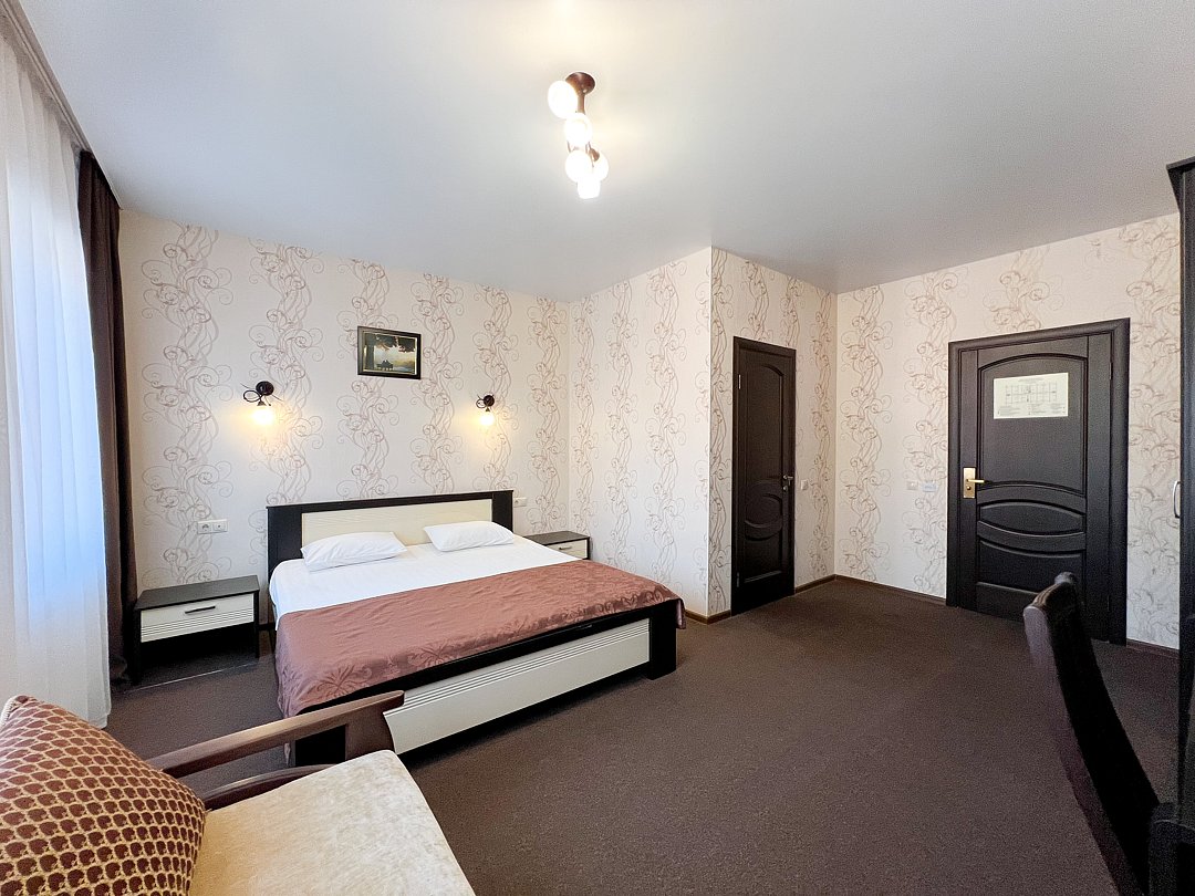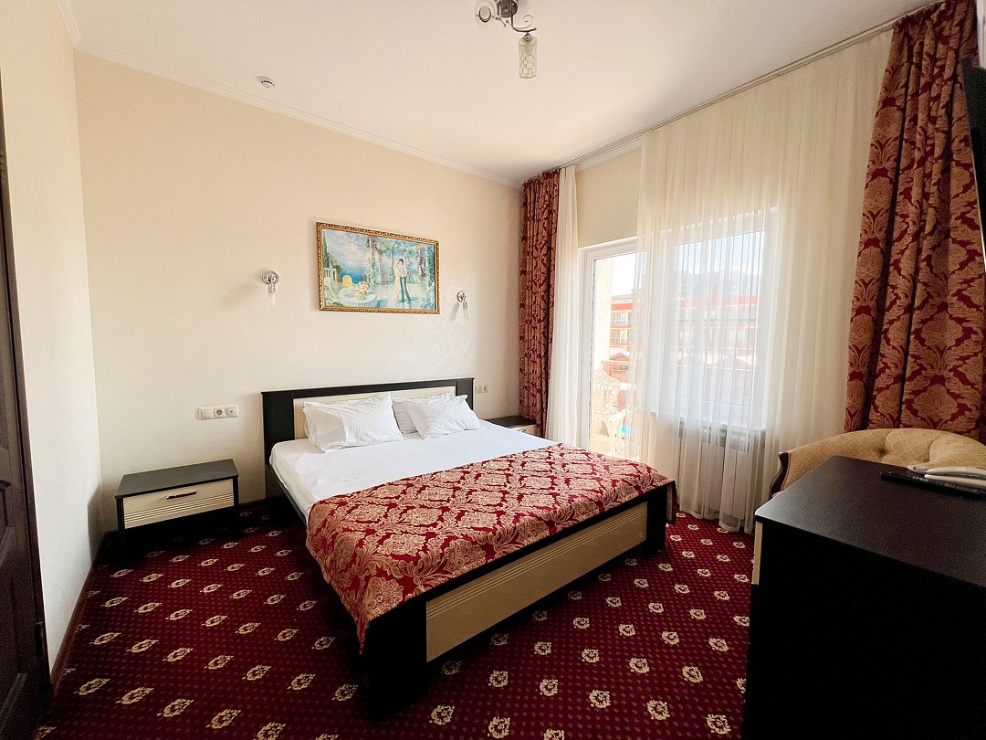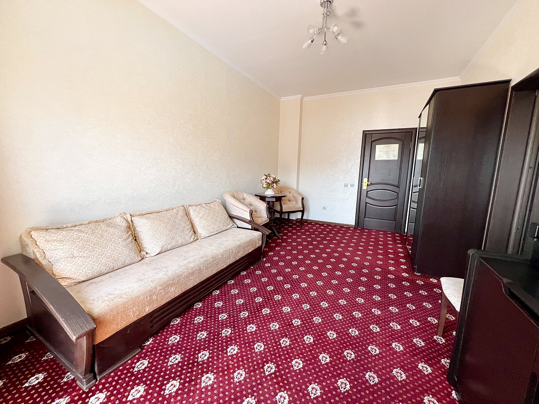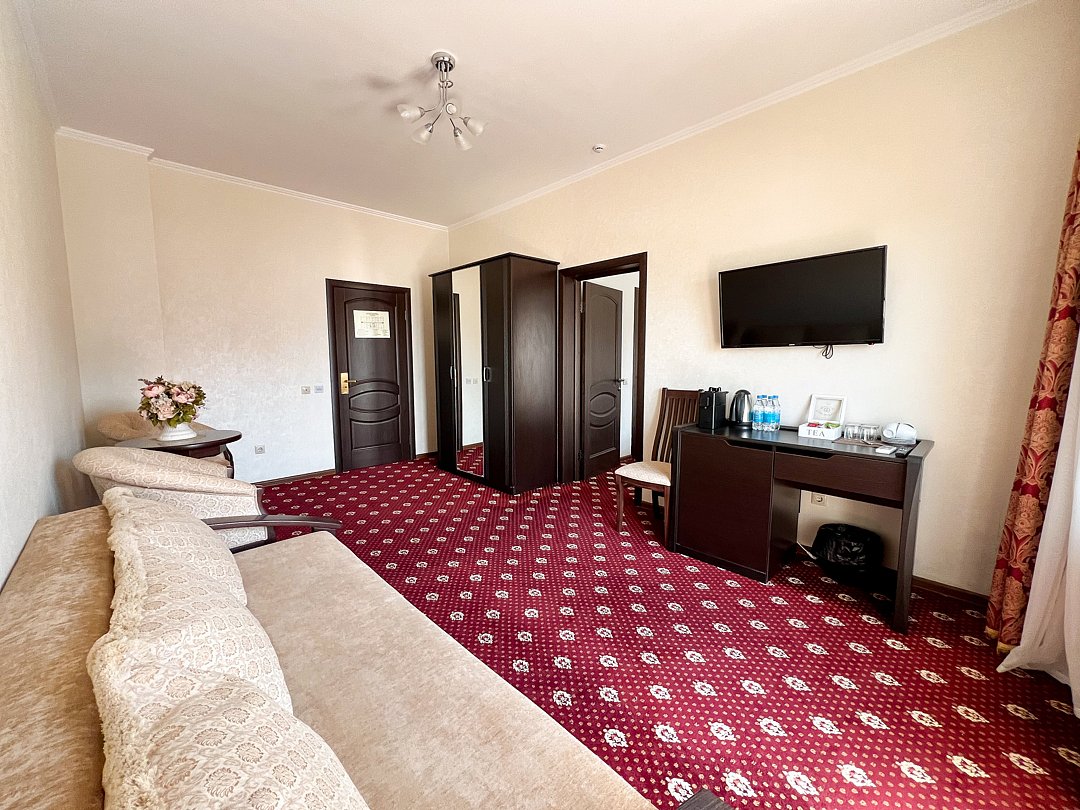 В номере двуспальная кровать, диван-кровать, , прикроватные тумбочки, шкаф, стул, трюмо, чайная подстанция с посудой и чаем, телефон, туалетные принадлежности, халат, тапочки, полотенца.