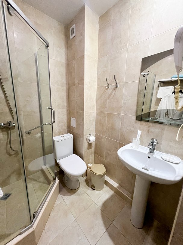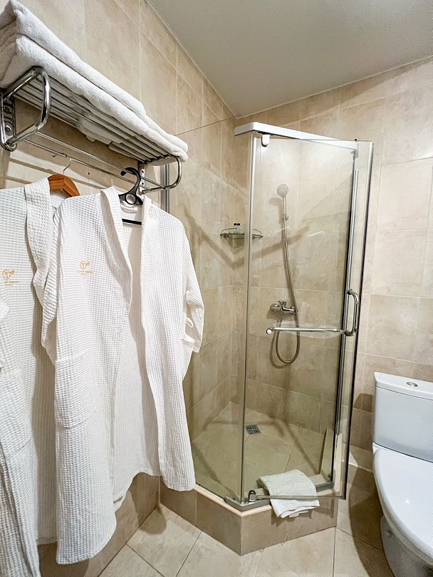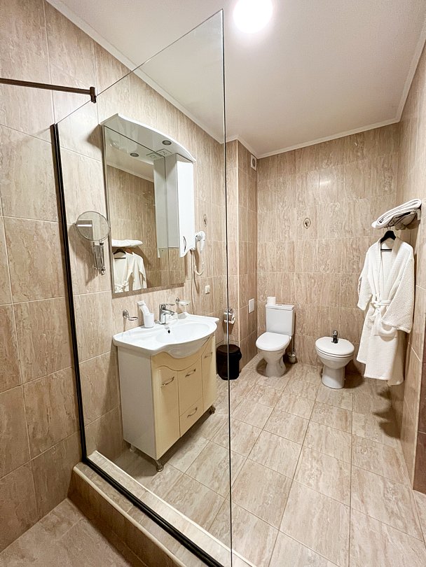 В номере две раздельные кровати, прикроватная тумбочка, шкаф, стул, телевизор, холодильник, чайник, телефон, фен туалетные принадлежности, халат, тапочки, полотенца. На балконе мебель.