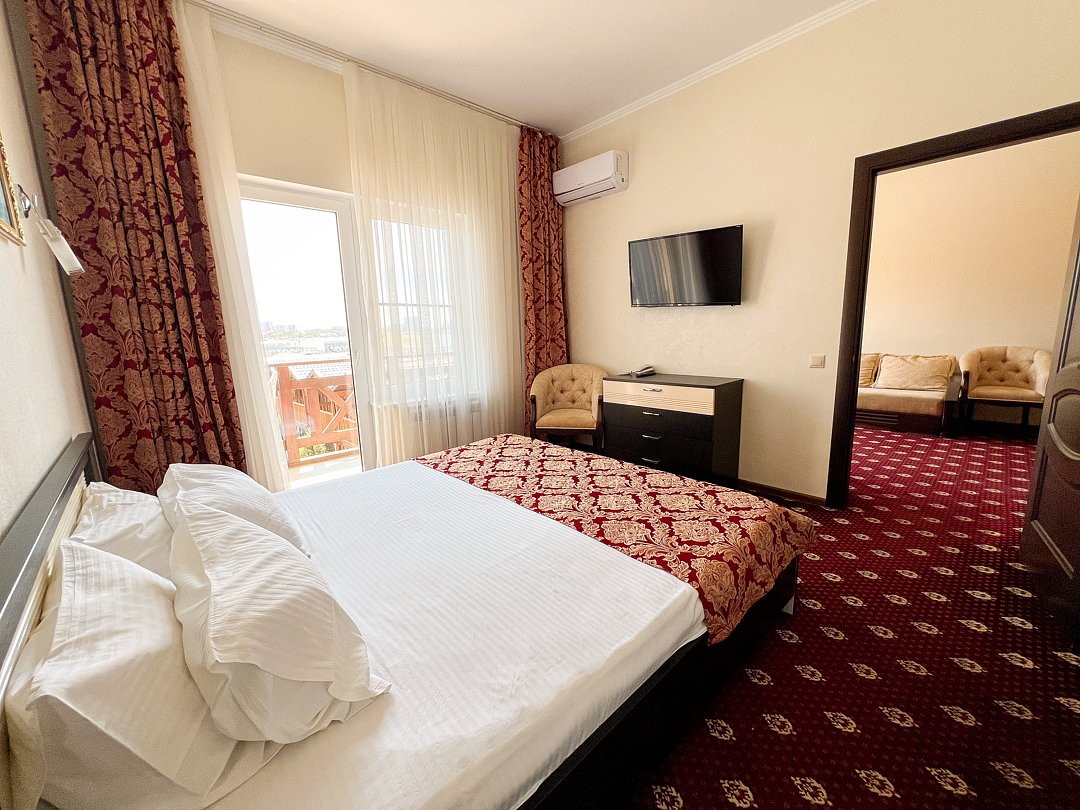 В номере двуспальная кровать, раскладной диван, прикроватные тумбочки, шкаф, стул, телевизор, холодильник, чайник, телефон, фен туалетные принадлежности, халат, тапочки, полотенца.