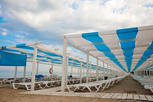 Дорога к морю проходит через тенистую аллею, закрывающую гостей отеля от палящего южного солнышка. На пляже вас ждут большие деревянные навесы от солнца и удобные шезлонги. Есть кабинки для переодевания.