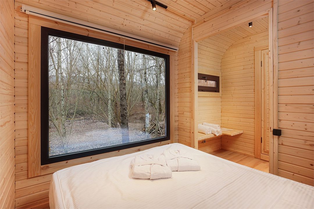 - Домики оборудованы премиальными кроватями Queen size, панорамными окнами, которые при желании превращаются в кинотеатр (каждый номер оснащен проектором).