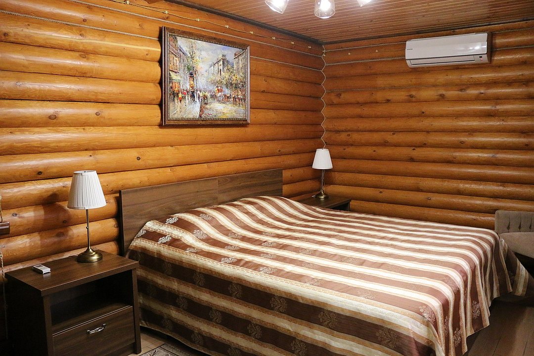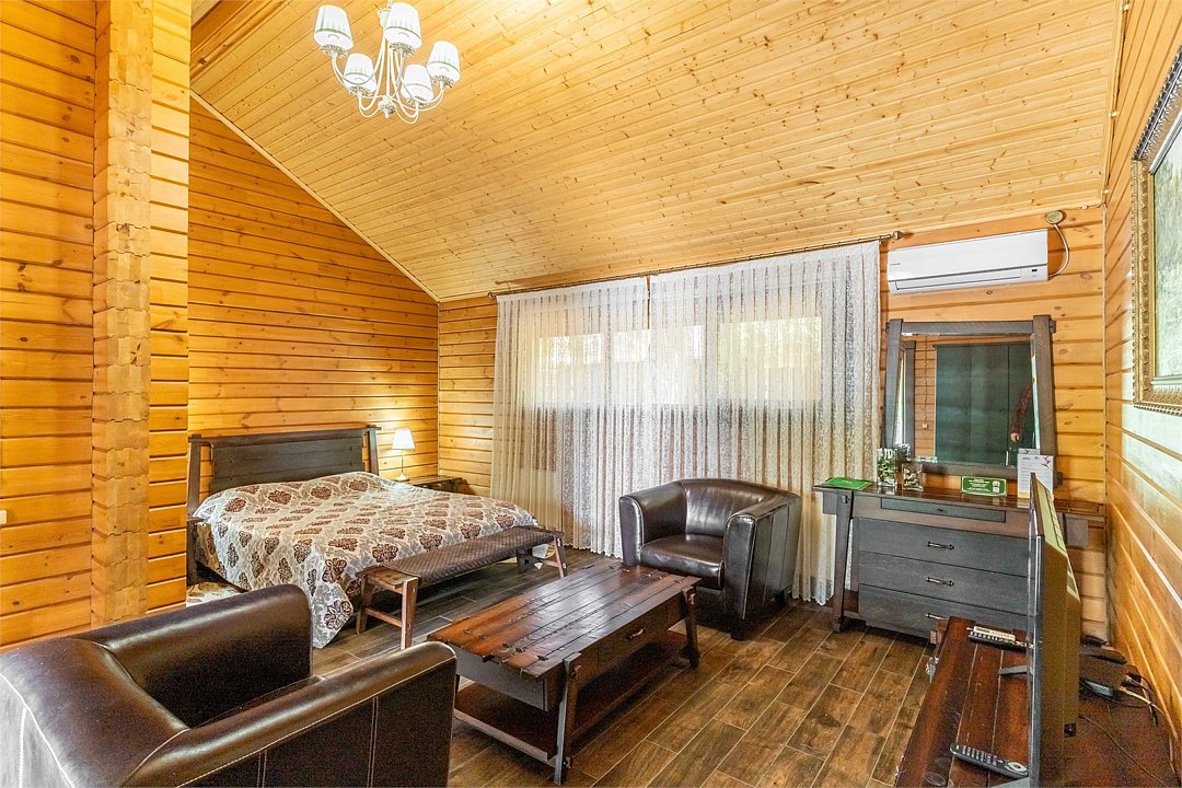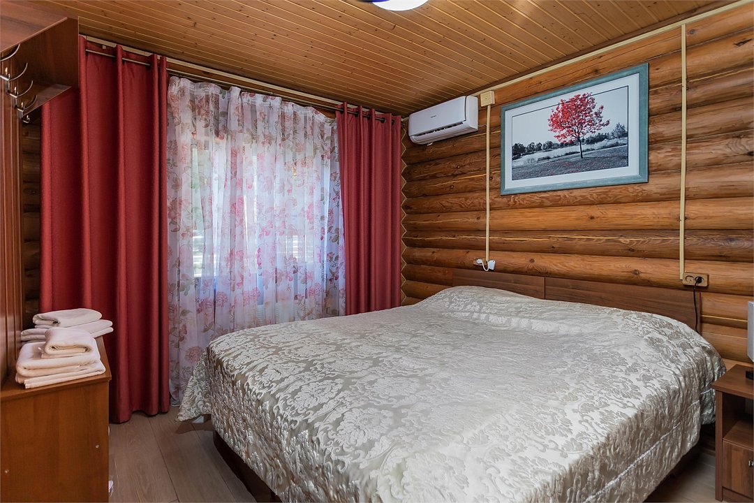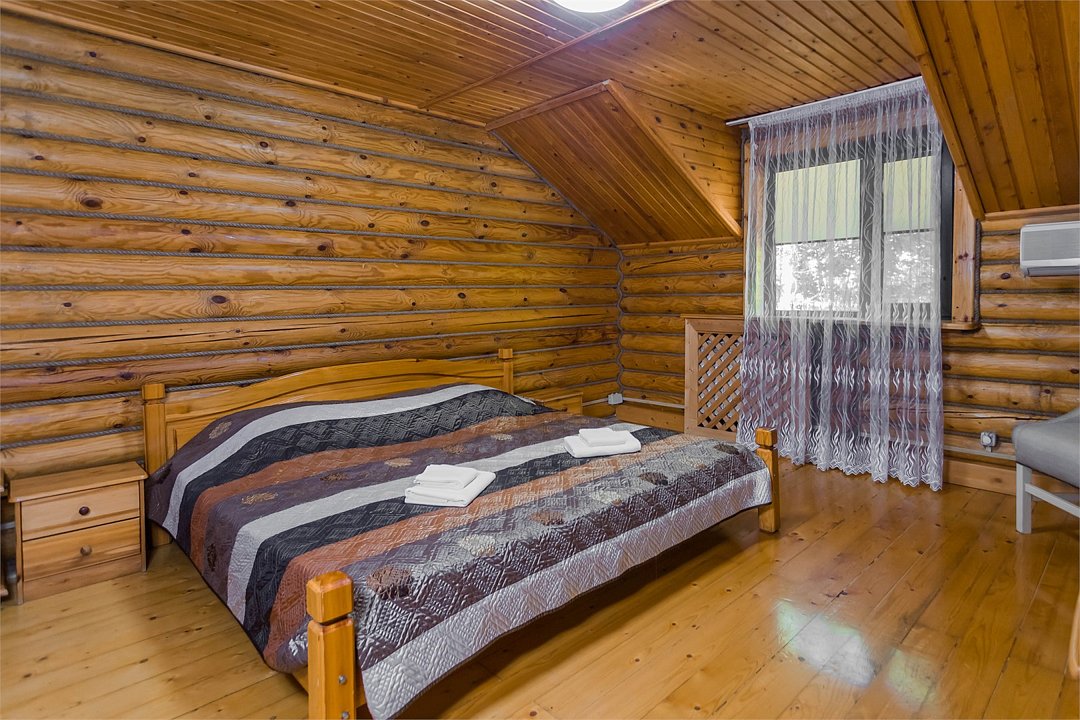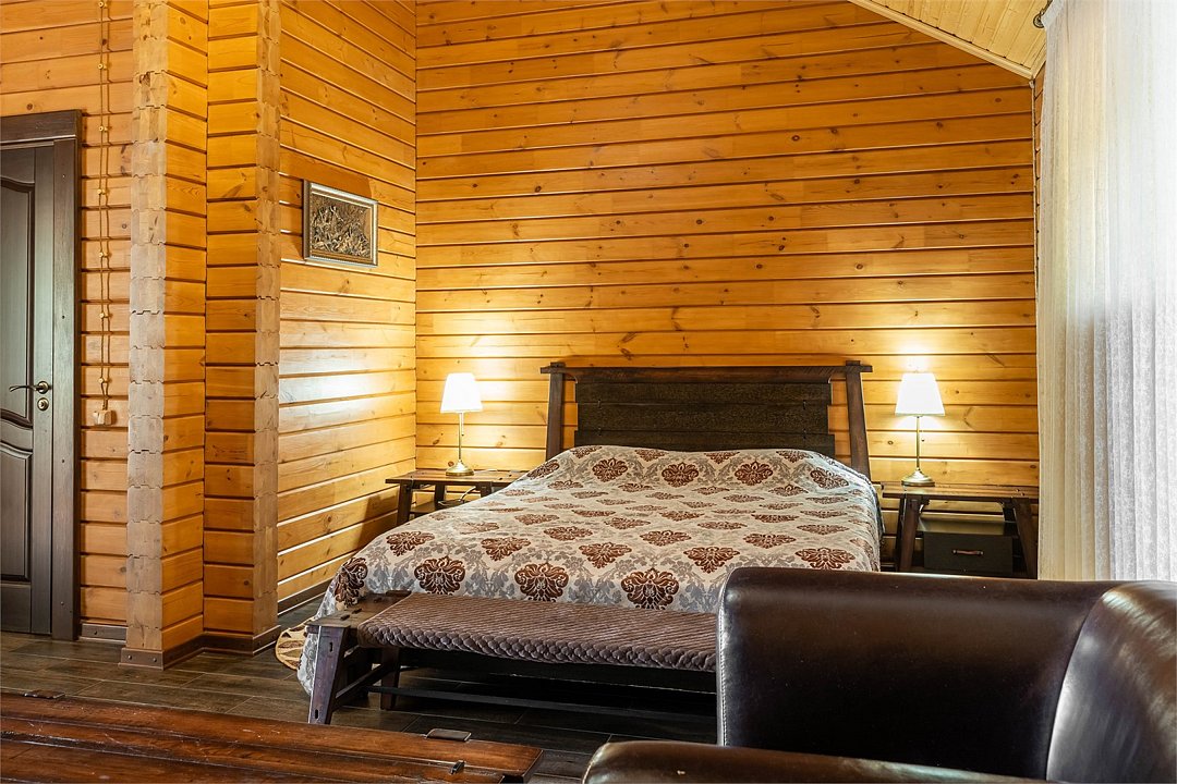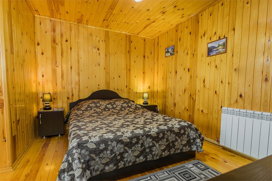 Большие кровати позволяют прекрасно выспаться и набраться сил вдали от шумного города. Деревянный декор стен создает атмосферу тепла и уюта.
