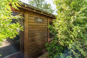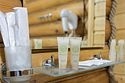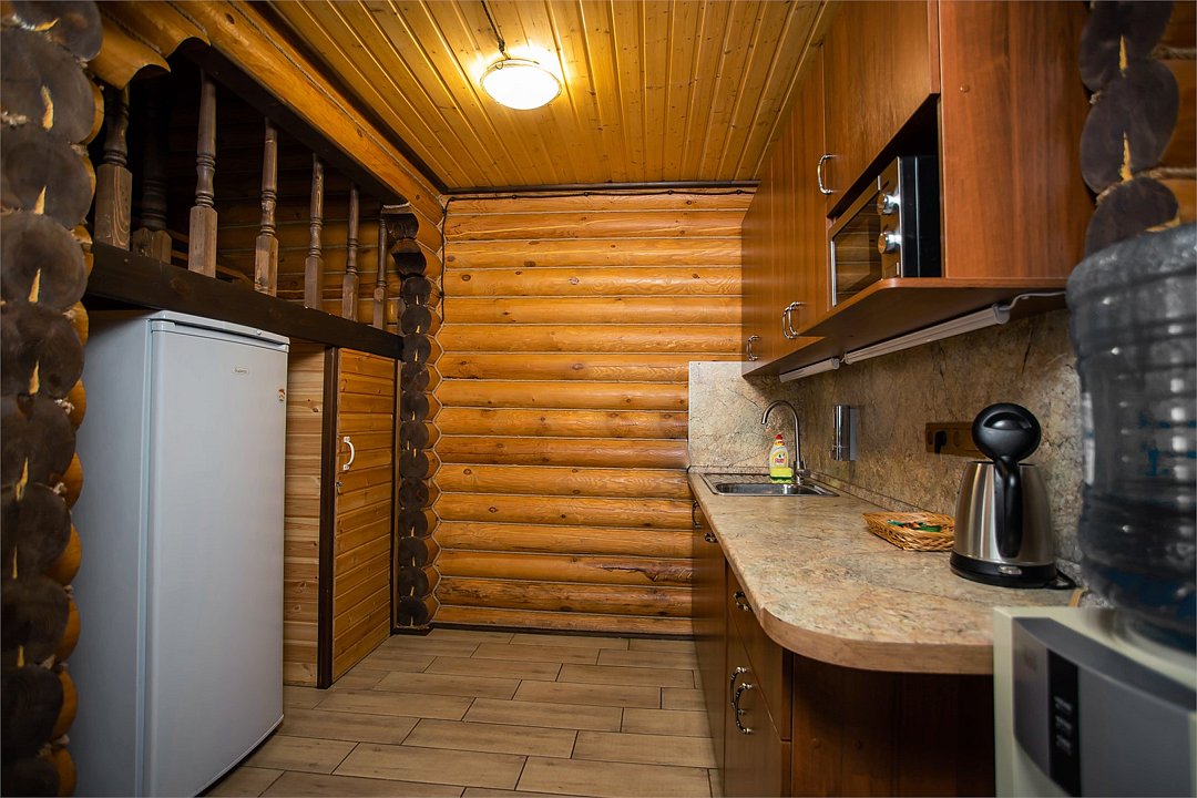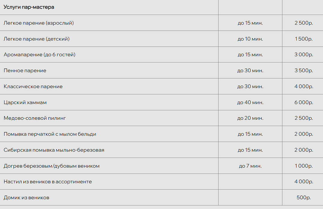 Комплекс располагает просторной парной на десять человек с регулируемым тепловым режимом от 60 °C, хаммамом для длительного прогревания, купелью с минеральной артезианской водой для контрастного закаливания, гостевым залом для дружеских посиделок и широкой верандой с удобными лежаками для отдыха на свежем воздухе.
