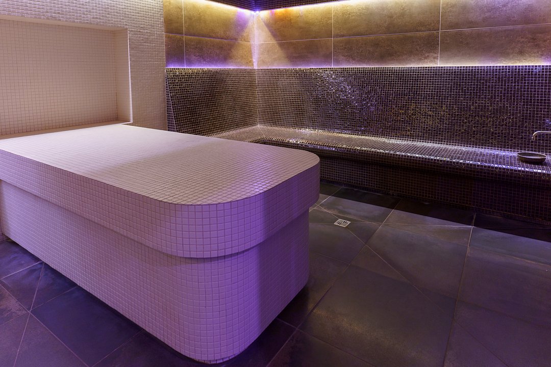 Для тех, кто предпочитает мягкое прогревание, предусмотрен хаммам с влажностью 65–70 % и температурой около 35 °C — идеальная среда для пенного массажа и других спа‑процедур.