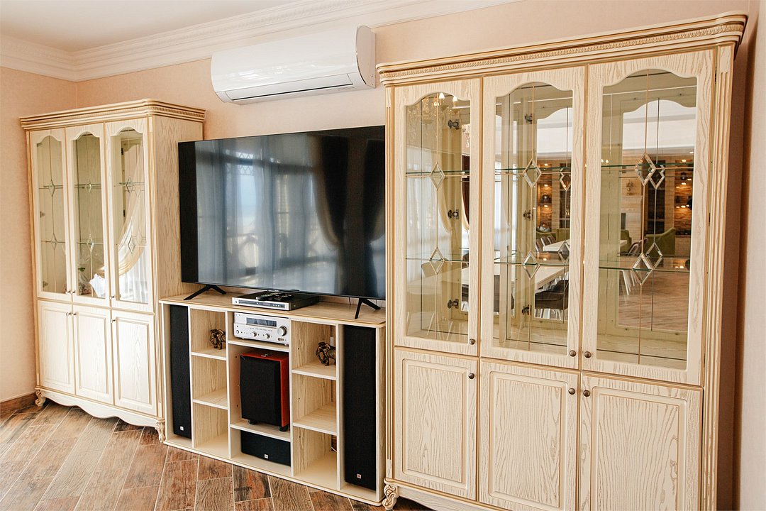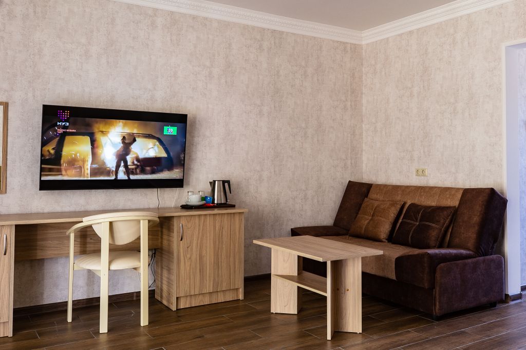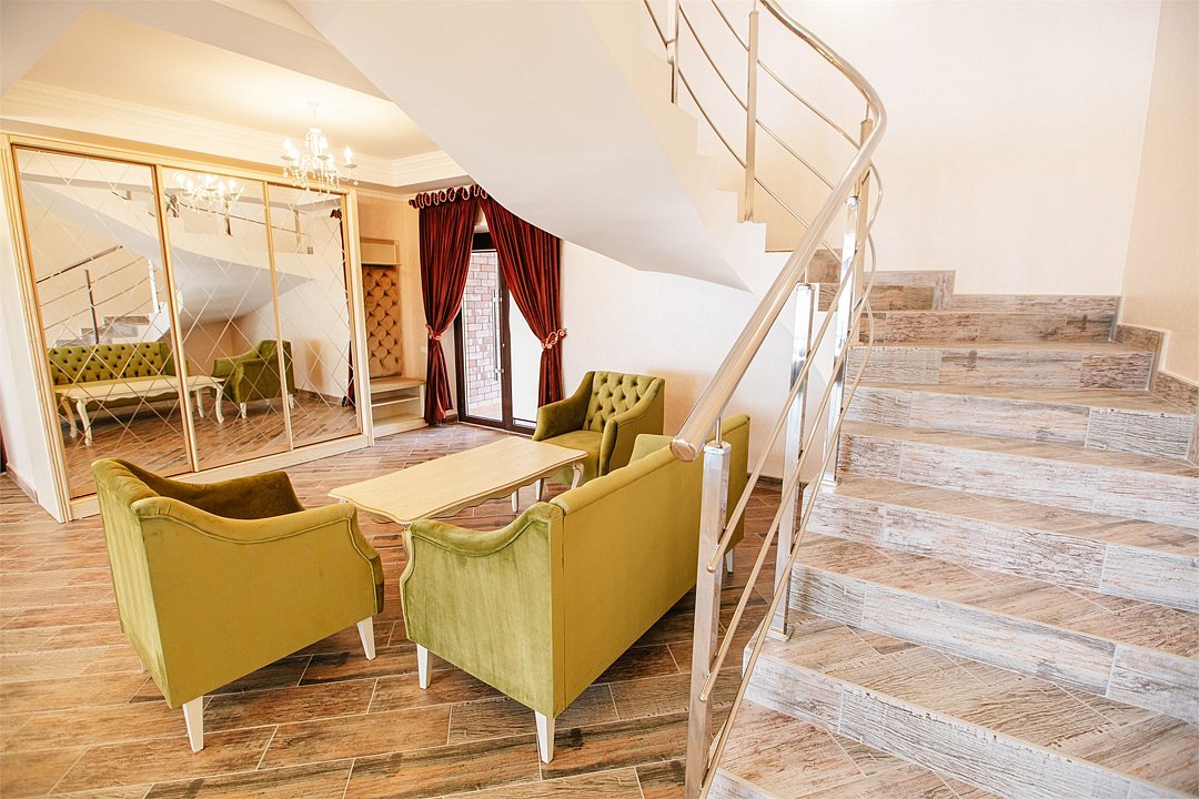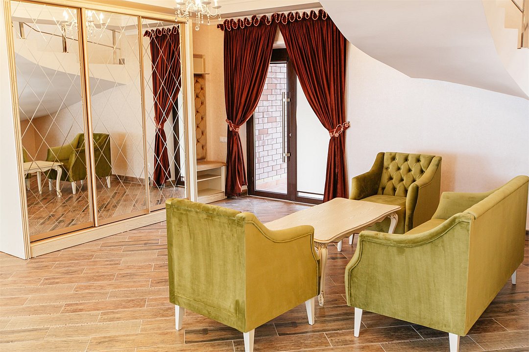 Wi-Fi, фен, душевая кабина, санузел, банные принадлежности, тапочки, терраса, двуспальная кровать, диван, стулья, журнальный столик, зеркало, сейф, отдельный вход в номер, стол, туалет, сплит-система, мини-холодильник, шкаф-купе, гостиничная парфюмерия, телевизор со Smart TV, пуфик, без питомцевВ коттедже