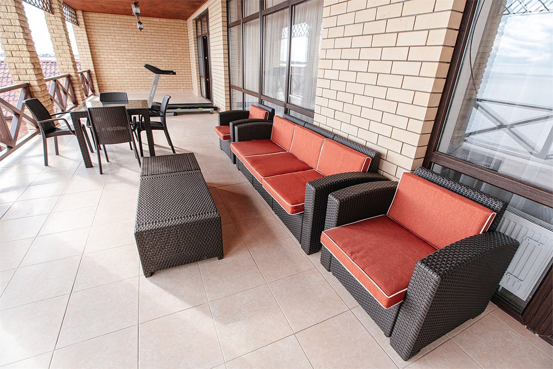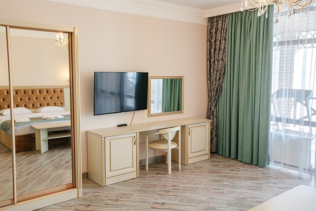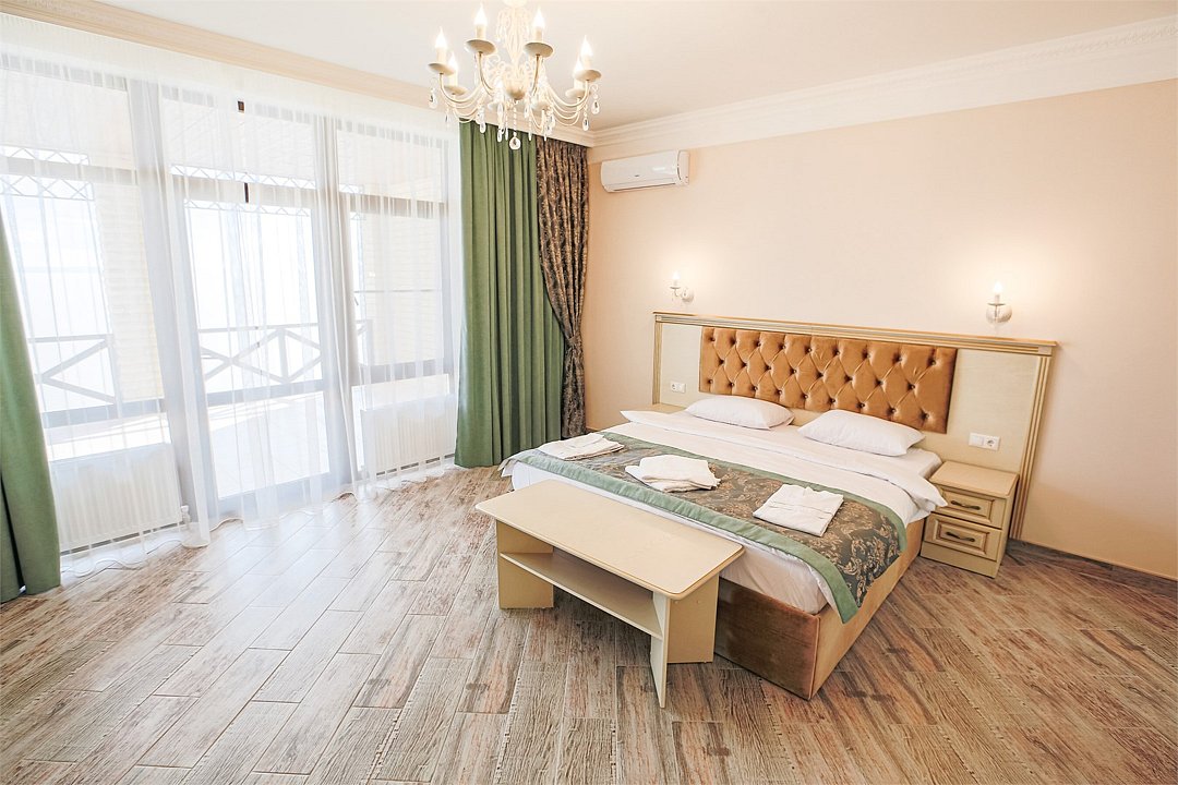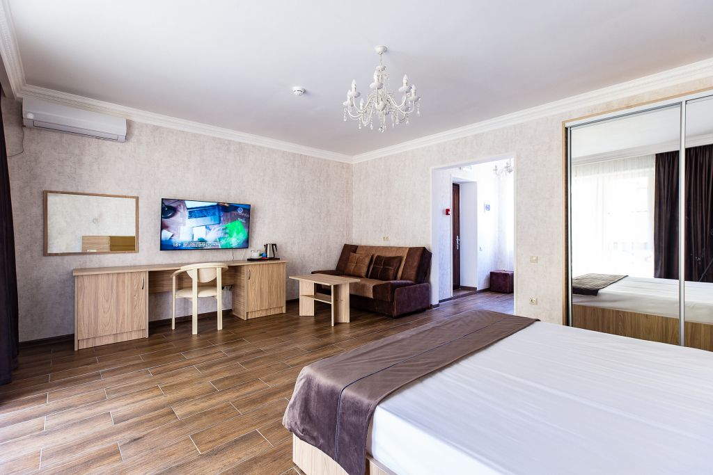 Wi-Fi, фен, душевая кабина, санузел, банные принадлежности, тапочки, гигиенические средства, терраса, двуспальная кровать, диван, стулья, зеркало, сейф, отдельный вход в номер, вид на сад, вид во двор, стол, туалет, сплит-система, мини-холодильник, москитная сетка, шкаф-купе, гостиничная парфюмерия, телевизор со Smart TV, пуфик, общественный бассейн, онлайн-регистрация до заезда, без питомцевВ коттедже