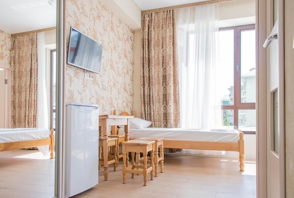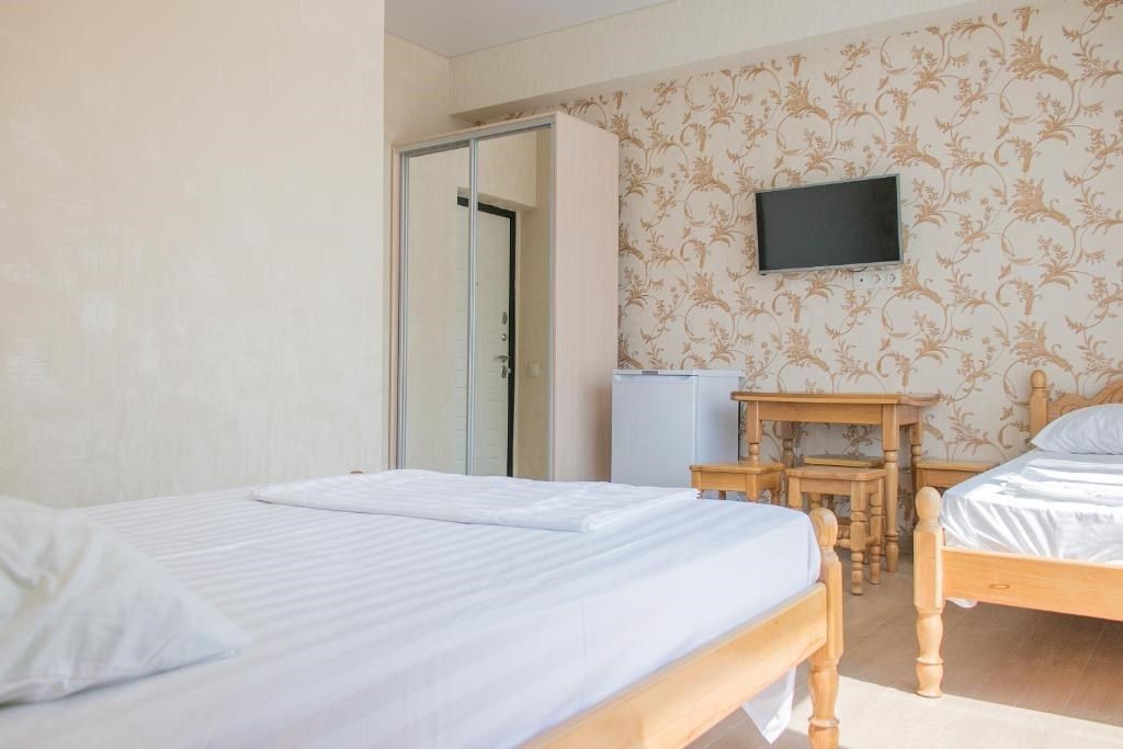 телевизор, Wi-Fi, холодильник, кондиционер, двуспальная кровать, две односпальные кровати, тумбы, шкаф для одежды, вешалки, зеркало, общая ванная комната, вид во двор, тумба, санузел на этаже, сплит-система, цифровое тв, телевизор с плоским экраном, душ на этаже, телевизор со Smart TV, номер для некурящих, уборка номера, вешалки-плечики, частный двор, без питомцев, бассейнВ гостиничном номере