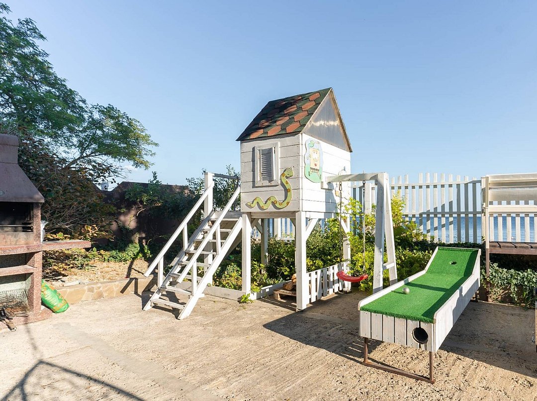 На территории: своя парковка под видеонаблюдением (на четыре-пять автомобилей), свой двор, территория комплекса огорожена, беседка и три мангальные зоны с мебелью и мангалами (обычный мангал, круглый голландский мангал, также есть решетки, шампуры), обеденная зона расположена прямо у самого входа в коттедж, зоны с вечерним освещением, кресла-коконы, качели, лавочка с барным столиком и видом на море, идеально встречать рассвет с чашечкой кофе и закат с бокалом, игровая площадка для детей: детские качели, детский домик, лазалка, песочница, баланс борд, шезлонги, подогреваемая купель.