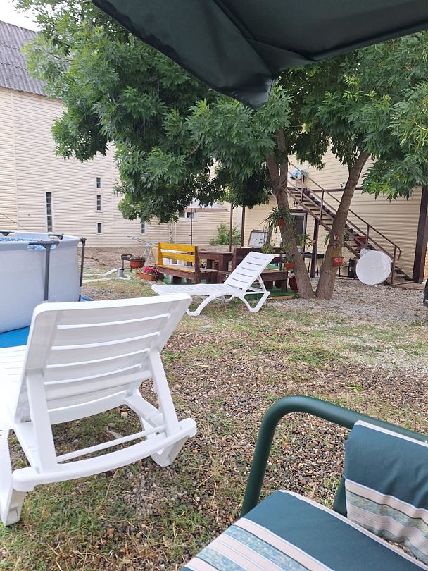 Отдельный коттедж с собственной ванной комнатой и кухней. Во дворе бассейн и шезлонги, мангал и беседка.