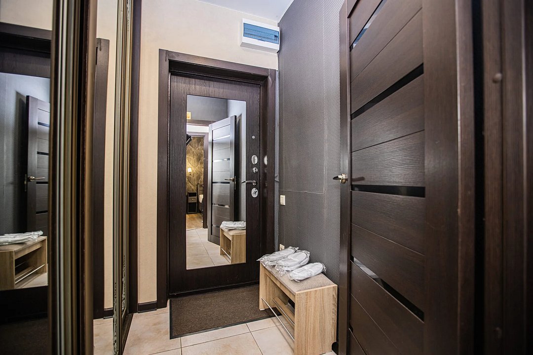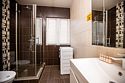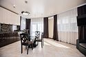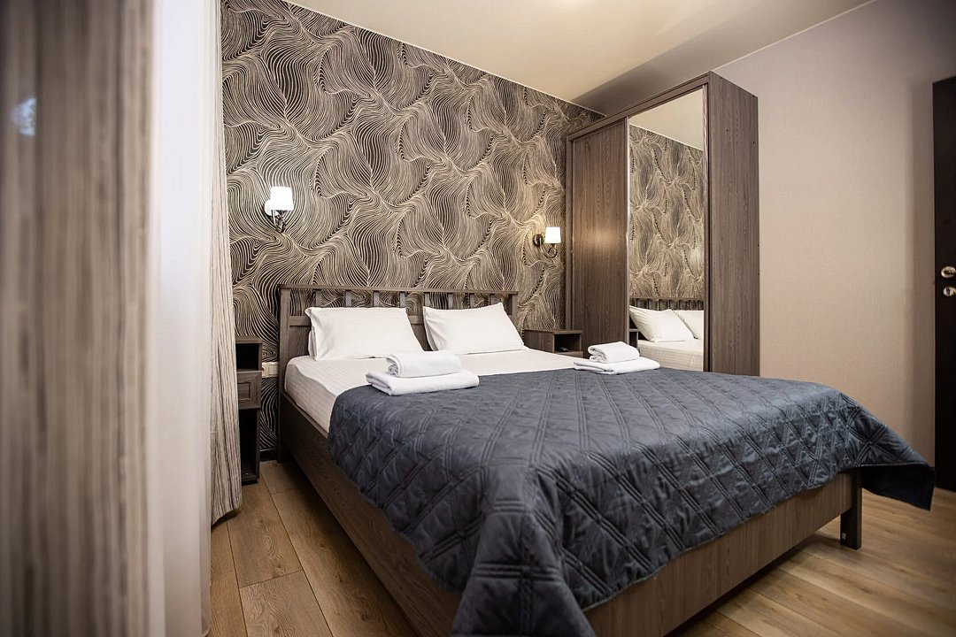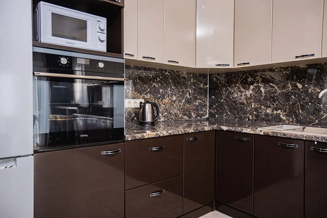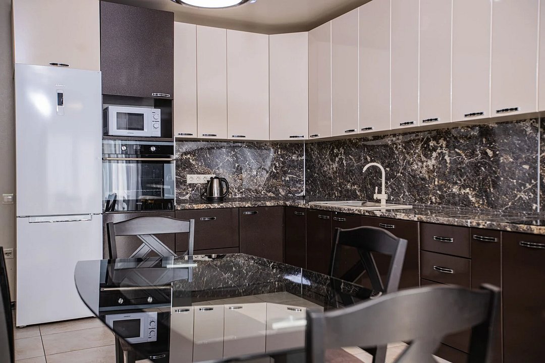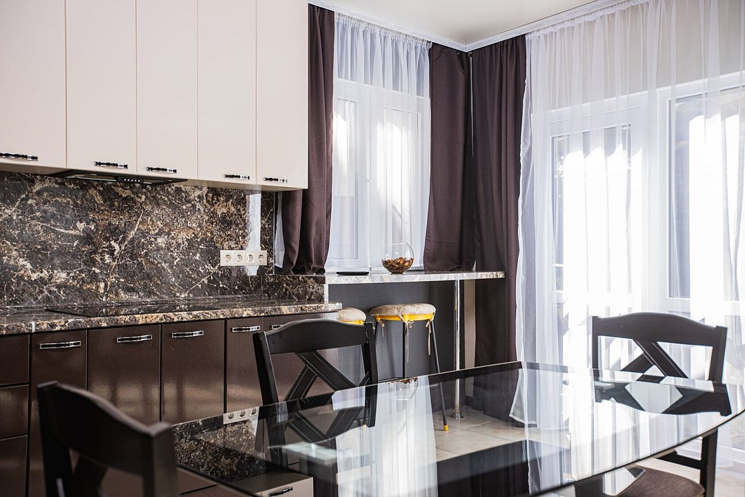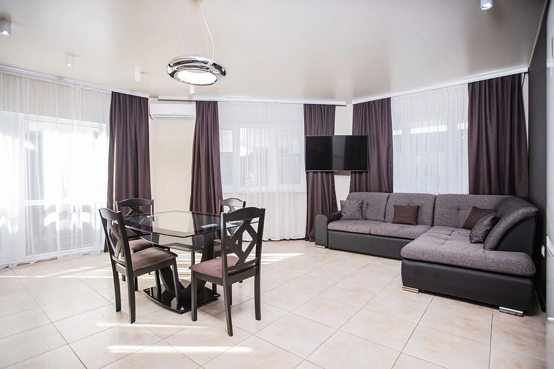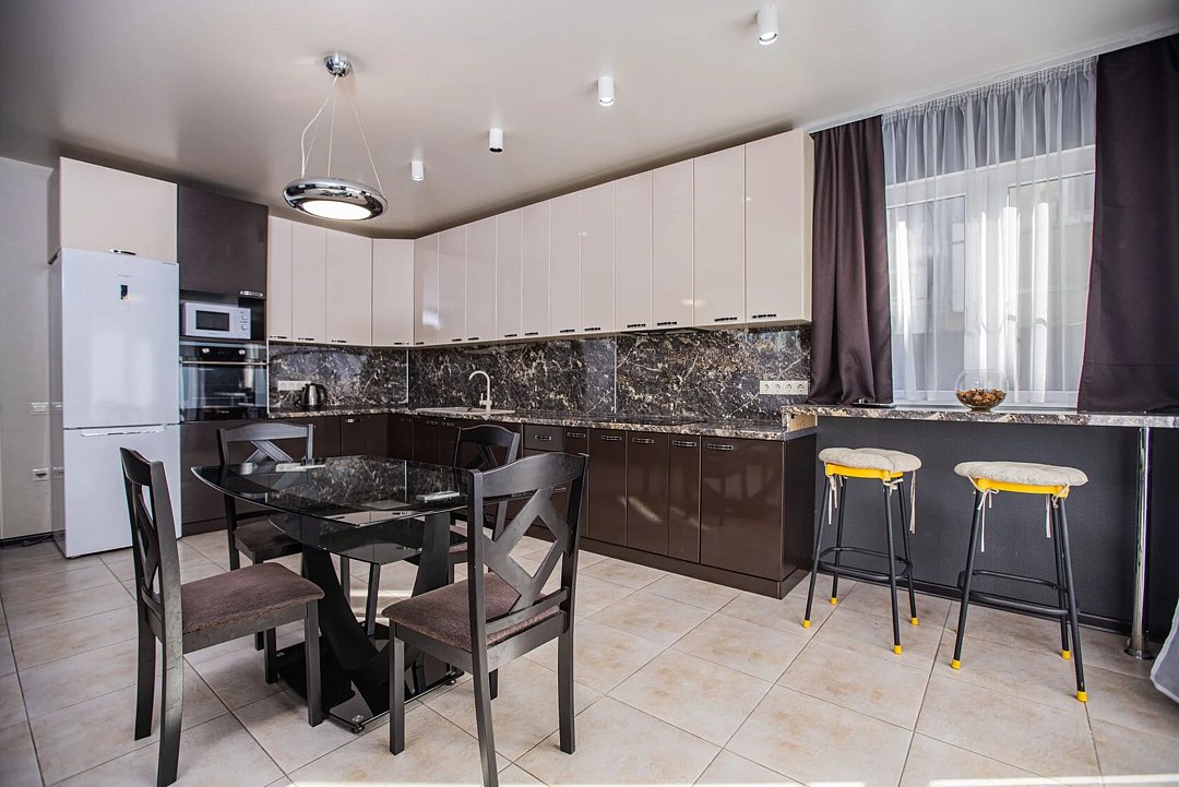 Коттедж имеет 2 этажа. На 1 этаже: кухня-гостиная: панорамное остекление, большой угловой диван, большой телевизор, кондиционер, обеденный стол. Оснащение: посудомоечная машина, плита, духовой шкаф, электрогриль, СВЧ печь, чайник, большой холодильник. Имеется вся необходимая посуда, столовые приборы, кухонная утварь. На первом этаже расположена спальня с большой двуспальной кроватью размером king-size, кондиционером, телевизором и шкафом. Санузел с душевой кабиной и стиральной машиной. На 2 этаже: 3 спальни, 2 санузла с душевой кабиной, туалетом, стиральной машиной. 1 спальня: оснащена двуспальной кроватью, кондиционером, телевизором и шкафом. 2 спальня: оснащена двуспальной кроватью, телевизором, комодом, кондиционером. 3 спальня: оснащена двуспальной кроватью, кондиционером, шкафом.