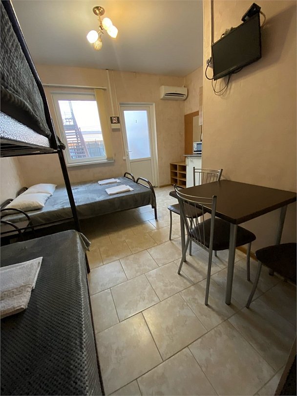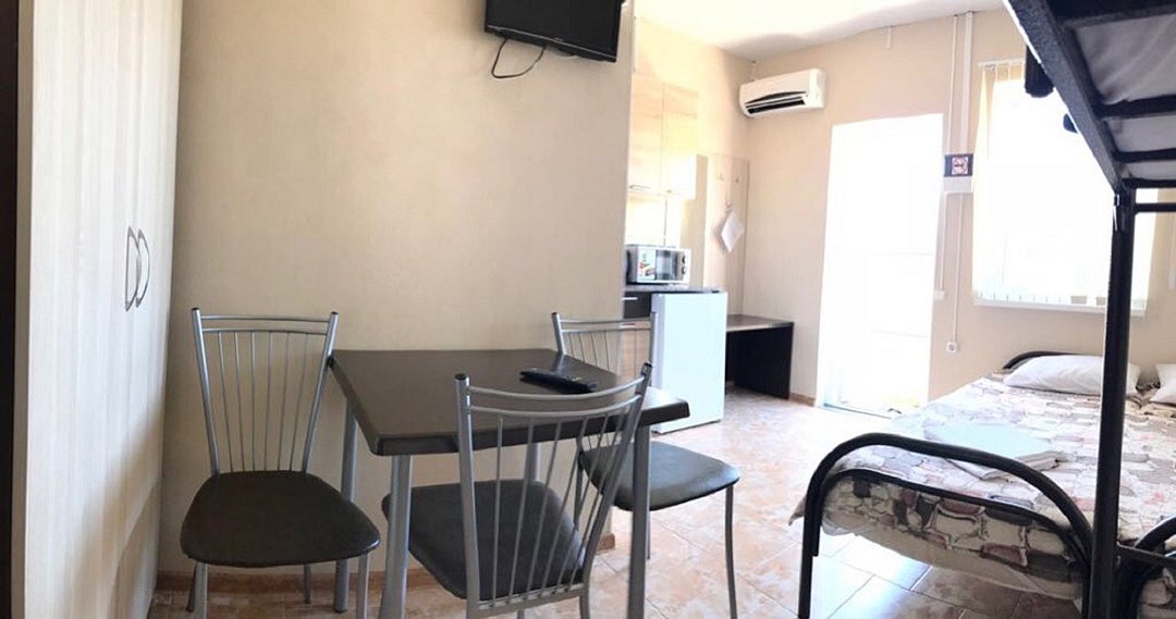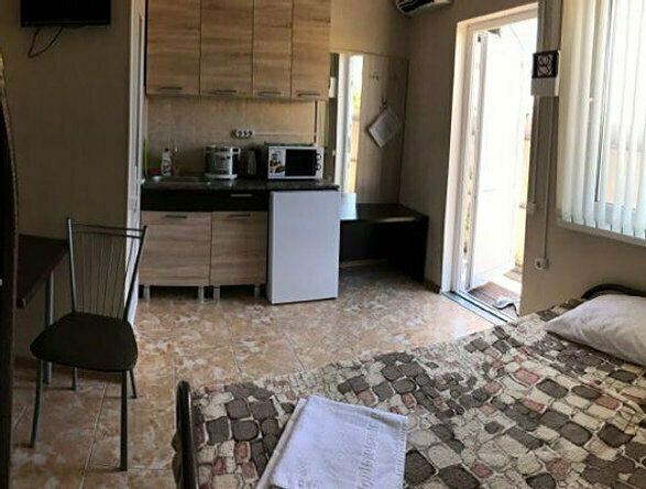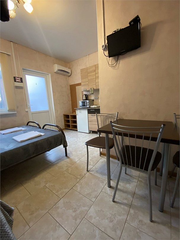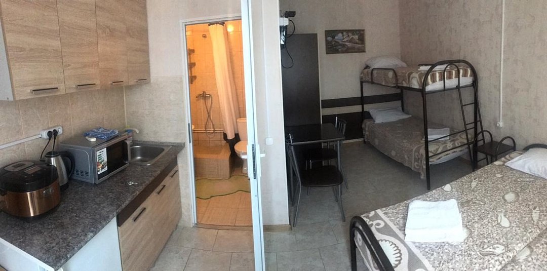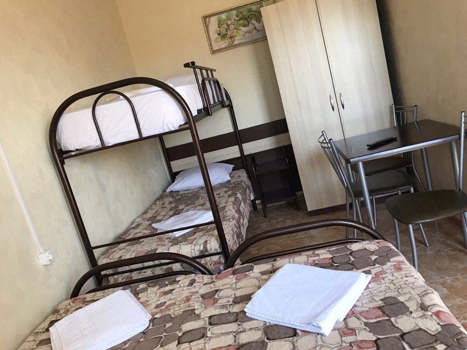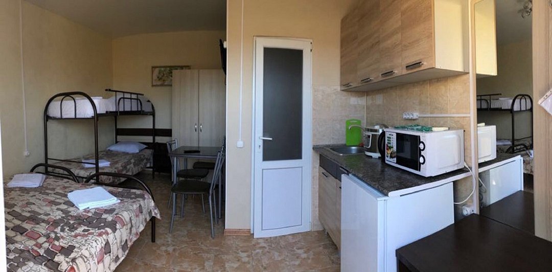 Очень удобный, отдельный четырёхместный номер Комфорт с мини-кухней, находится на первом этаже, вход свой отдельный из внутреннего закрытого дворика, вместимость - 4 спальных места, при входе в номер своя индивидуальная зона отдыха - стол, стульчики, беседочка с виноградной лозой, сушилка для одежды. В номере кровать двуспальная(есть вариант две односпальные кровати) и одна двухъярусная, мини-кухня со всем необходимым инвентарём, мультиварка, микроволновка, электрочайник, холодильник, вся посуда. в номере постельные принадлежности, полотенца банные, пляжные. В номере также свой санузел с душем, кондиционер, телевизор с плоским экраном, обеденная зона, шкаф для одежды. Бесплатный wi-fi.Услуги и удобства