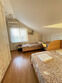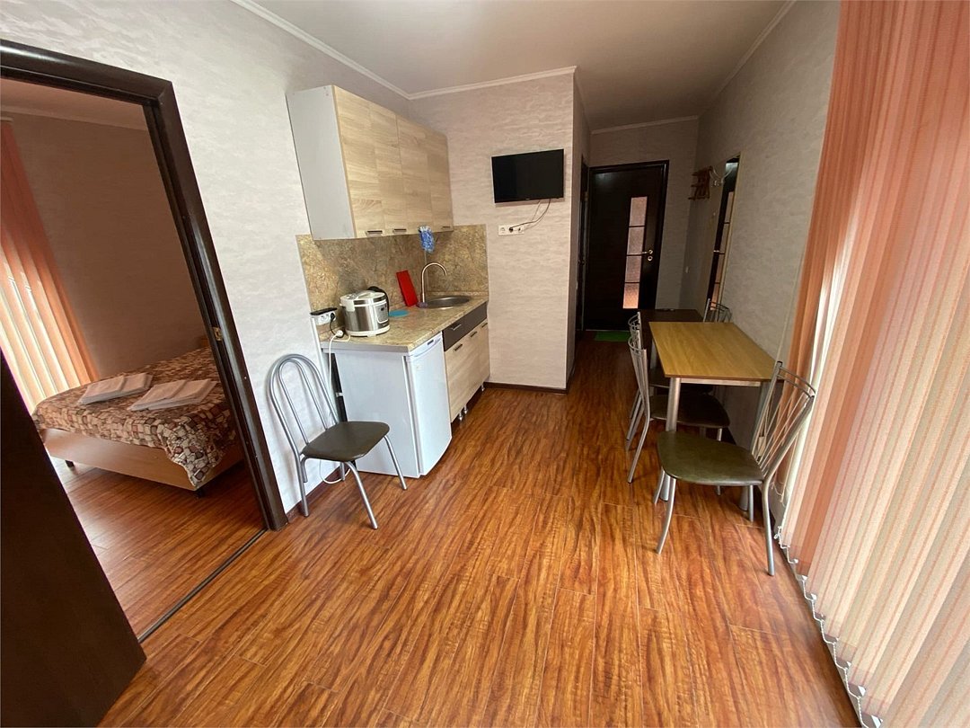 Однокомнатный люкс, находится на втором этаже, деревянного здания, имеет свой балкончик, имеет 4 спальных места, возможно ещё одно дополнительное. Состоит из спальни и ванной комнат, кухня находится в номере. В спальне широкая двуспальная и две односпальная кровать, обеденная зона с мини кухней в номере. Холодильник, кондиционер, телевизор, шкаф для одежды, бесплатный wi-fi. Также в номере есть всё необходимое - полотенца, постельные принадлежности, чайник, мультиварка, фен.Услуги и удобства