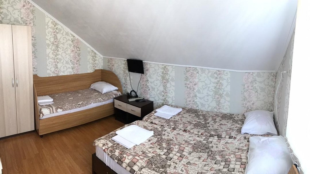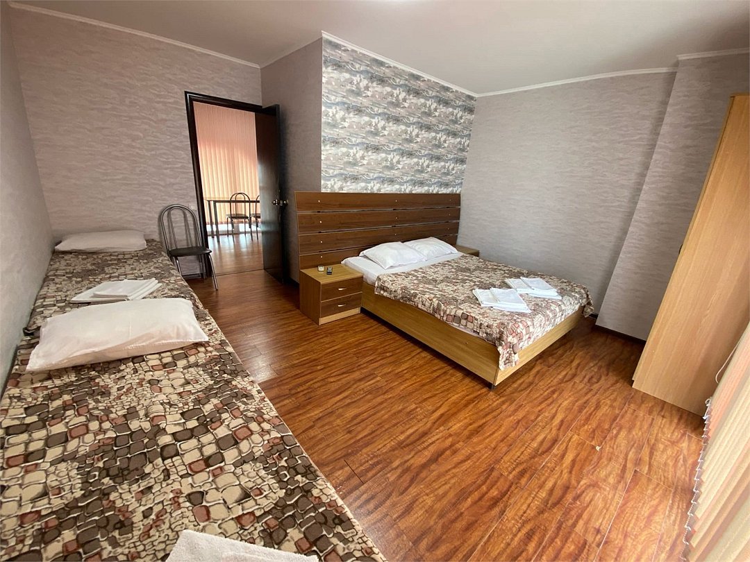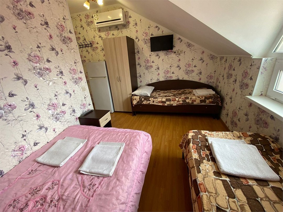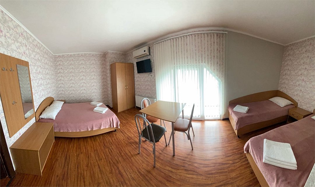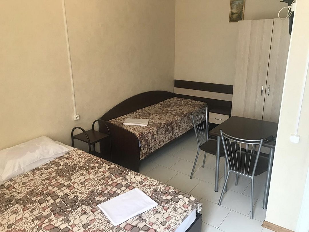 3-местный стандарт - номер находится на 2-м этаже, в номере двуспальная и одна односпальная кровати, либо три односпальные кровати (по выбору), в номере кондиционер, санузел с душем, тв, стол, стулья. Кухня общего пользования. Свой отдельный вход.Услуги и удобства