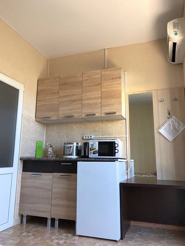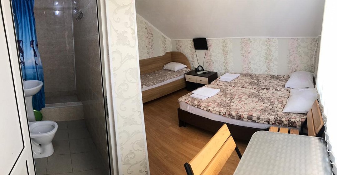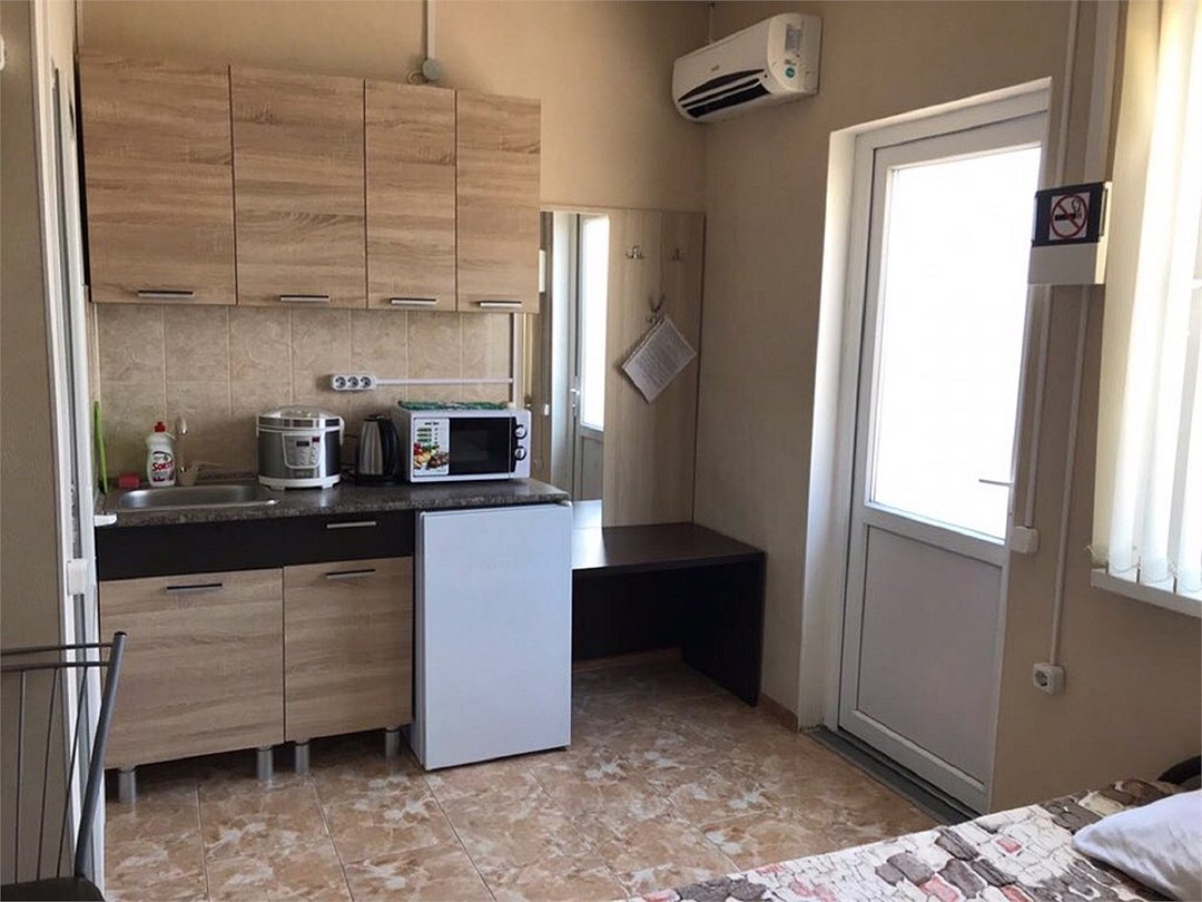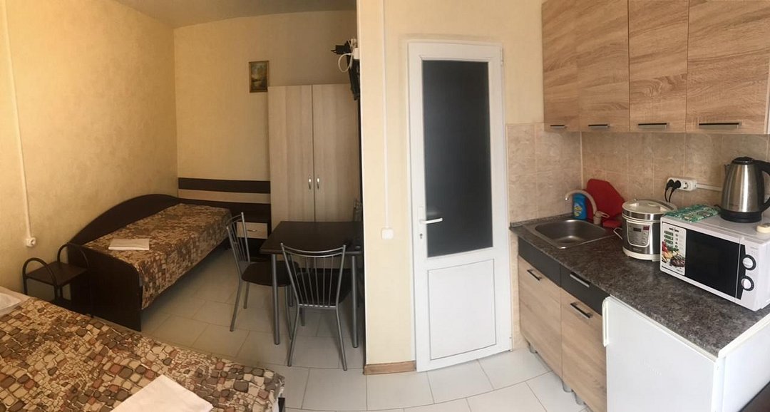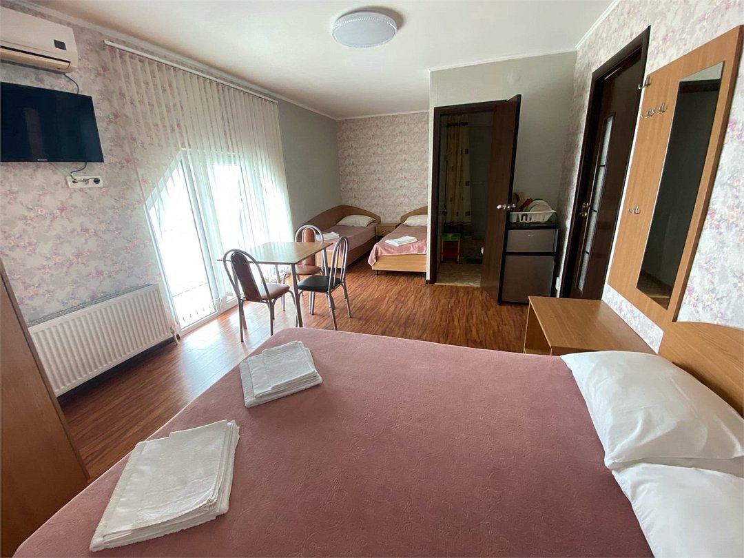 Очень удобный, отдельный трёхместный номер Комфорт с мини-кухней, находится на первом этаже, вход свой отдельный из внутреннего закрытого дворика, вместимость - 3 спальных места, при входе в номер своя индивидуальная зона отдыха - стол, стульчики, своя беседочка с виноградной лозой, сушилка для одежды. В номере кровать двуспальная и одна односпальная кровать, есть вариант из трех односпальных кроватей, мини-кухня со всем необходимым инвентарём, мультиварка, микроволновка, электрочайник, холодильник, вся посуда. в номере постельные принадлежности, полотенца банные, пляжные. В номере также свой санузел с душем, кондиционер, телевизор с плоским экраном, обеденная зона, шкаф для одежды. Бесплатный wi-fi.Услуги и удобства