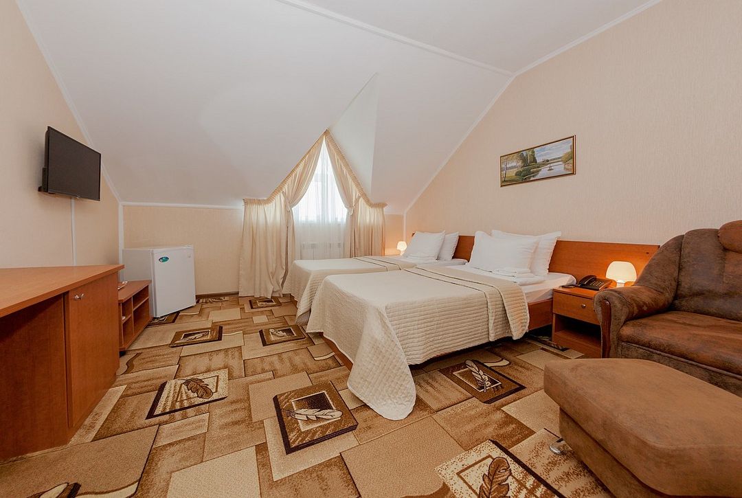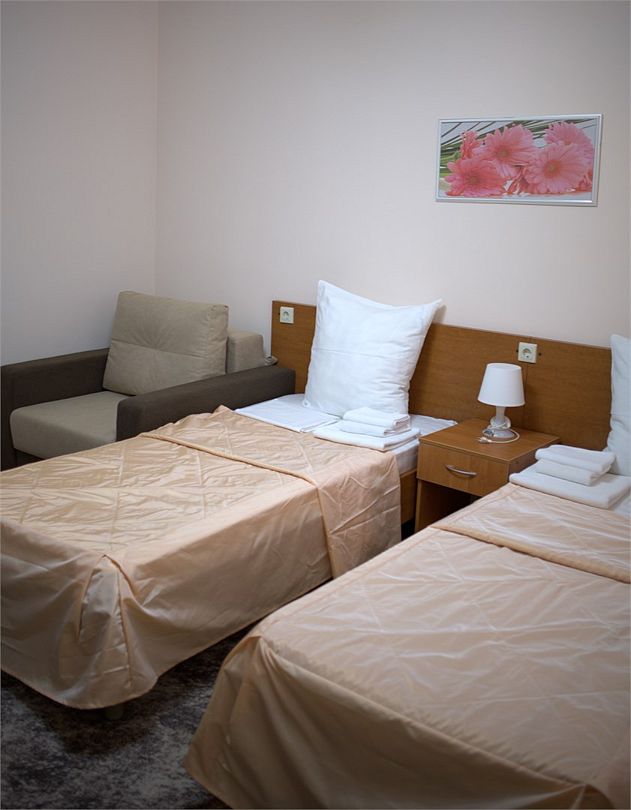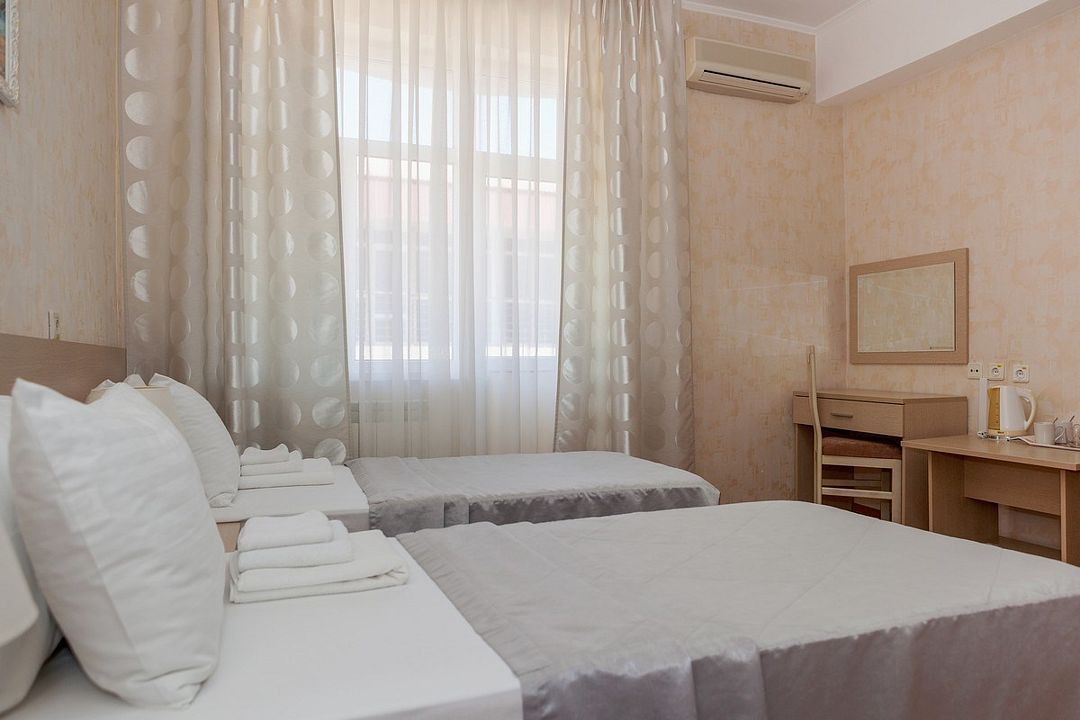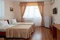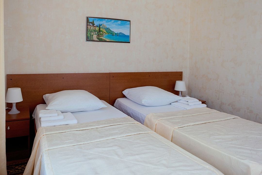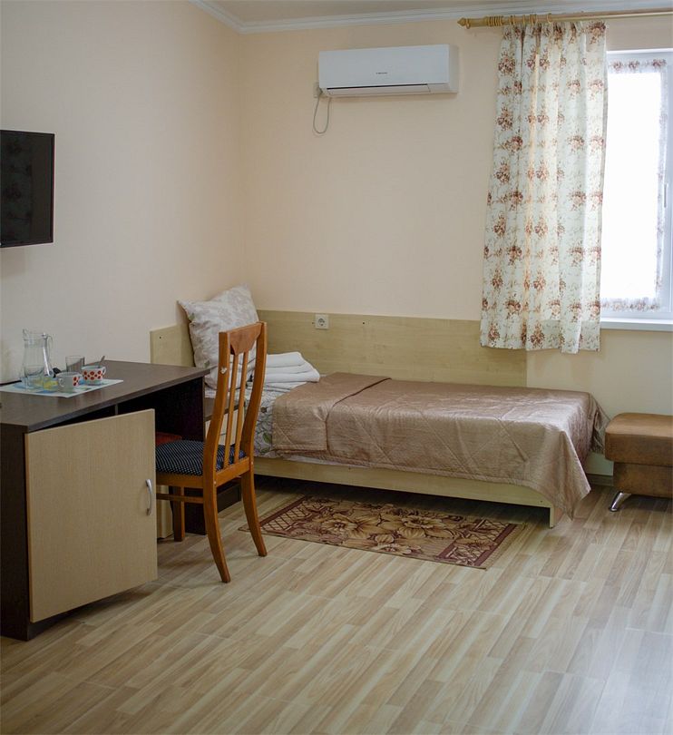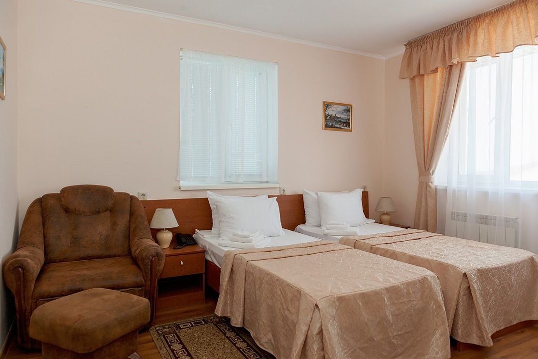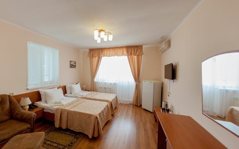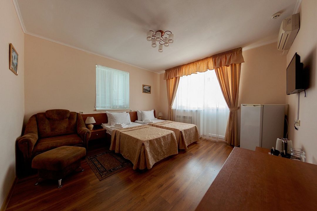 Комфортный однокомнатный стандартный номер без балкона с возможностью размещения до 3-4 человек. Расположены номера в 4 корпусе на цокольном этаже (есть отдельный вход), на мансардном этаже (5 этаж, имеется лифт). Оптимально для отдыха семьи с размещением 1 гостя на кресло-кровати и 4-е дополнительное место на еврораскладушке или детской кроватки. Комплектация номера: две односпальные кровати, кресло-кровать, детская кроватка, сплит-система, холодильник, телевизор, телефон. Санузел: душевая кабина, косметические принадлежности, фен.Услуги и удобства