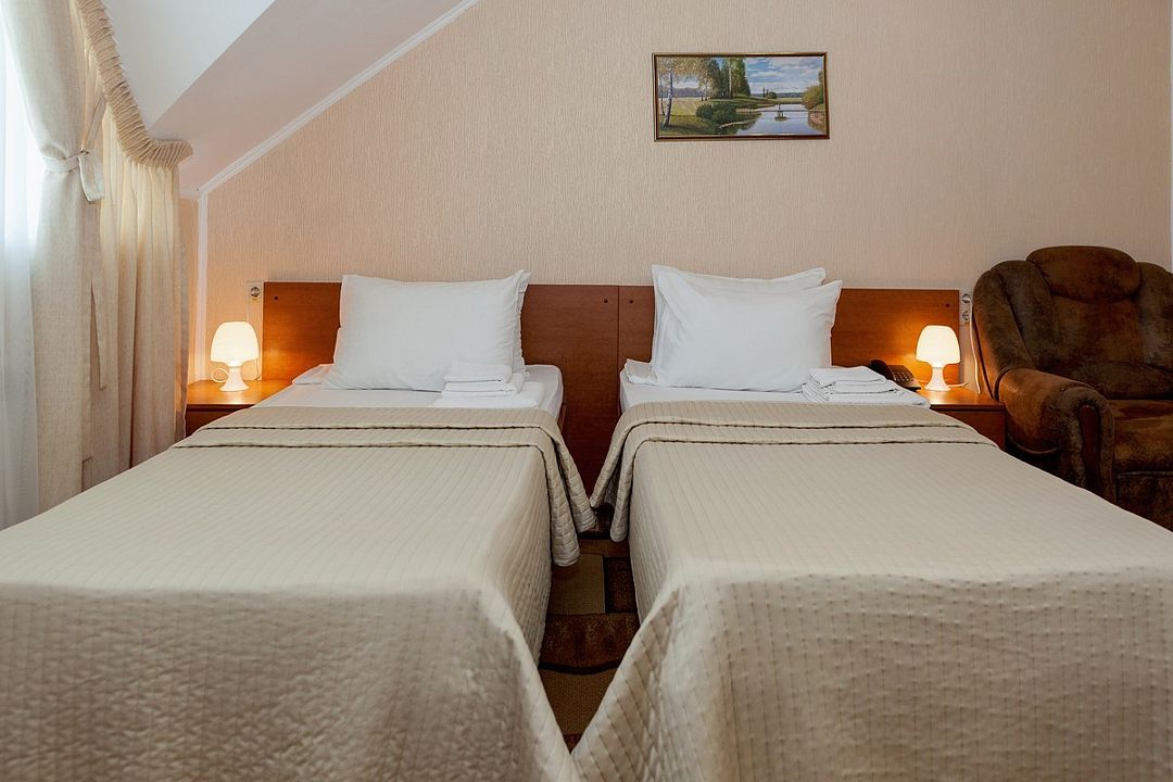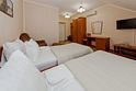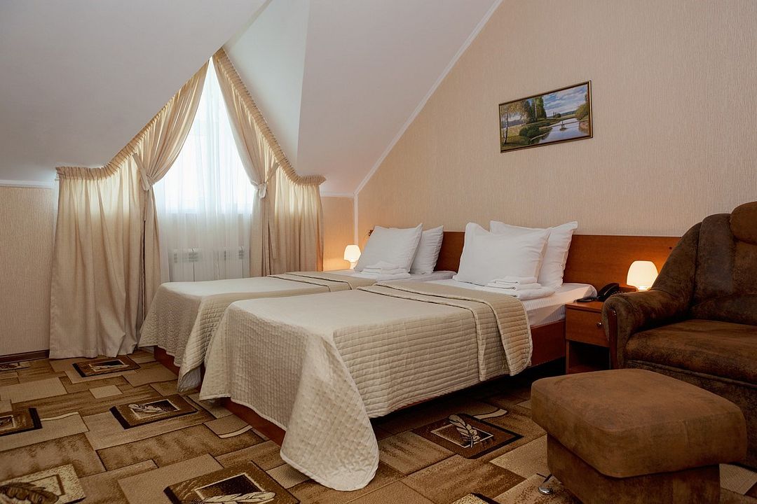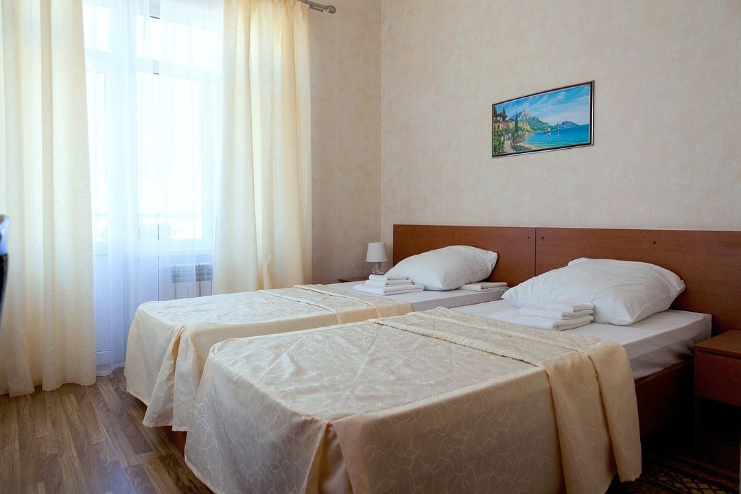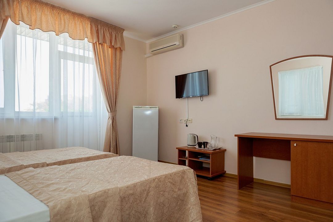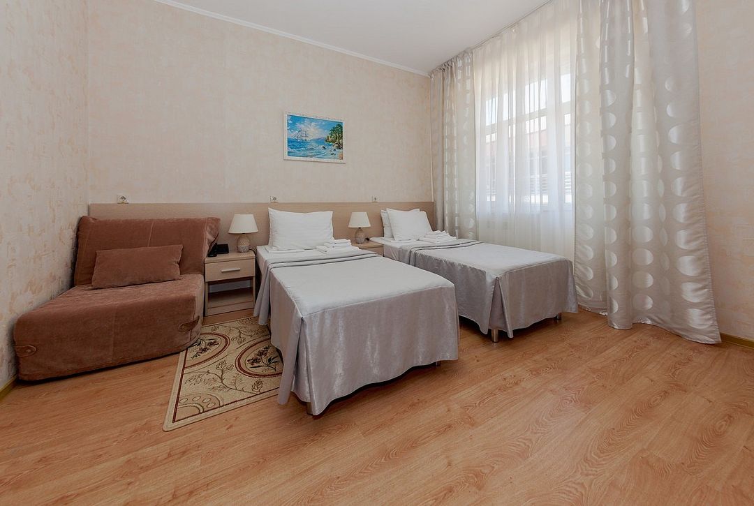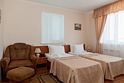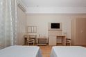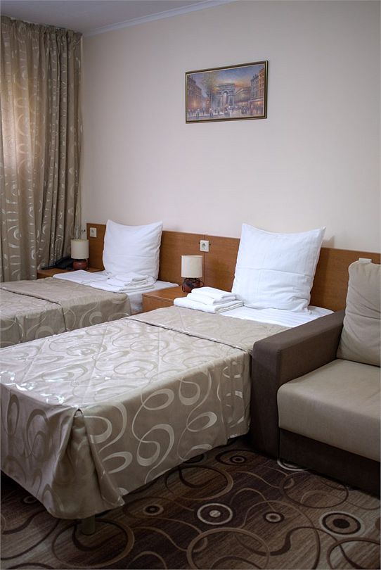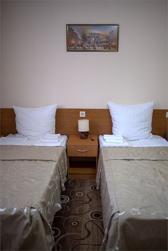 Комфортный однокомнатный стандартный номер без балкона с возможностью размещения до 3-4 человек. Расположены номера в 4 корпусе на цокольном этаже (есть отдельный вход), на мансардном этаже (5 этаж, имеется лифт). Оптимально для отдыха семьи с размещением 1 гостя на кресло-кровати и 4-е дополнительное место на еврораскладушке или детской кроватки. Комплектация номера: две односпальные кровати, кресло-кровать, детская кроватка, сплит-система, холодильник, телевизор, телефон. Санузел: душевая кабина, косметические принадлежности, фен.Услуги и удобства