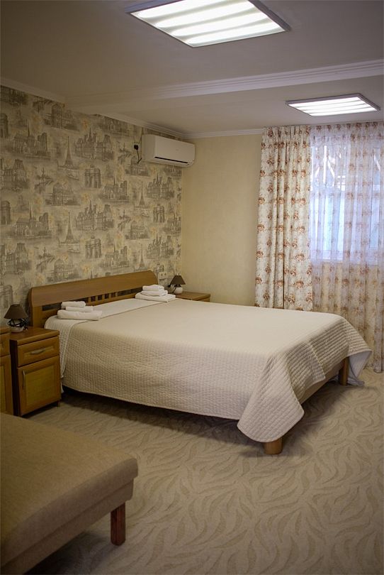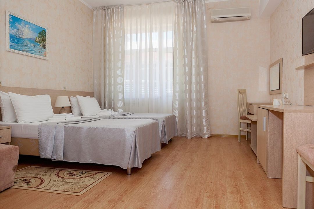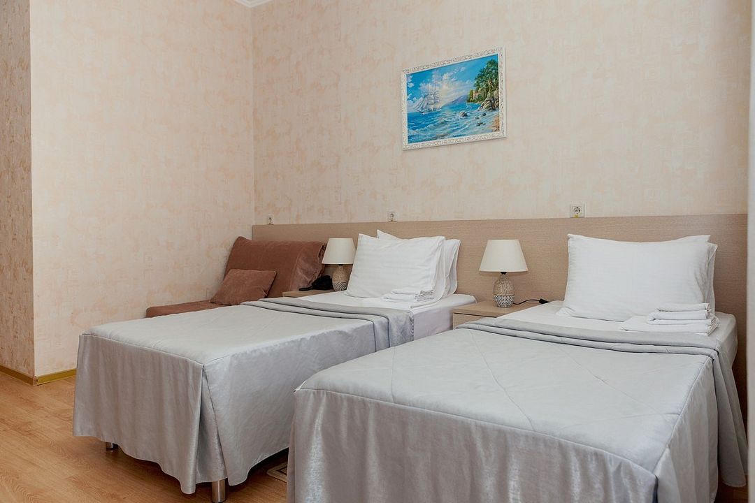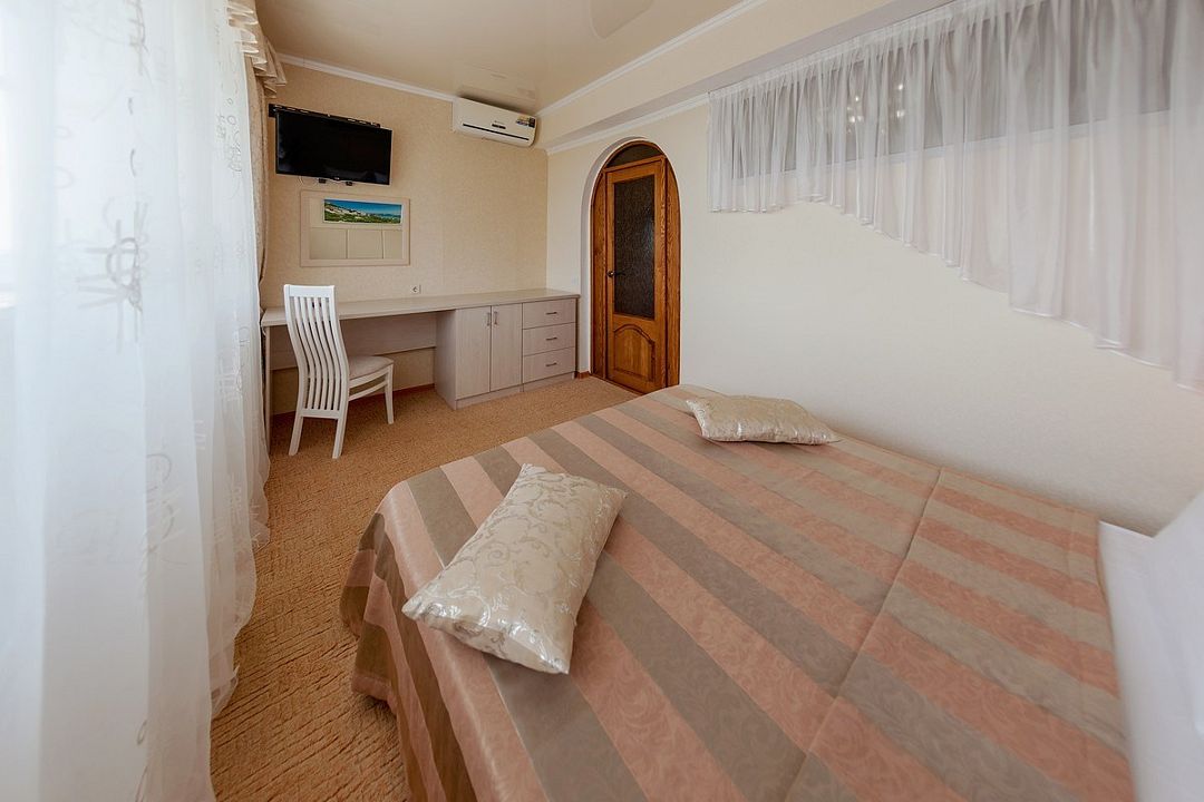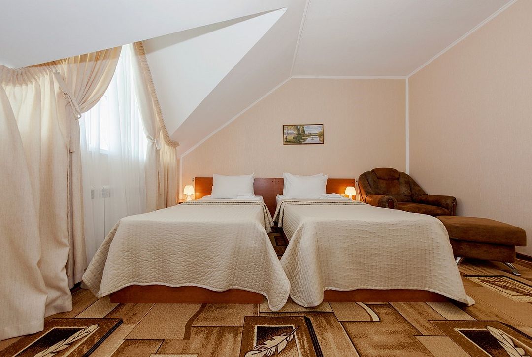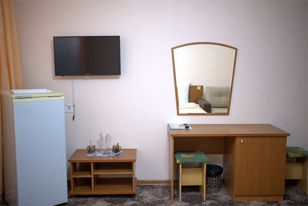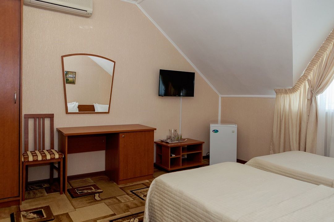 Комфортный однокомнатный стандартный номер без балкона с возможностью размещения до 3-4 человек. Расположены номера в 4 корпусе на цокольном этаже (есть отдельный вход), на мансардном этаже (5 этаж, имеется лифт). Оптимально для отдыха семьи с размещением 1 гостя на кресло-кровати и 4-е дополнительное место на еврораскладушке или детской кроватки. Комплектация номера: две односпальные кровати, кресло-кровать, детская кроватка, сплит-система, холодильник, телевизор, телефон. Санузел: душевая кабина, косметические принадлежности, фен.Услуги и удобства
