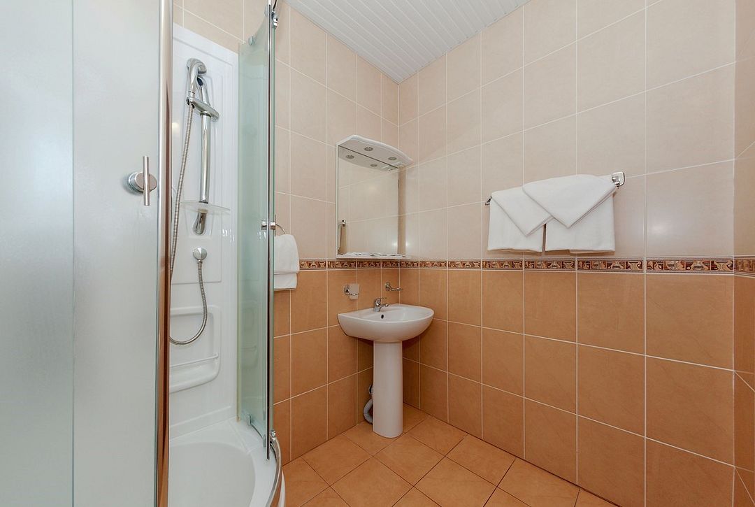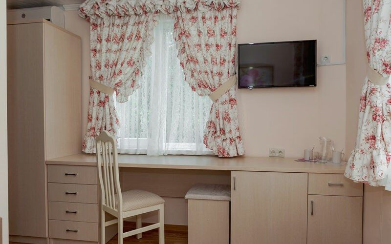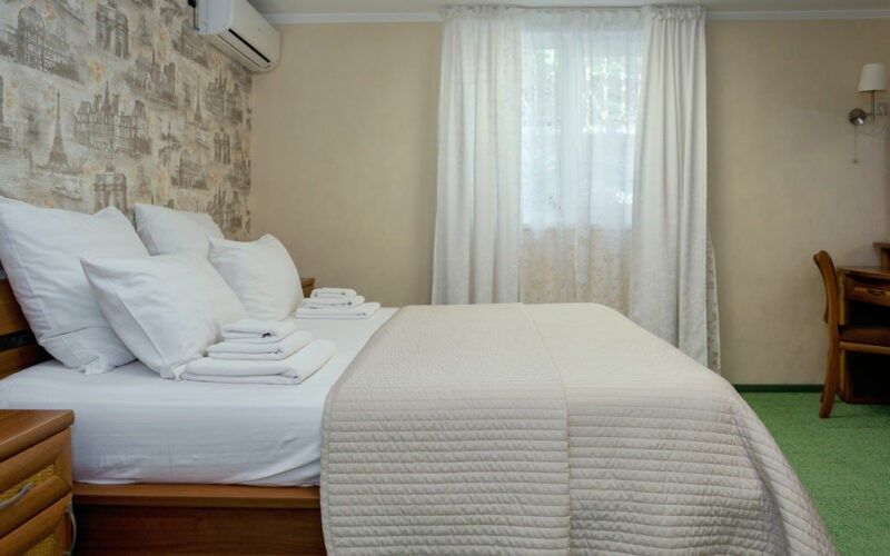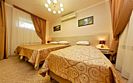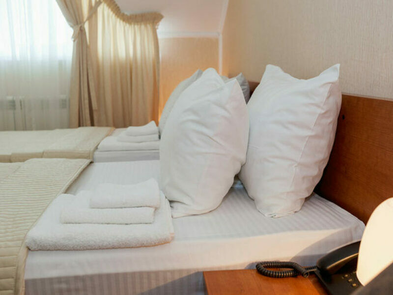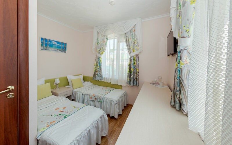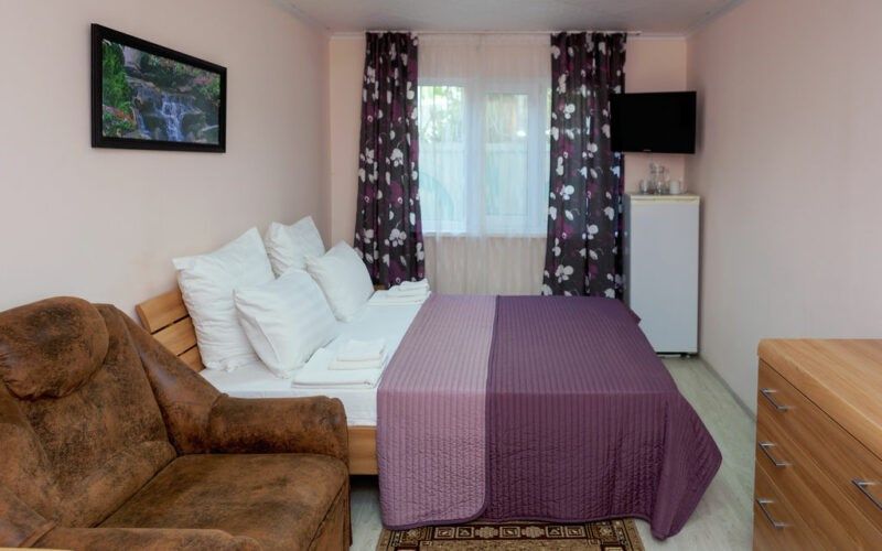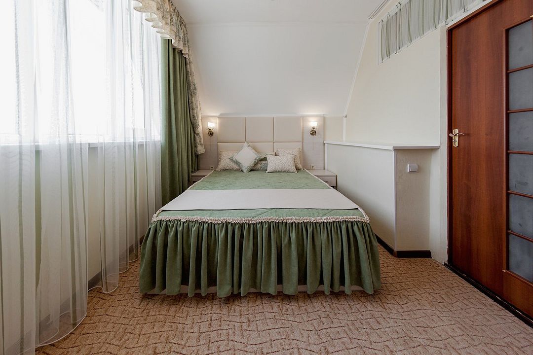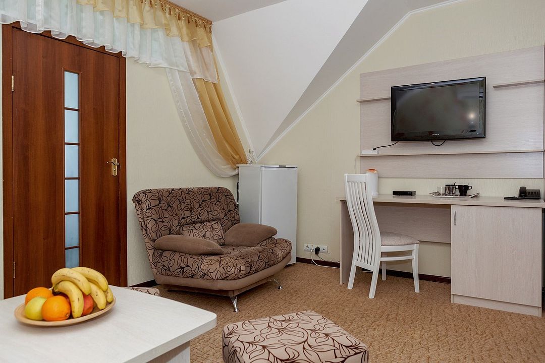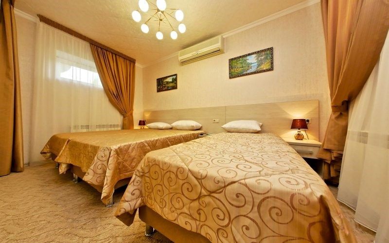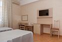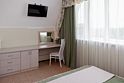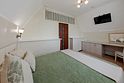 Комфортный однокомнатный стандартный номер без балкона с возможностью размещения до 3-4 человек. Расположены номера в 4 корпусе на цокольном этаже (есть отдельный вход), на мансардном этаже (5 этаж, имеется лифт). Оптимально для отдыха семьи с размещением 1 гостя на кресло-кровати и 4-е дополнительное место на еврораскладушке или детской кроватки. Комплектация номера: две односпальные кровати, кресло-кровать, детская кроватка, сплит-система, холодильник, телевизор, телефон. Санузел: душевая кабина, косметические принадлежности, фен.Услуги и удобства