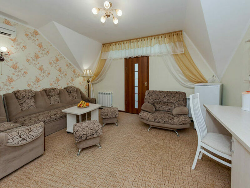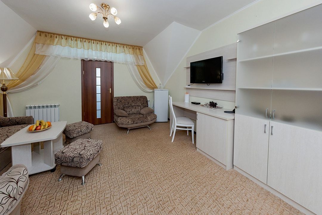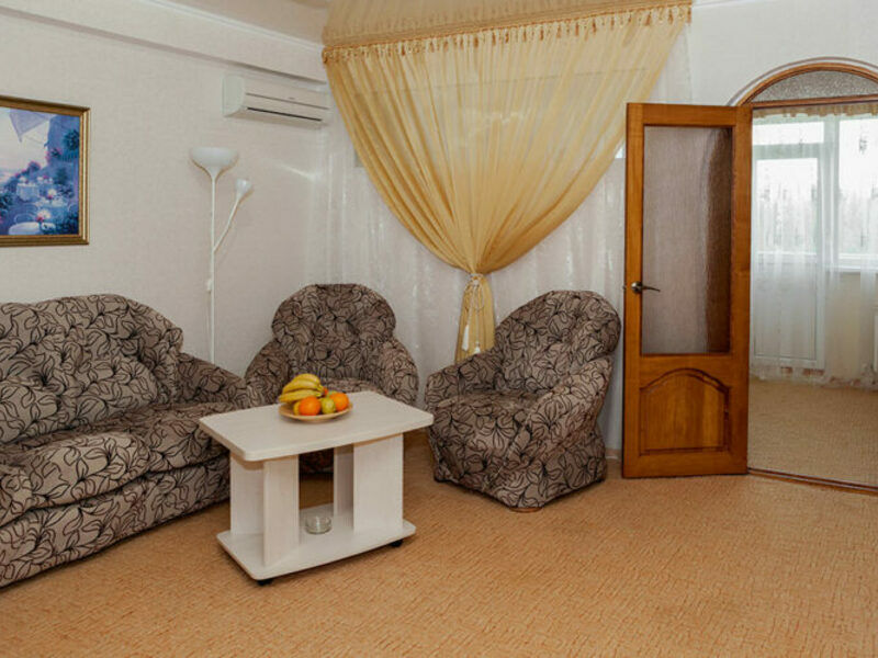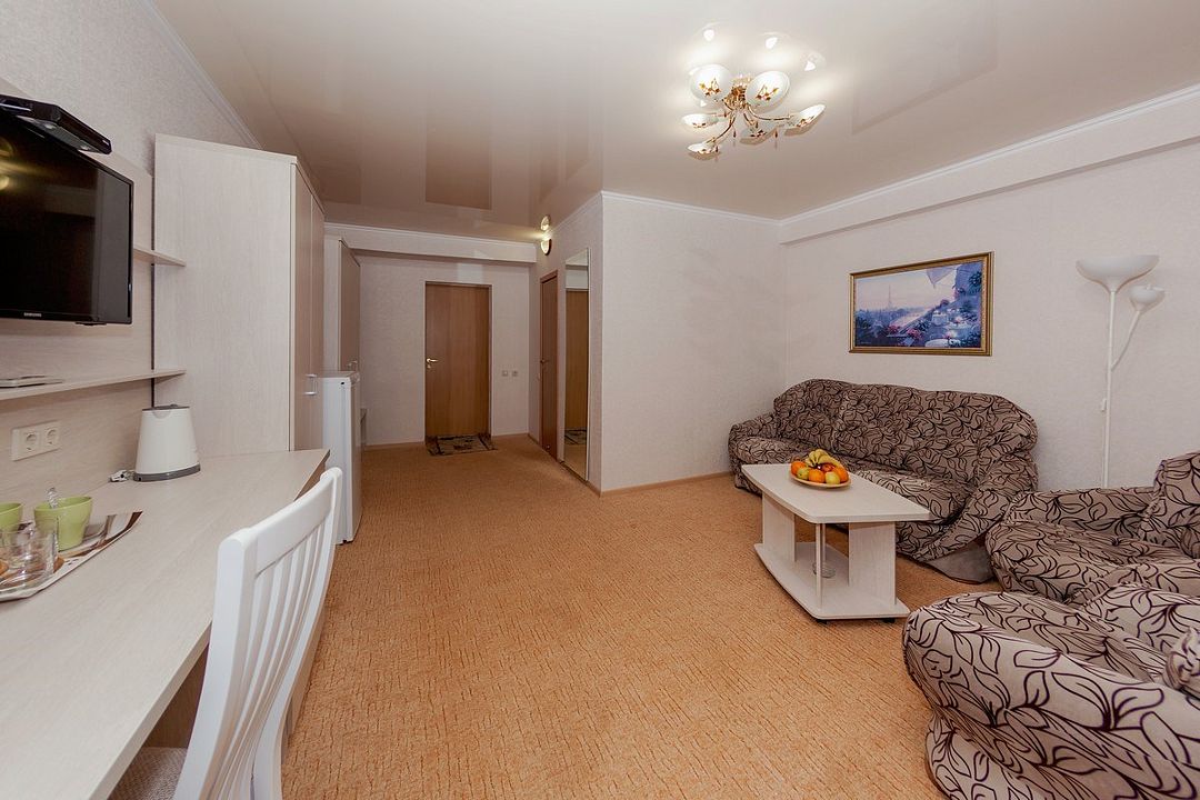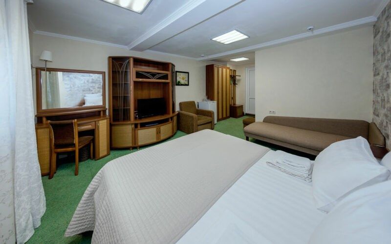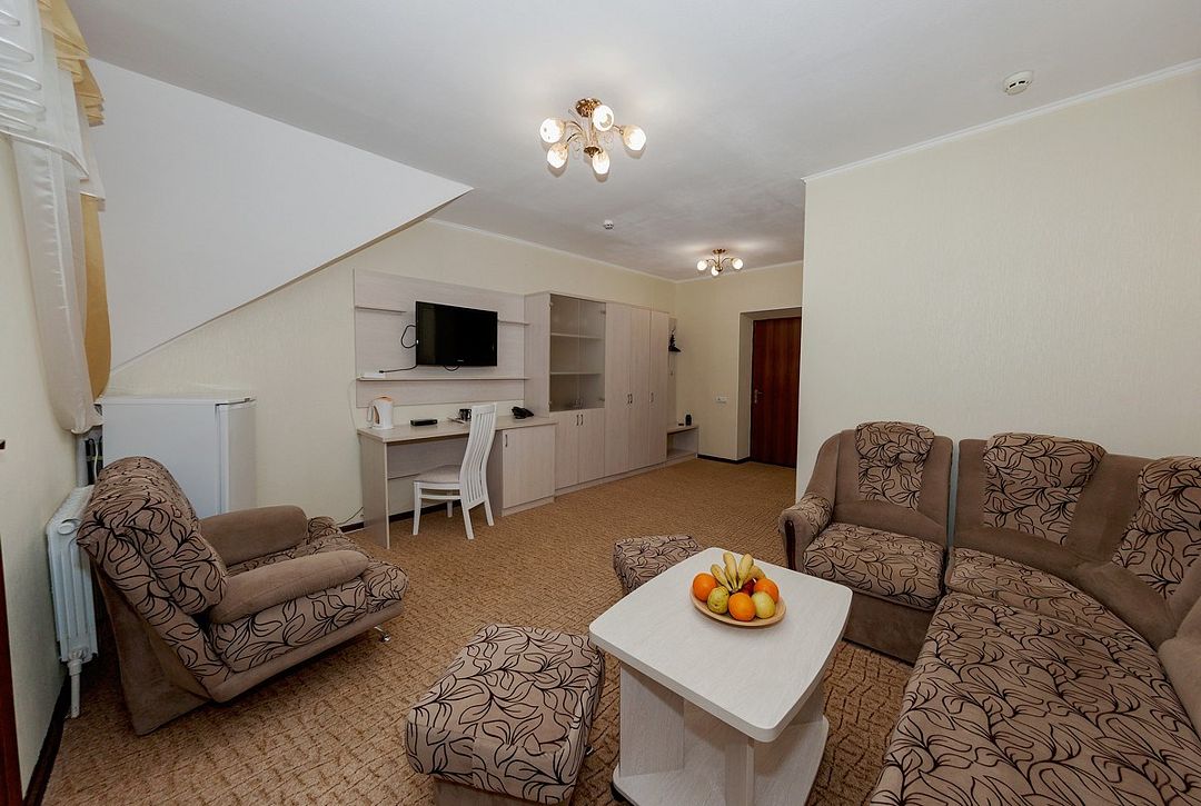 Комфортный двухкомнатный семейный номер с балконом с возможностью размещения до 5 человек. Расположен номер в 4 корпусе на 2,3,4 этажах (имеется лифт). Оптимально для отдыха большой семьей с размещением гостей на дополнительном месте. Спальная комната: двуспальная кровать, сплит-система, телевизор. Гостиная комната: раскладной диван (для 2-х человек), кресло-кровать, сплит-система, холодильник, спутниковое телевидение, набор посуды, телефон, сейф. Санузел: душевая кабина, косметические принадлежности, фен, халаты, тапочки.Услуги и удобства
