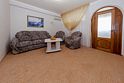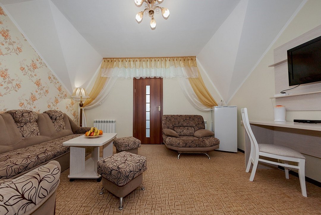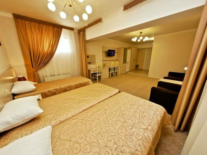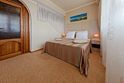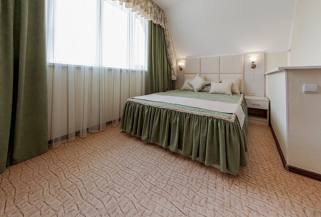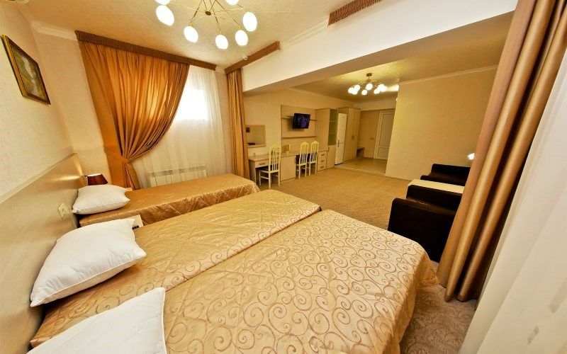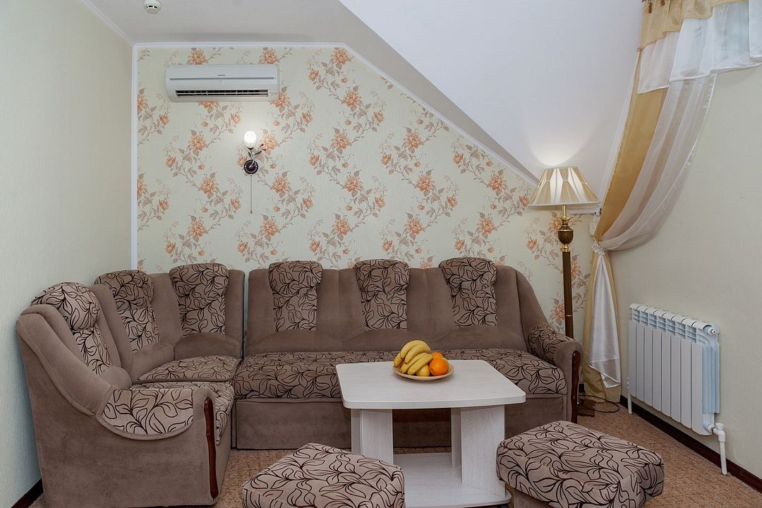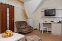 Комфортный двухкомнатный семейный номер с балконом с возможностью размещения до 5 человек. Расположен номер в 4 корпусе на 2,3,4 этажах (имеется лифт). Оптимально для отдыха большой семьей с размещением гостей на дополнительном месте. Спальная комната: двуспальная кровать, сплит-система, телевизор. Гостиная комната: раскладной диван (для 2-х человек), кресло-кровать, сплит-система, холодильник, спутниковое телевидение, набор посуды, телефон, сейф. Санузел: душевая кабина, косметические принадлежности, фен, халаты, тапочки.Услуги и удобства