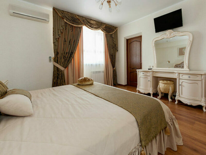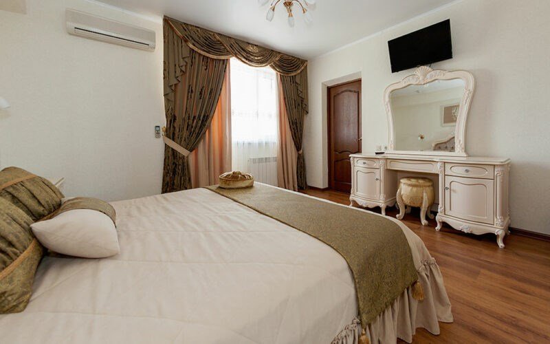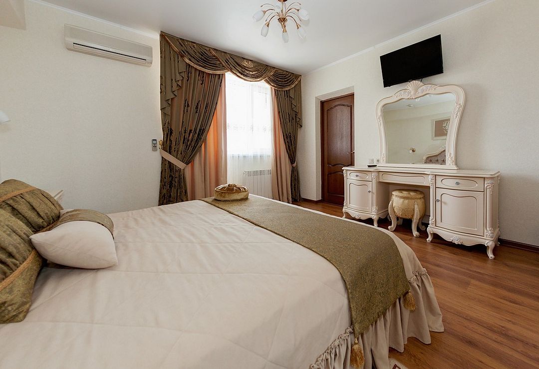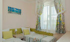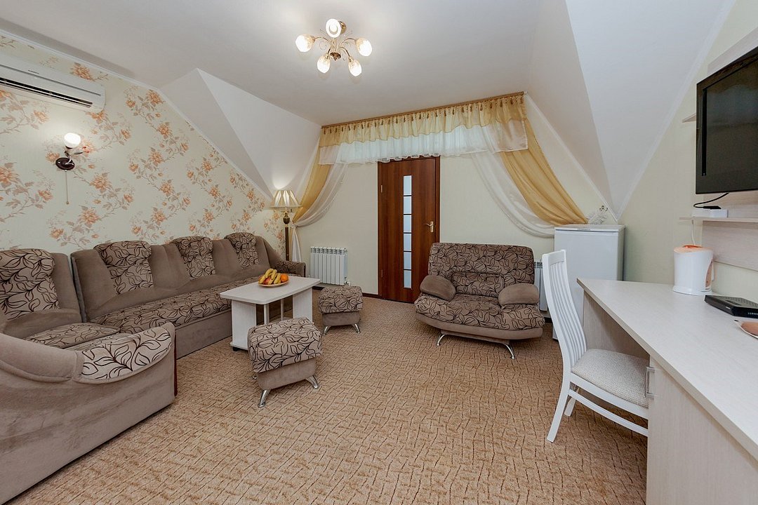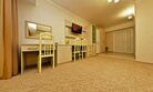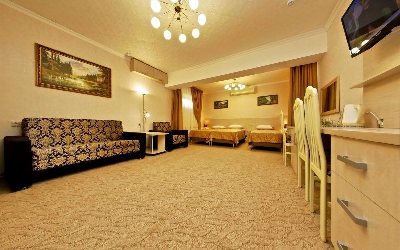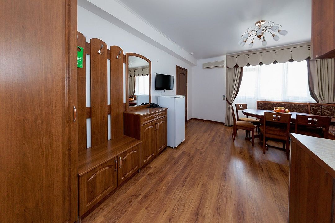 Комфортный двухкомнатный семейный номер с балконом и кухней с возможностью размещения до 5 человек. Расположен номер в 4 корпусе на 4 этаже (имеется лифт). Оптимально для отдыха большой семьей с размещением гостей на дополнительном месте. Спальная комната: двуспальная кровать, сплит-система, телевизор. Гостиная комната: раскладной диван (для 2-х человек), кресло-кровать, еврораскладушка или детская кроватка, сплит-система, холодильник, спутниковое телевидение, набор посуды, телефон, сейф. Кухня: обеденный уголок, кухонный гарнитур с плитой, набор посуды и кастрюль. Санузел1: душевая кабина, косметические принадлежности. Санузел2: джакузи, биде, косметические принадлежности, фен, халаты, тапочки.Услуги и удобства
