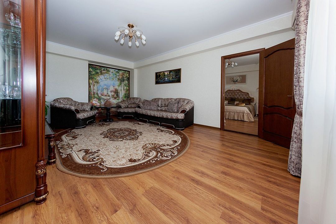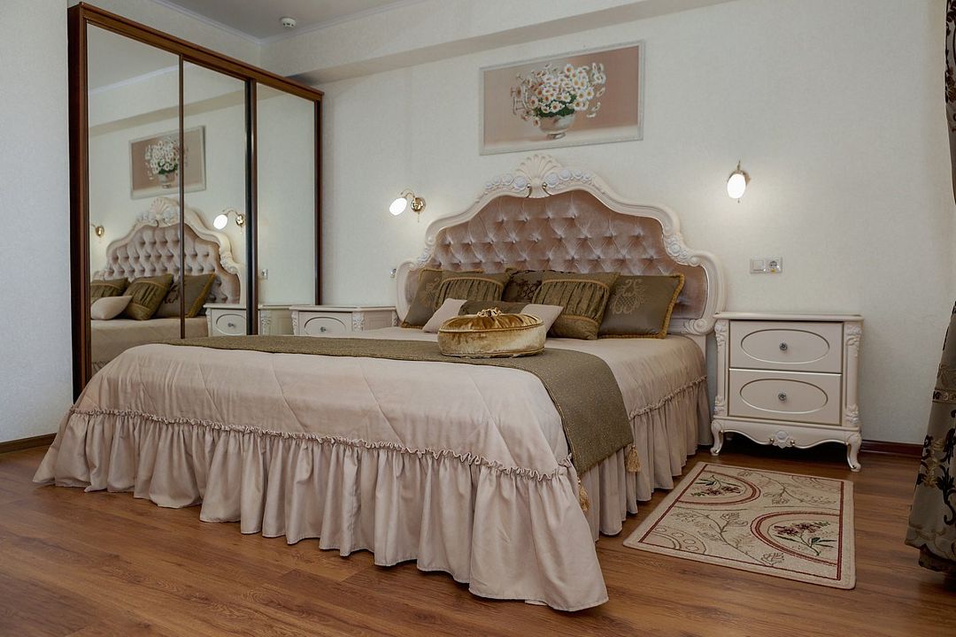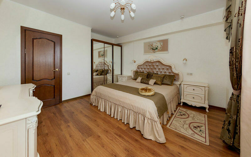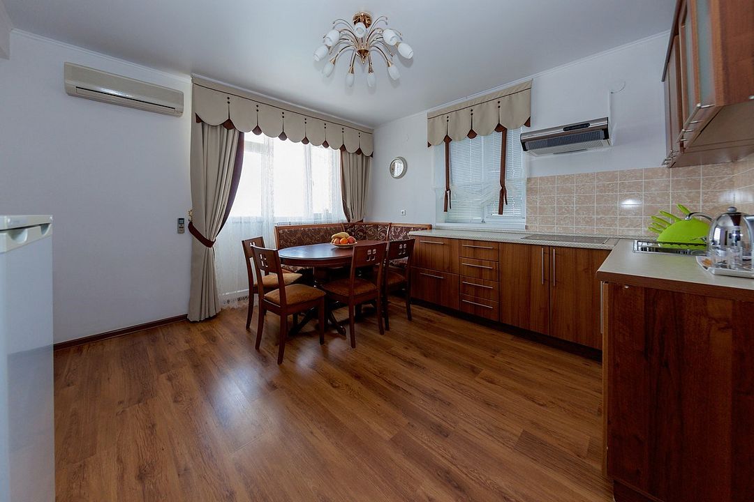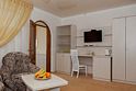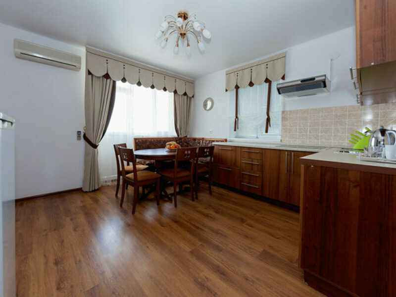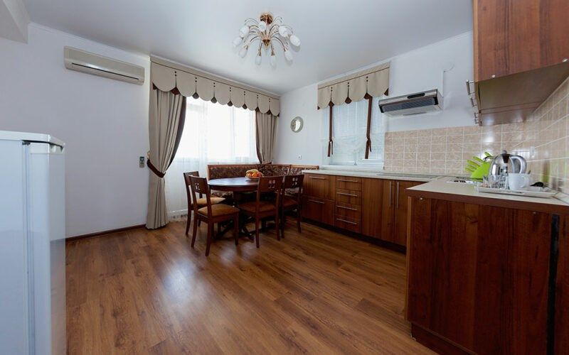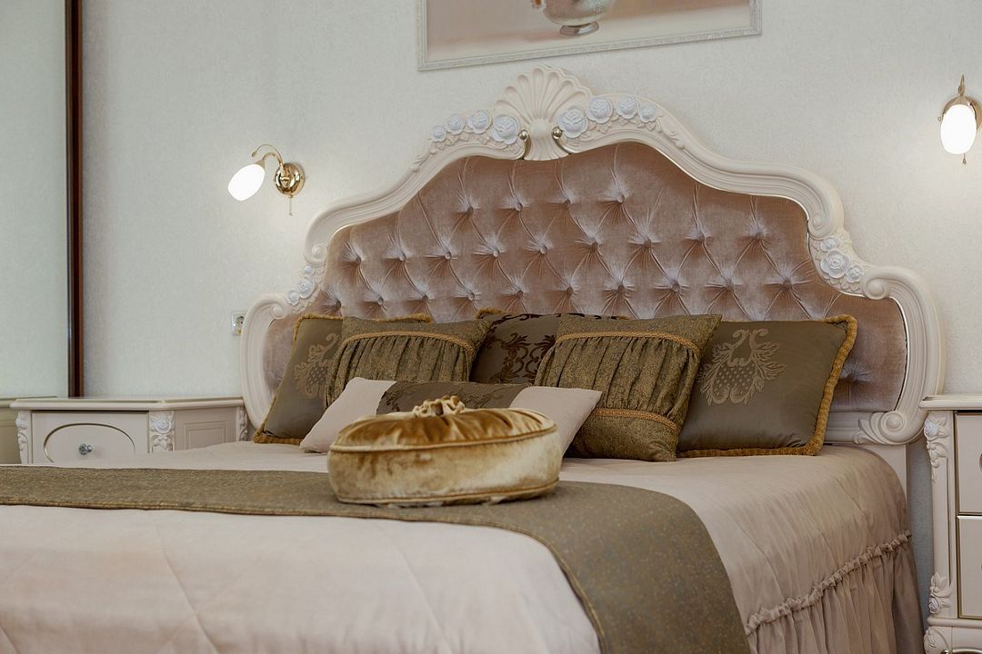 Комфортный двухкомнатный семейный номер с балконом и кухней с возможностью размещения до 5 человек. Расположен номер в 4 корпусе на 4 этаже (имеется лифт). Оптимально для отдыха большой семьей с размещением гостей на дополнительном месте. Спальная комната: двуспальная кровать, сплит-система, телевизор. Гостиная комната: раскладной диван (для 2-х человек), кресло-кровать, еврораскладушка или детская кроватка, сплит-система, холодильник, спутниковое телевидение, набор посуды, телефон, сейф. Кухня: обеденный уголок, кухонный гарнитур с плитой, набор посуды и кастрюль. Санузел1: душевая кабина, косметические принадлежности. Санузел2: джакузи, биде, косметические принадлежности, фен, халаты, тапочки.Услуги и удобства