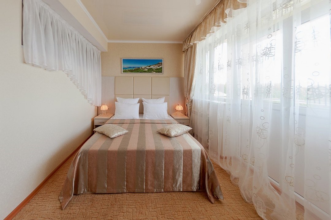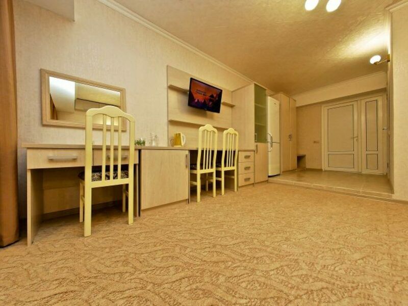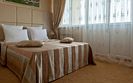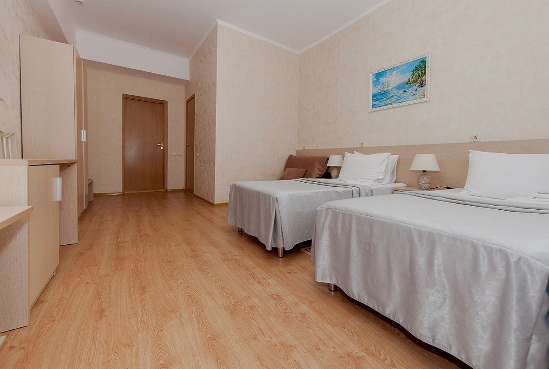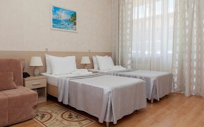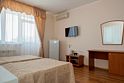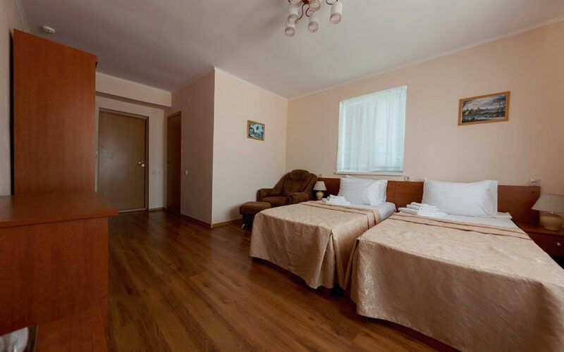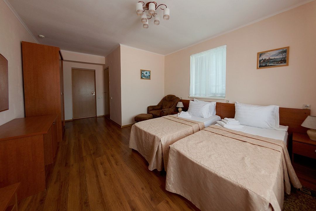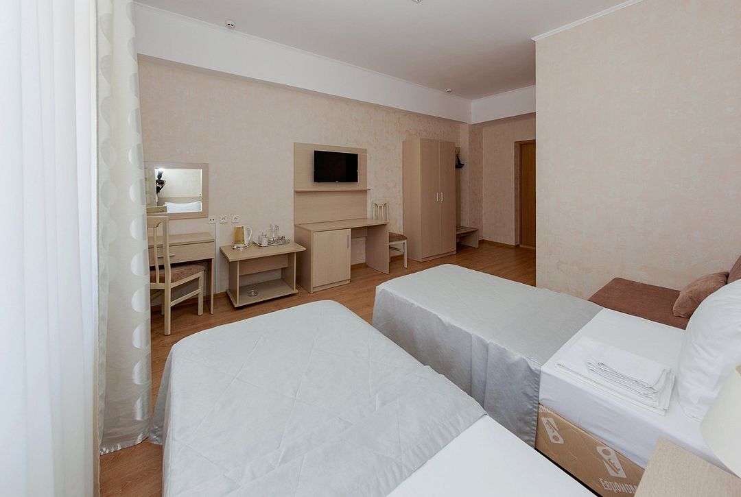 Комфортный однокомнатный стандартный номер с балконом с возможностью размещения до 3-4 человек. Расположены номера в 4 корпусе с 3 по 4 этаж (имеется лифт). Оптимально для отдыха семьи с размещением 1 гостя на кресло-кровати и 4-е дополнительное место на еврораскладушке или детской кроватки. Комплектация номера: две односпальные кровати, кресло-кровать, детская кроватка, сплит-система, холодильник, телевизор, телефон. Санузел: душевая кабина, косметические принадлежности, фен.Услуги и удобства