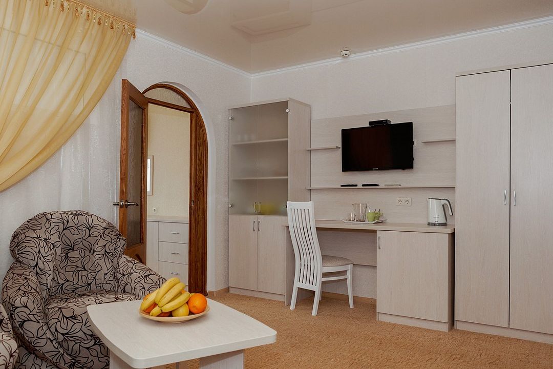 два телевизора, спутниковое телевидение, Wi-Fi, интернет, телефон, холодильник, кондиционер, светильник, фен, душевая кабина, ванна или душевая кабина, санузел, халаты, банные полотенца, пляжные полотенца, тапочки, косметические средства, двуспальная кровать, гладильная доска, детская кровать, диван, кресла, тумбы, стулья, шкаф для одежды, вешалки, журнальный столик, зеркало, пуфики, две комнаты, набор посуды, сейф, чайник, унитаз, раковина, мягкая мебель, гостиная зона, ковровое покрытие, вид на море, кулер на этаже, кресло, вид во двор, стаканы, столовые приборы, стул, стол, тумба, туалетные средства, сплит-система, сушилка для белья, цифровое тв, раскладной диван, раскладное кресло, внутренний телефон, телевизор с плоским экраном, мини-холодильник, москитная сетка, шкаф-купе, мансардные окна, частичный вид на море, телевизор со Smart TV, номер для некурящих, вид на бассейн, пуфик, общественный бассейн, кресло-кровать, угловой диван-кровать, без питомцевВ гостиничном номере