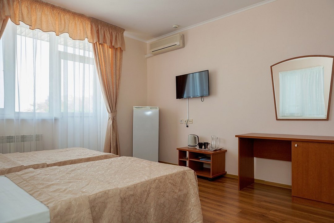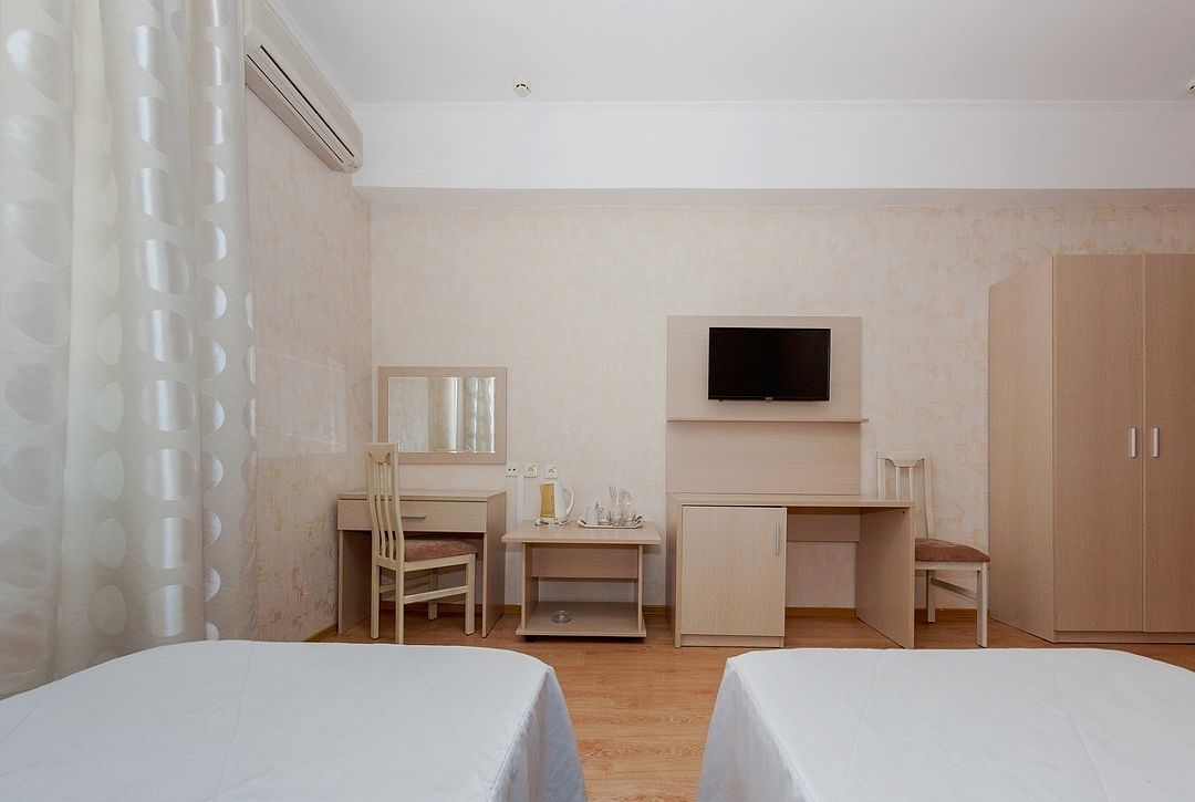 Комфортный однокомнатный эконом номер без балкона с возможностью размещения до 2 человек. Номера расположены в 5 корпусе на 2 и 3 этажах. Оптимально для отдыха одного взрослого с размещением 1 ребенка на дополнительном месте до 12 лет. Комплектация номера: две односпальные кровати, сплит-система, холодильник, телевизор, телефон. Санузел: душевая кабина, косметические принадлежности, фен.Услуги и удобства