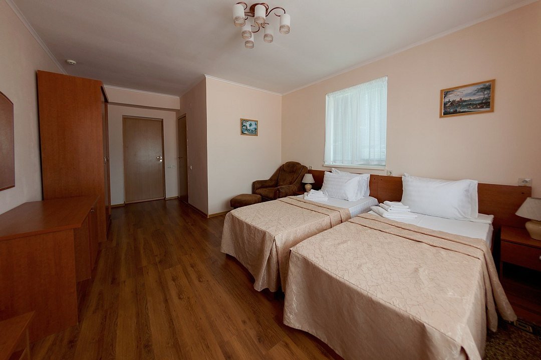ДостоинстваНеплохой пансионат на первой линии. Номер с видом на море, обустроен всем необходимым для комфортного отдыха. На окнах противомоскитные сетки. Сантехника нормальная, никогда ничего не засорялось. Питание довольно разнообразное, блюда сытные. Пляж чистый, с достаточным количеством лежаков. Анимация есть, детская комната тоже присутствует. Бассейны теплые. Сама территория небольшая, но очень уютная. Отель отлично подходит для семейного отдыха.
