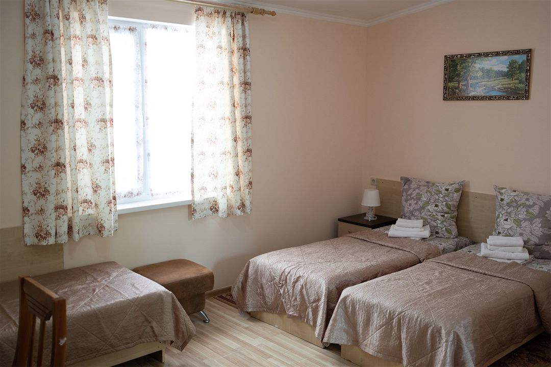 Комфортный однокомнатный стандартный номер без балкона с возможностью размещения до 3-4 человек. Расположен в 1,2,3 корпусах на 1 этаже. Оптимально для отдыха семьи с размещением 1 гостя и 4-е дополнительное место на еврораскладушке или детской кроватки. Комплектация номера: три односпальные кровати, детская кроватка, сплит-система, холодильник, телевизор, телефон. Санузел: душевая кабина, косметические принадлежности, фен.Услуги и удобства