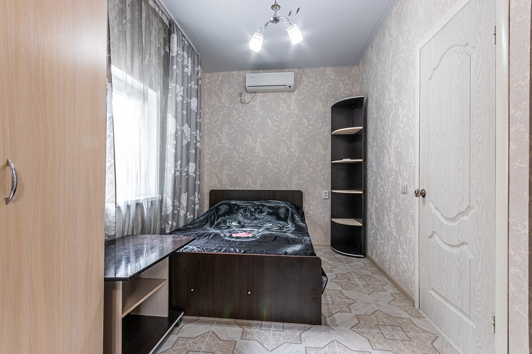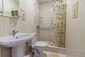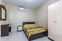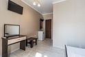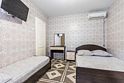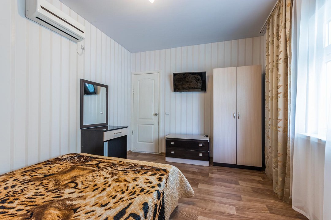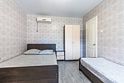 Две двуспальные кровати или двуспальная и 2 односпальных, тумбочки, зеркало, шкаф, светильник, чайник, кондиционер, с/у, душ.