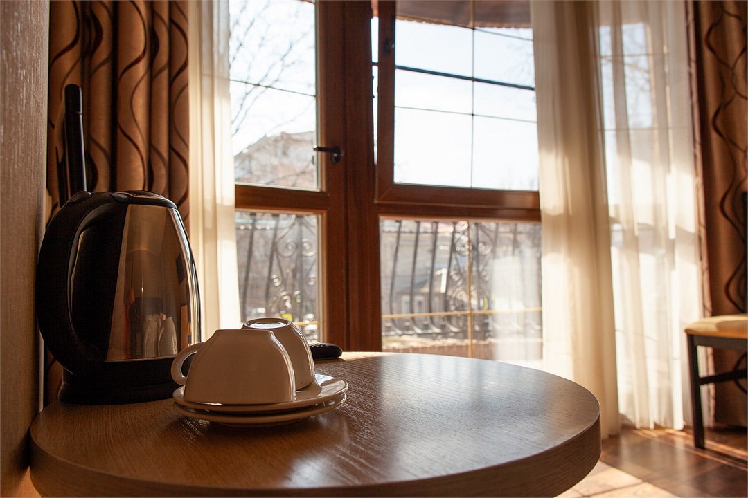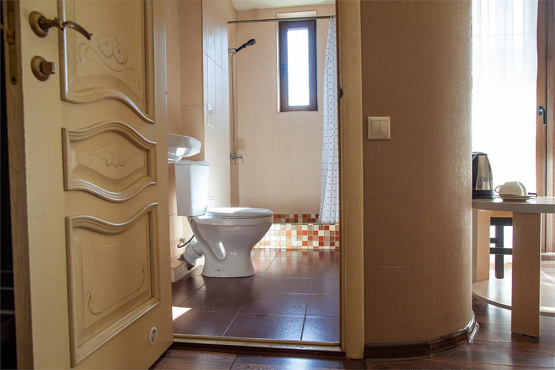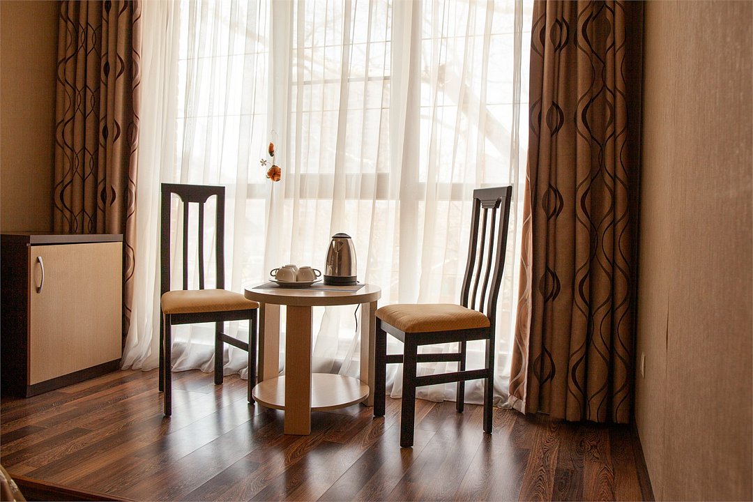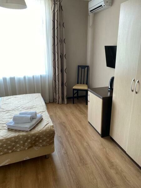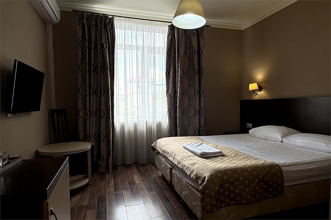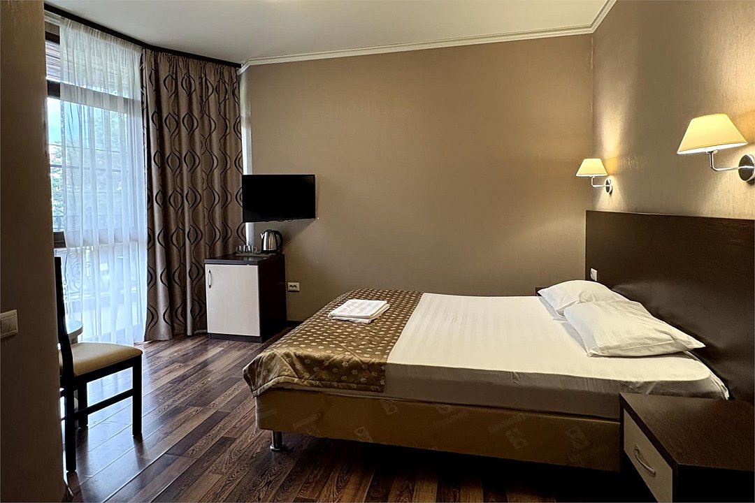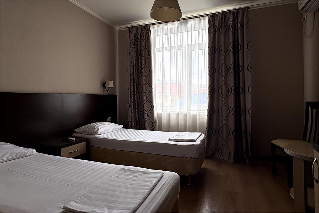 Комфортный и светлый номер с удобными двумя односпальными кроватями, мебель — стол, стул и вместительный шкаф, а также телевизор, холодильник, кондиционер. В вашем распоряжении собственный санузел с душем и полным набором косметических принадлежностей. Для любителей горячего напитка предусмотрены чайник, приветственный чай и кофе.Услуги и удобства