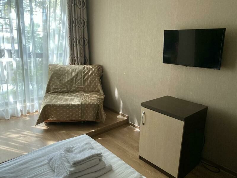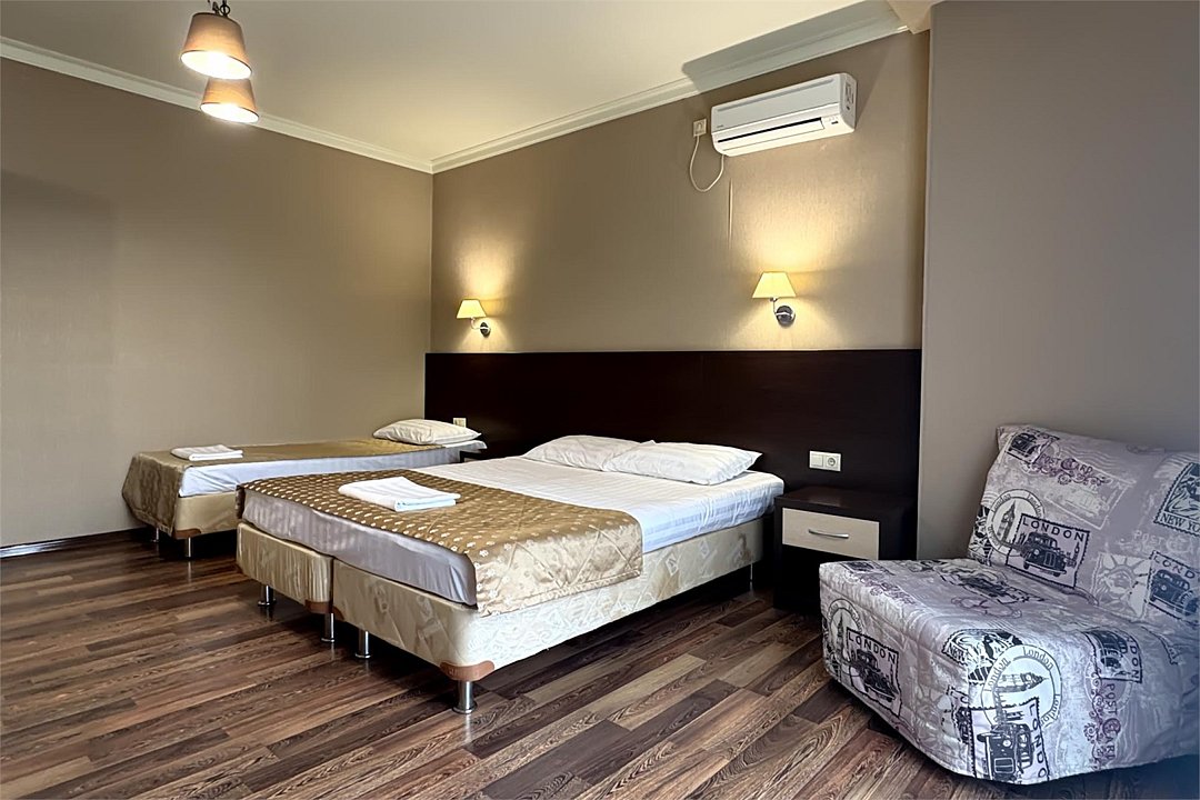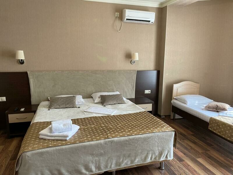 Просторный и уютный номер порадует вас домашней атмосферой и всеми необходимыми удобствами. Здесь вас ждет комфортная двухспальная и односпальная кровати, удобная мебель — стол, стул и вместительный шкаф, а также телевизор, холодильник, кондиционер. Уютный балкон позволит насладиться живописными видами и свежим морским воздухом. В вашем распоряжении собственный санузел с душем и полным набором косметических принадлежностей. Для любителей горячего напитка предусмотрены чайник, приветственный чай и кофе.Услуги и удобства