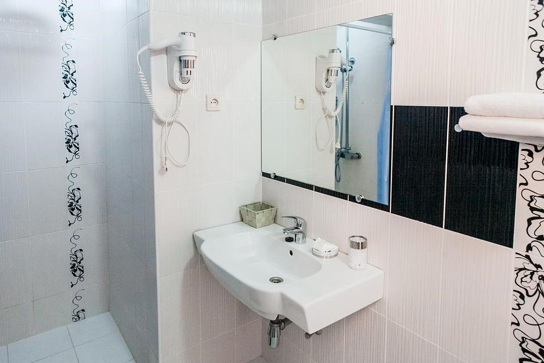 санузел, банные принадлежности, косметические средства, две односпальные или большая двуспальная кровать, тумбы, унитаз, раковина, душ, туалетные средства, телевизор с плоским экраном, шкаф-купе, мыло, можно с питомцамиВ гостиничном номере