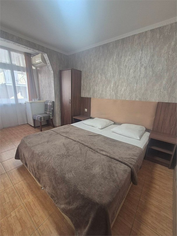 телевизор, холодильник, кондиционер, двуспальная кровать, диван, тумбы, шкаф для одежды, унитаз, раковина, душ, стаканы, можно с питомцамиВ гостиничном номере