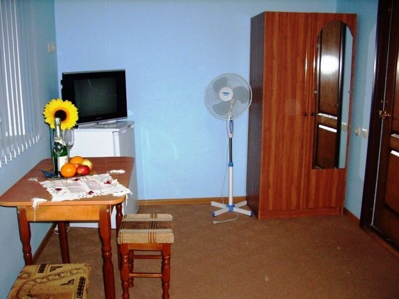 2 односпальные и двуспальная кровати, мягкий уголок, трехстворчатый шкаф, стулья, прикроватные тумбочки, стол, зеркало, 2 вентилятора или сплит-система, телевизор, спутниковое ТВ, холодильник, санузел в номере.