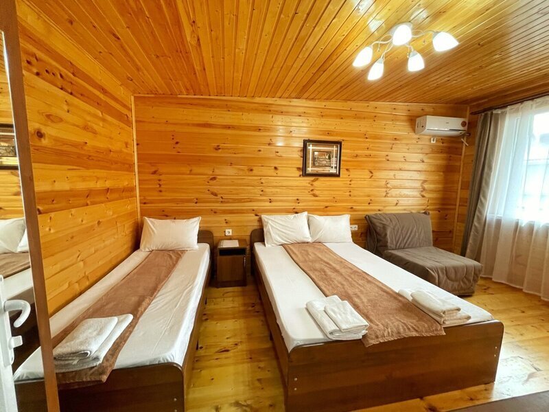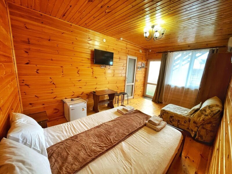 Двуспальная и односпальная кровати + кресло-кровать, с/у, душ, ТВ.