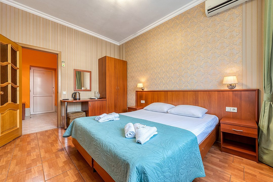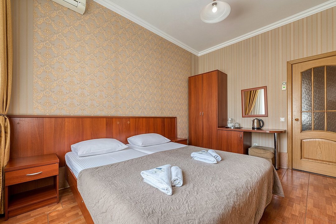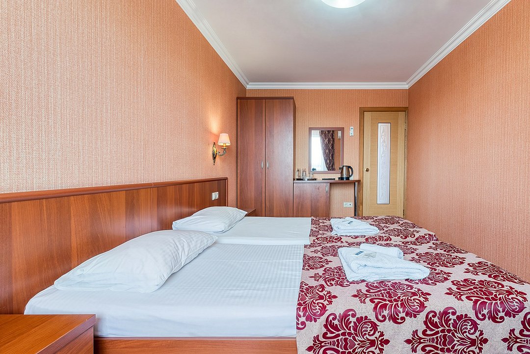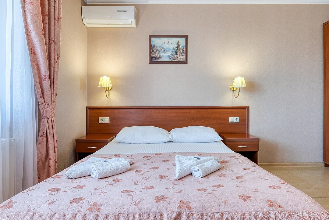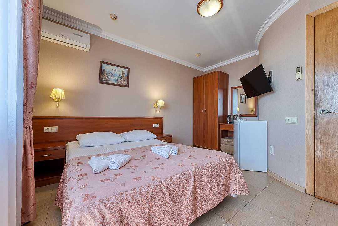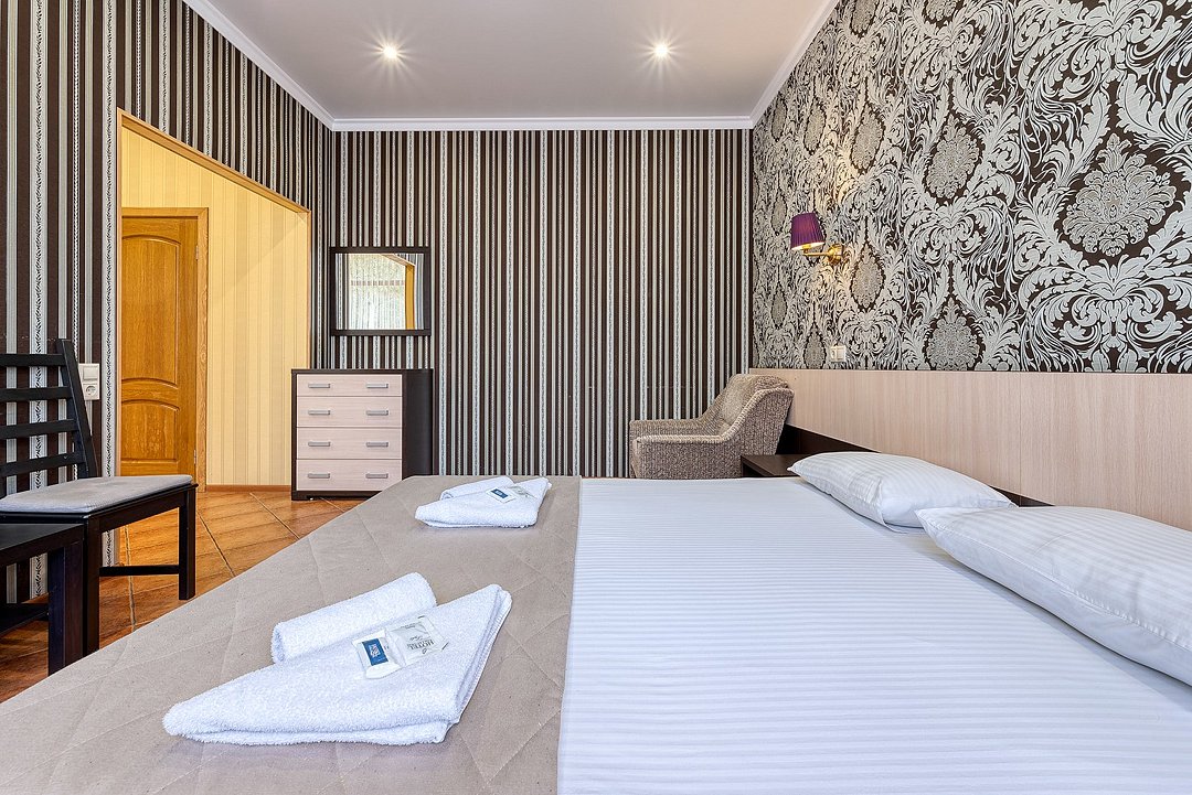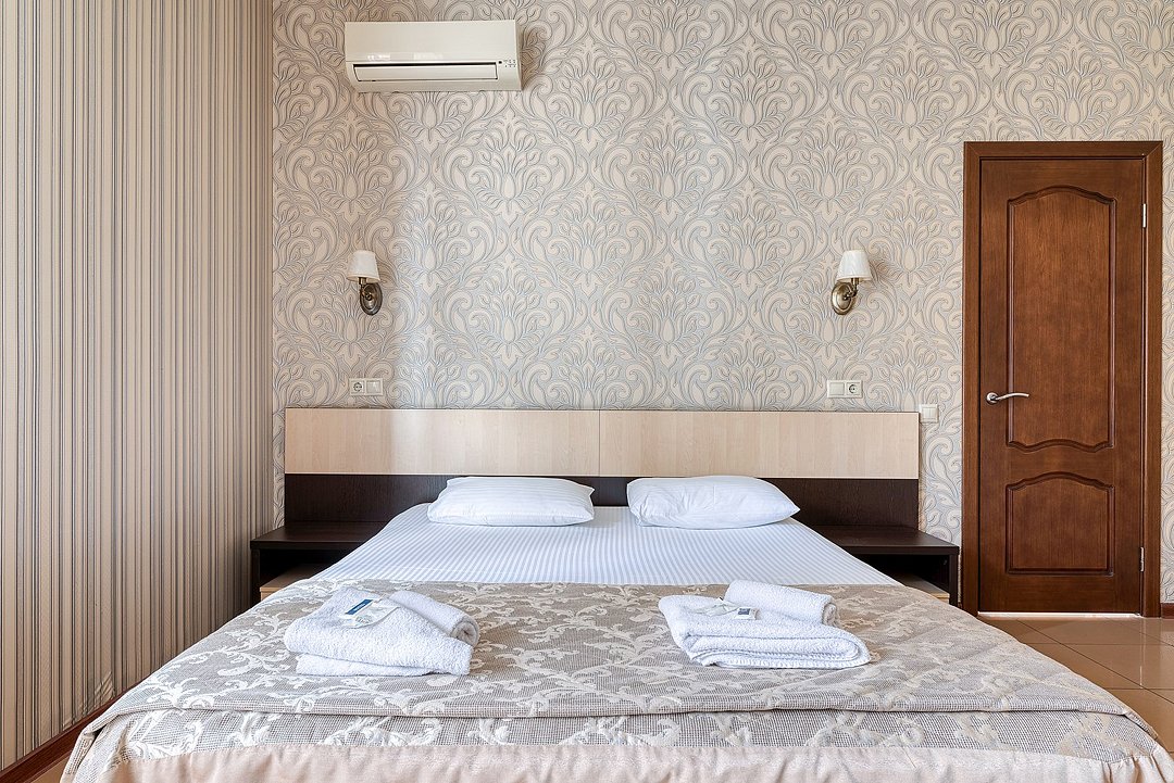 1 двухспальная кровать 160 + 2 доп. места Все номера оснащены: Wi-Fi, системой противопожарной сигнализацией, отоплением, кругосуточным холодным и горячим водоснабжением. Для безопасности в отеле ведется видеонаблюдение. В стоимость обслуживания включены следующие услуги: Проживание Уборка номера ежедневно Смена белья раз в 3-5 дней Дети принимаются с любого возраста. Животных привозить запрещается. Расчетный час: 14:00 - заезд, 12:00 - отъездУслуги и удобства