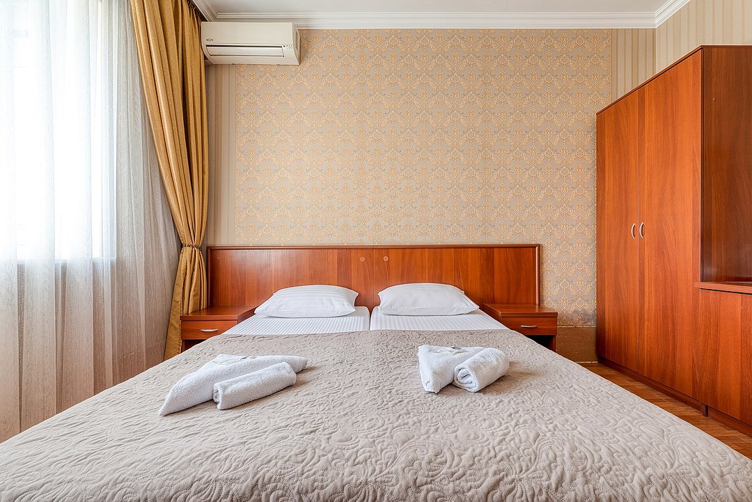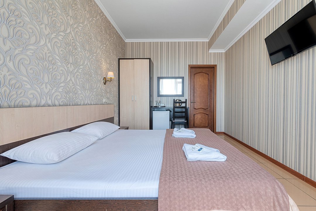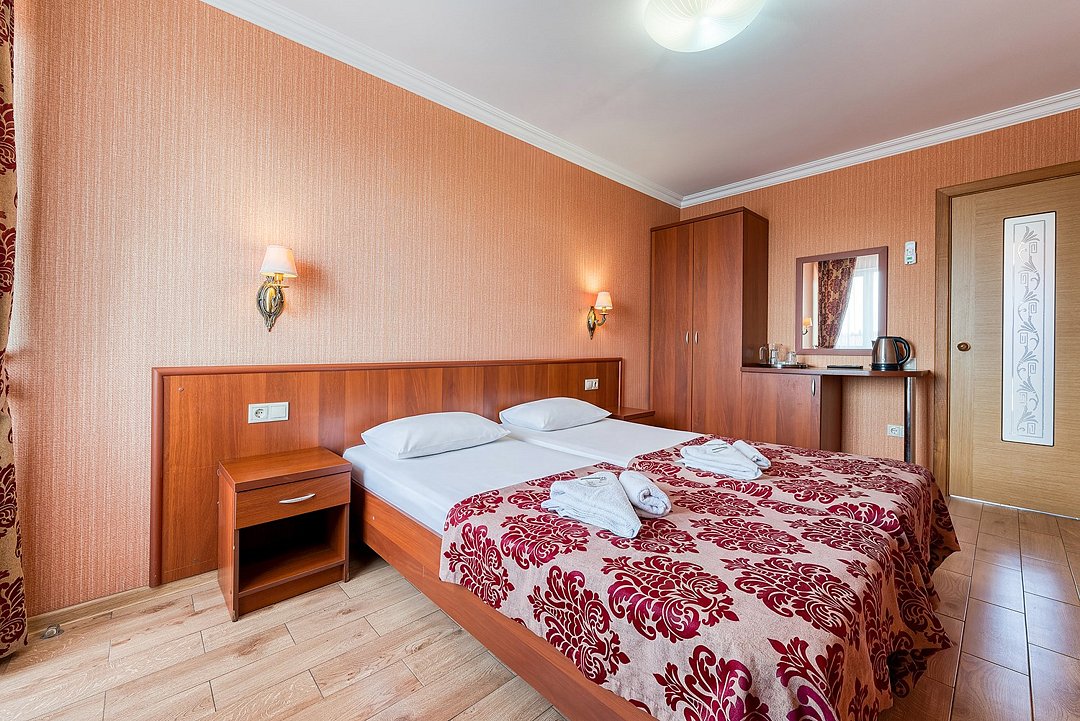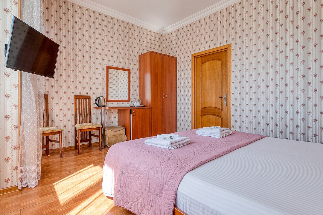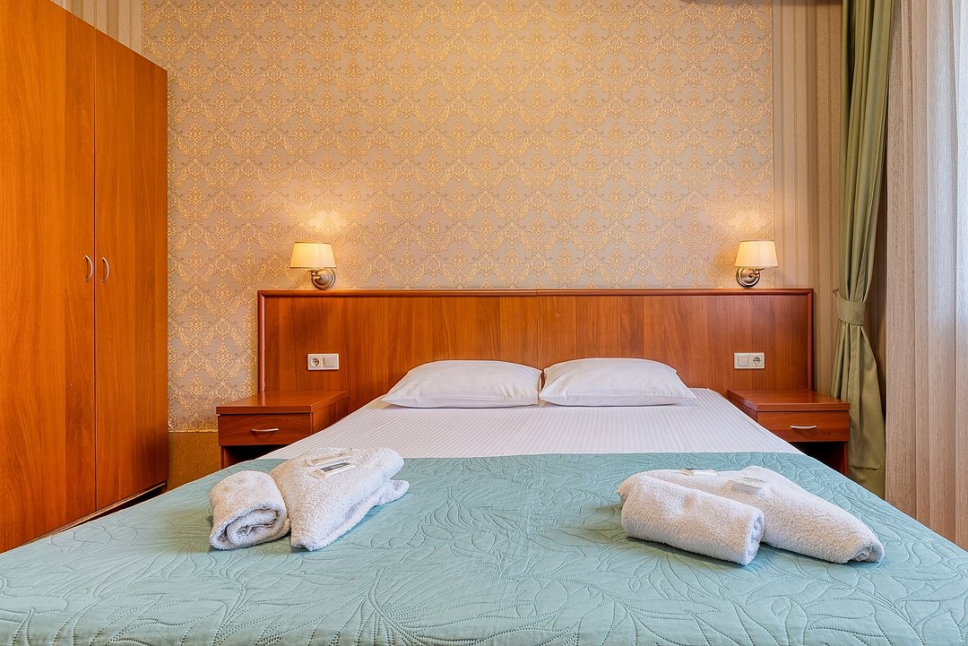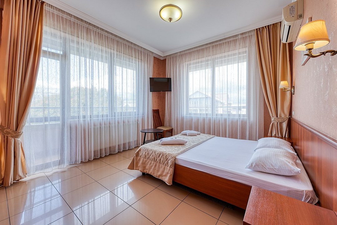 1 двухспальная кровать 160 + 2 доп. места Все номера оснащены: Wi-Fi, системой противопожарной сигнализацией, отоплением, кругосуточным холодным и горячим водоснабжением. Для безопасности в отеле ведется видеонаблюдение. В стоимость обслуживания включены следующие услуги: Проживание Уборка номера ежедневно Смена белья раз в 3-5 дней Дети принимаются с любого возраста. Животных привозить запрещается. Расчетный час: 14:00 - заезд, 12:00 - отъездУслуги и удобства