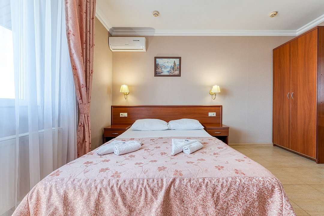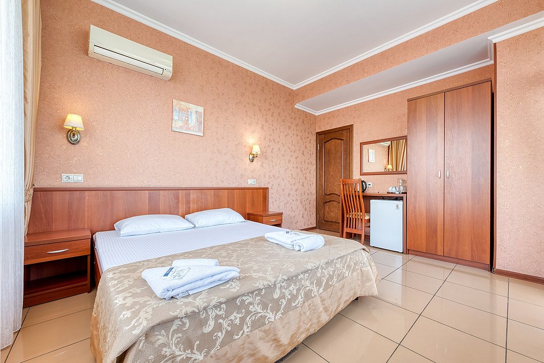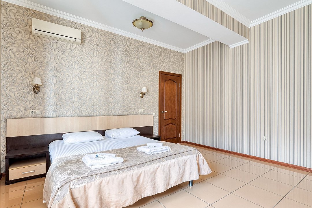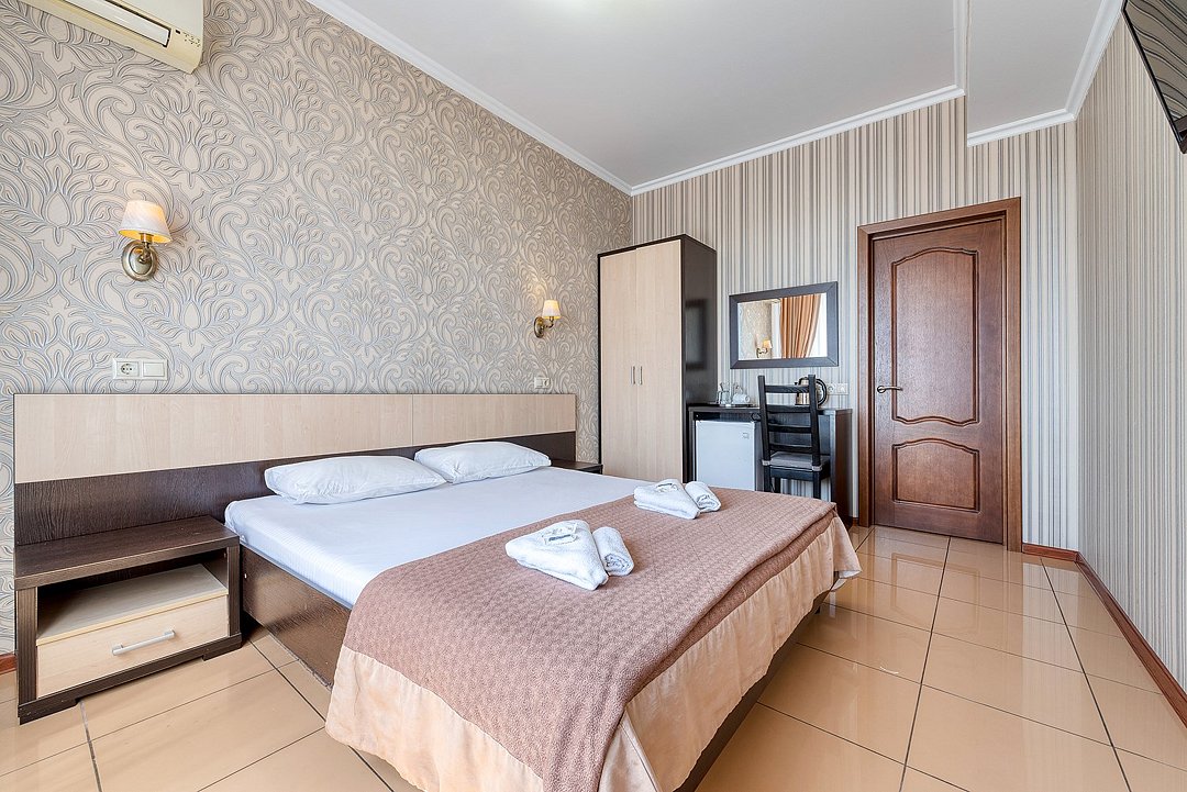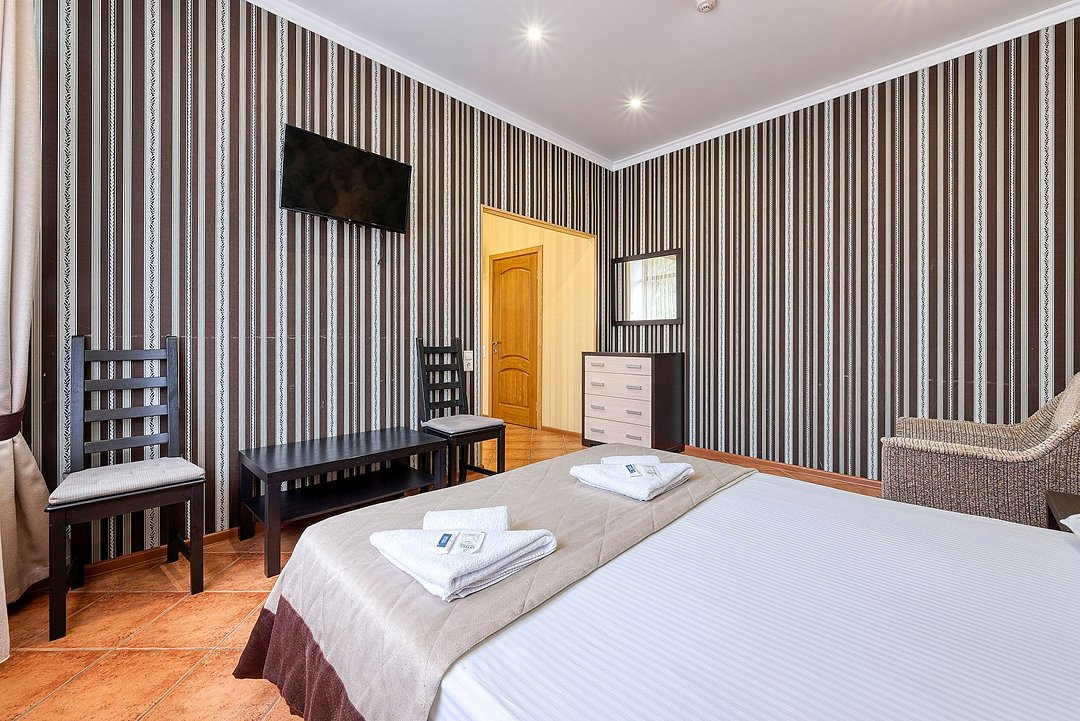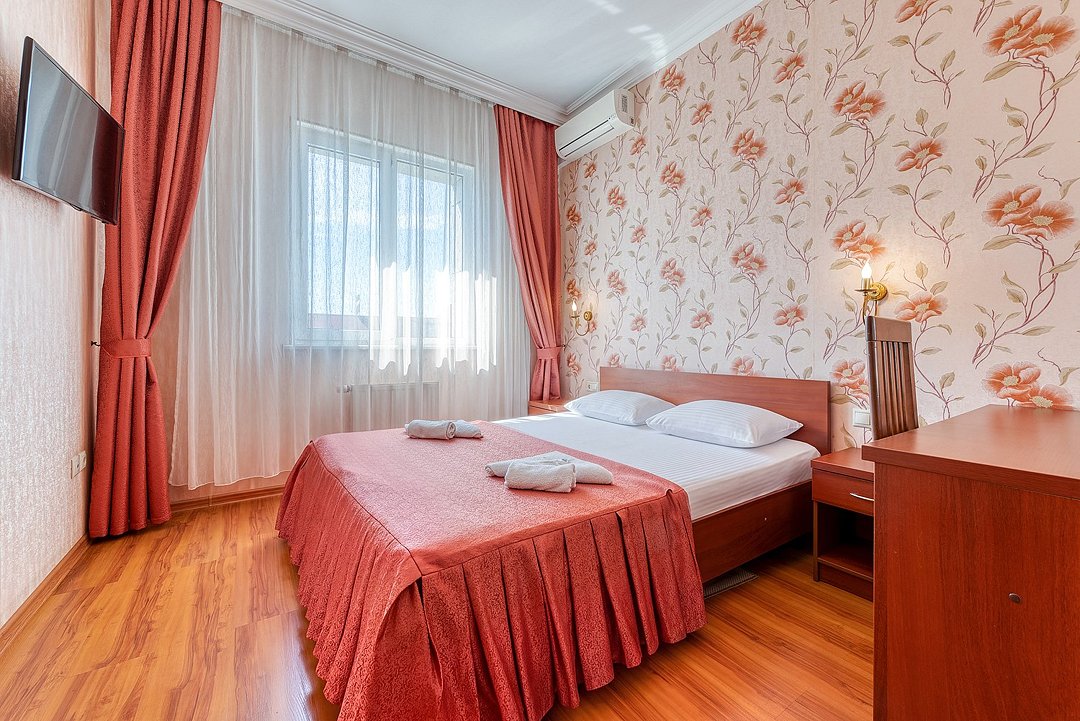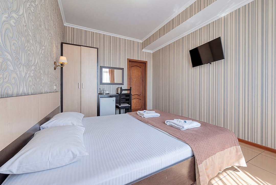 1 двухспальная кровать 160 + 2 доп. места Все номера оснащены: Wi-Fi, системой противопожарной сигнализацией, отоплением, кругосуточным холодным и горячим водоснабжением. Для безопасности в отеле ведется видеонаблюдение. В стоимость обслуживания включены следующие услуги: Проживание Уборка номера ежедневно Смена белья раз в 3-5 дней Дети принимаются с любого возраста. Животных привозить запрещается. Расчетный час: 14:00 - заезд, 12:00 - отъездУслуги и удобства