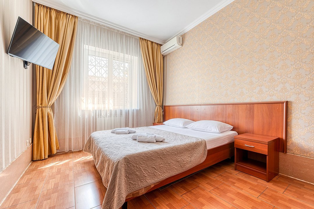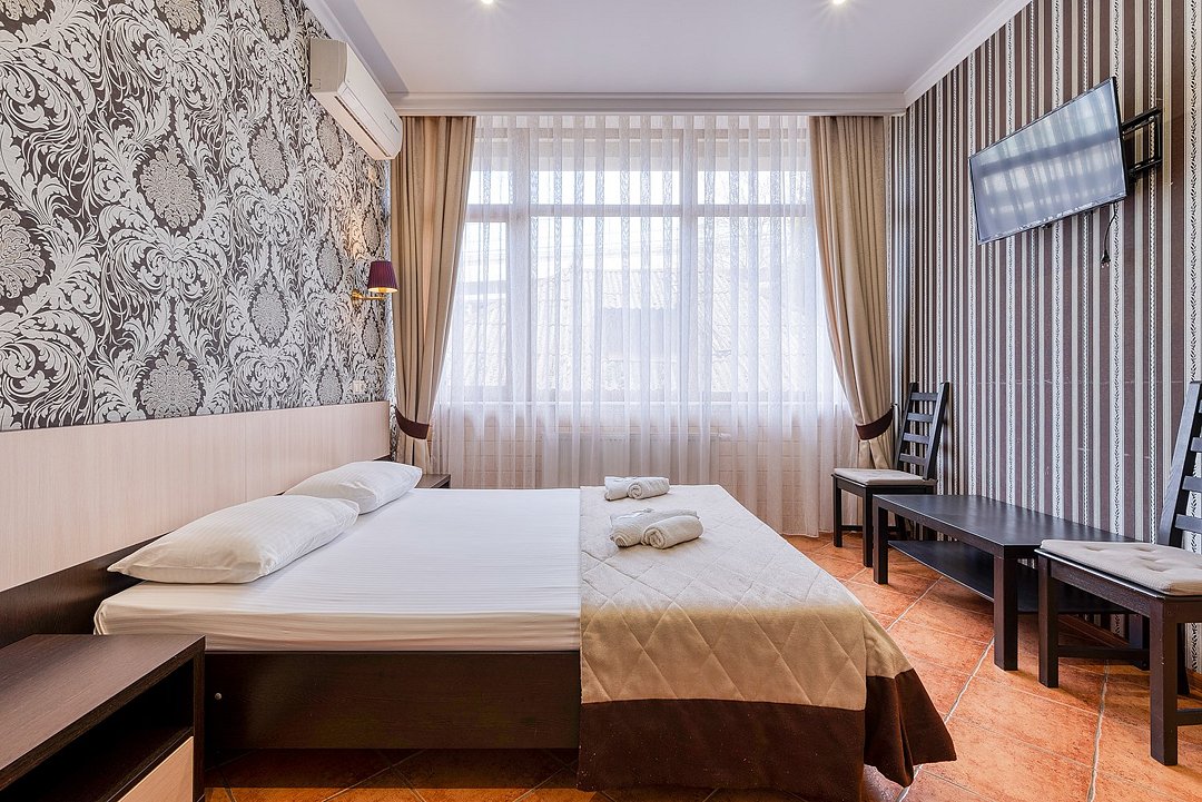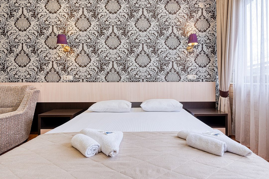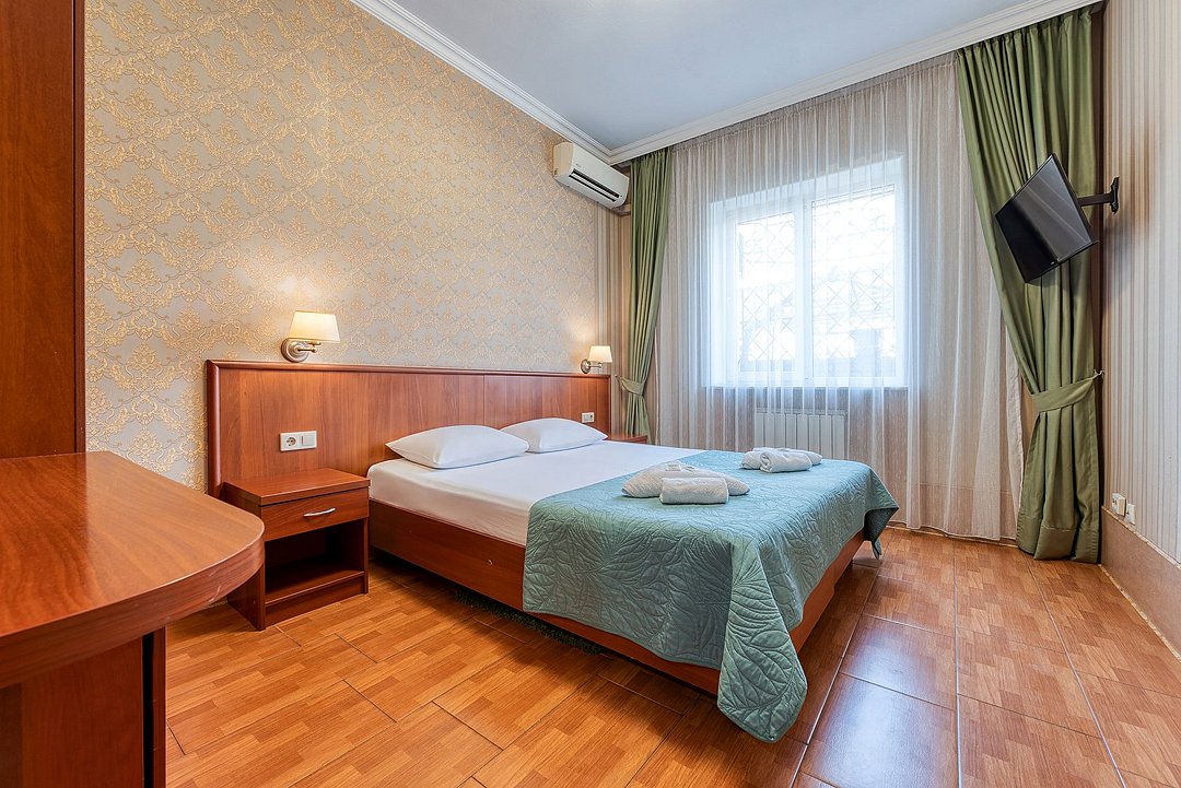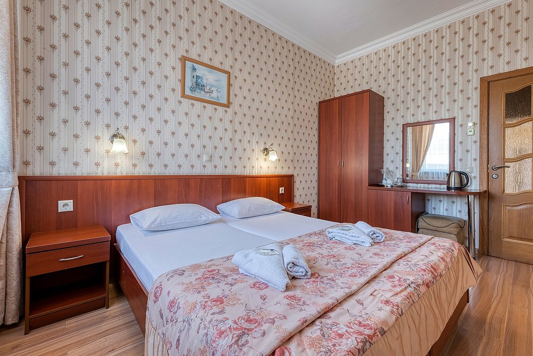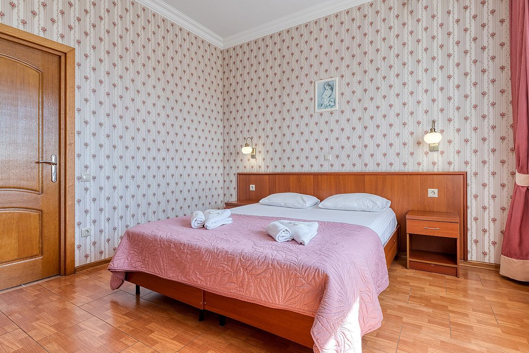 1 двухспальная кровать 160 + 2 доп. места Все номера оснащены: Wi-Fi, системой противопожарной сигнализацией, отоплением, кругосуточным холодным и горячим водоснабжением. Для безопасности в отеле ведется видеонаблюдение. В стоимость обслуживания включены следующие услуги: Проживание Уборка номера ежедневно Смена белья раз в 3-5 дней Дети принимаются с любого возраста. Животных привозить запрещается. Расчетный час: 14:00 - заезд, 12:00 - отъездУслуги и удобства