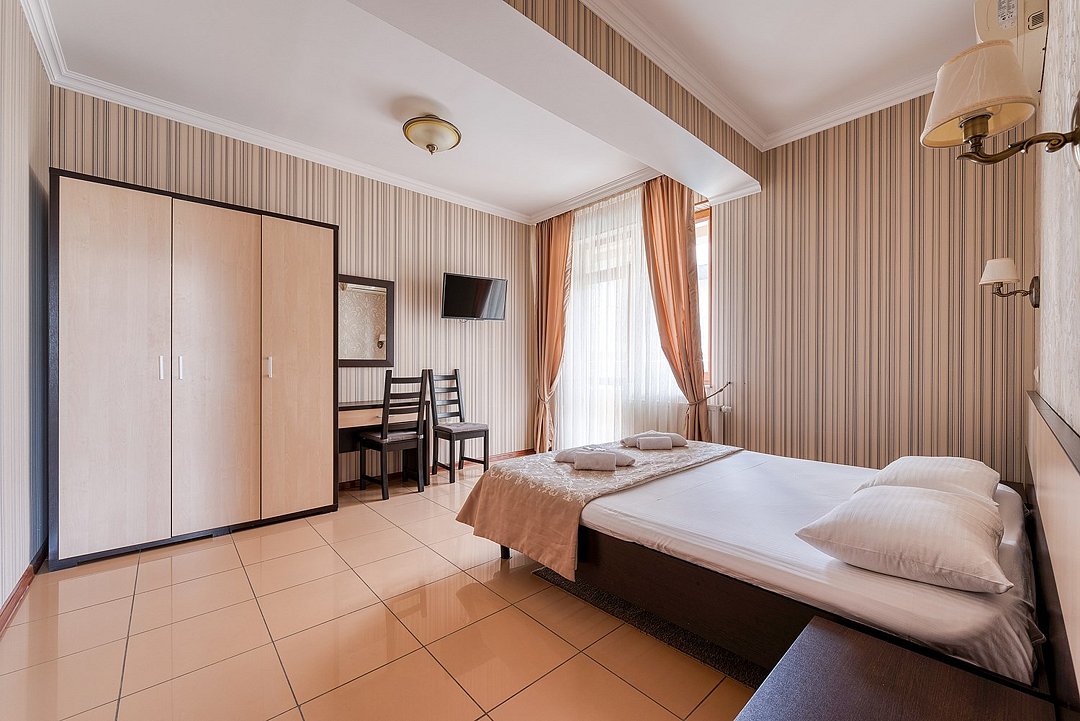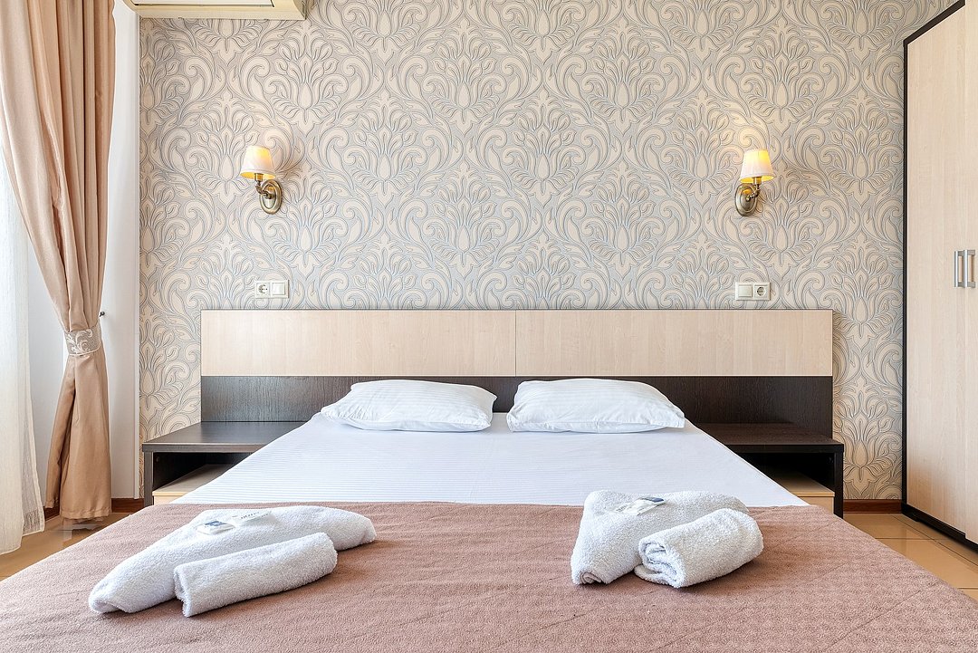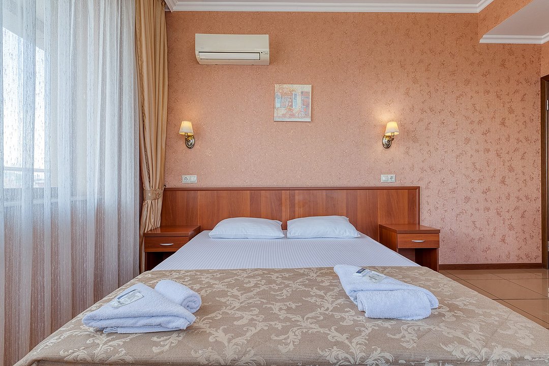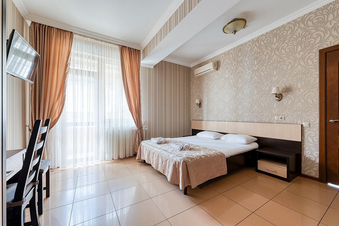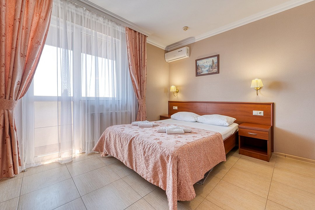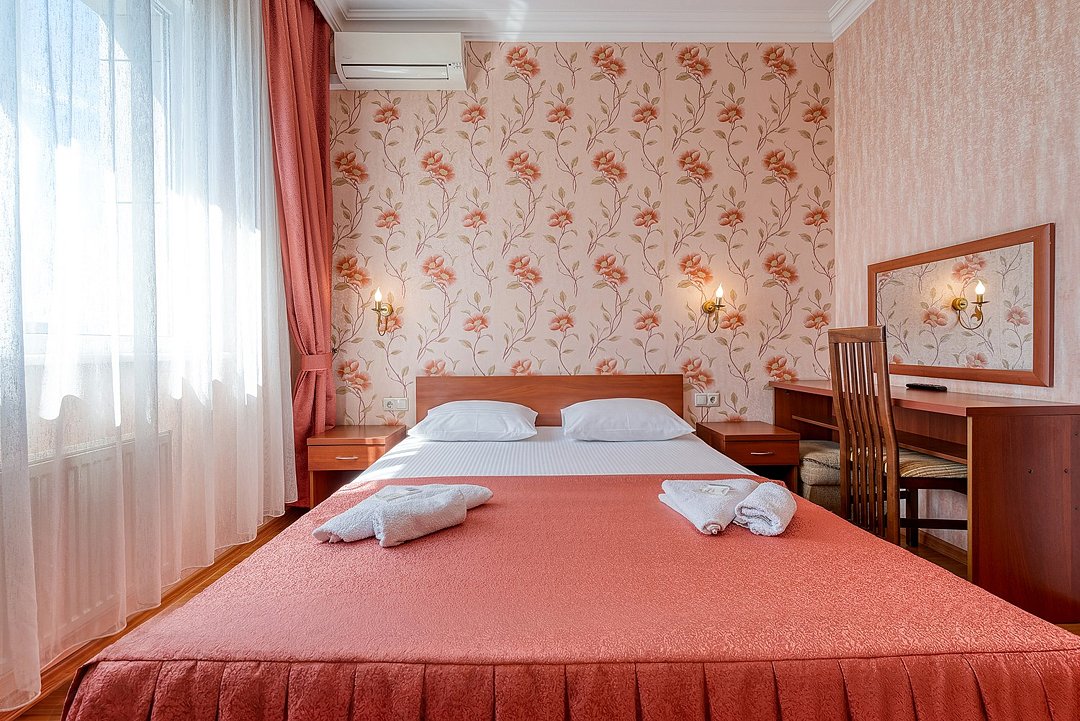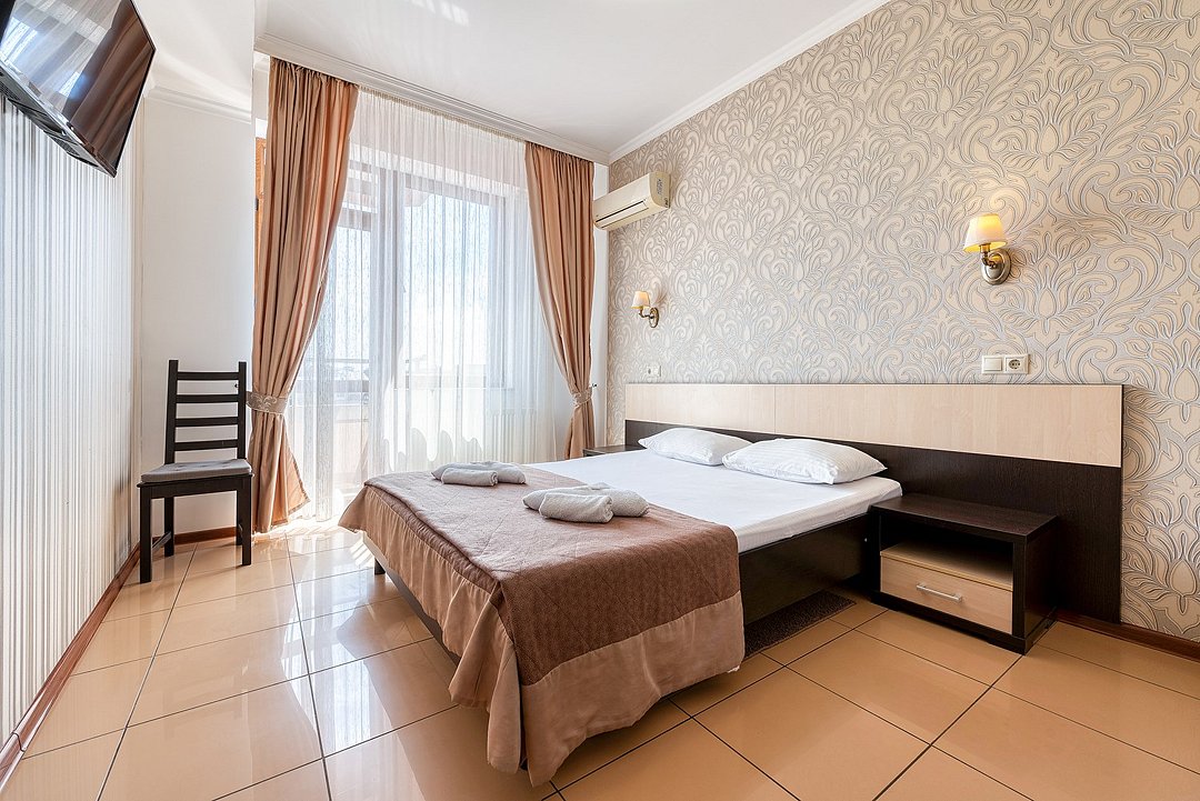 1 двухспальная кровать 160 + 2 доп. места Все номера оснащены: Wi-Fi, системой противопожарной сигнализацией, отоплением, кругосуточным холодным и горячим водоснабжением. Для безопасности в отеле ведется видеонаблюдение. В стоимость обслуживания включены следующие услуги: Проживание Уборка номера ежедневно Смена белья раз в 3-5 дней Дети принимаются с любого возраста. Животных привозить запрещается. Расчетный час: 14:00 - заезд, 12:00 - отъездУслуги и удобства