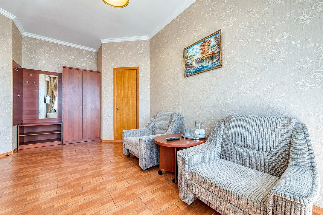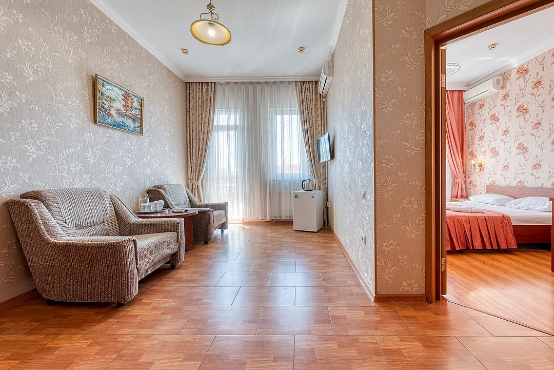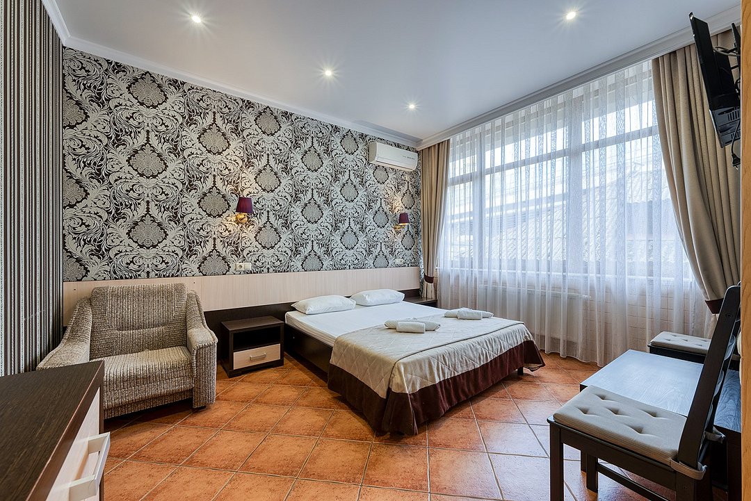 телевизор, Wi-Fi, холодильник, кондиционер, светильник, фен, санузел, теплый пол, халаты, банные полотенца, косметические средства, терраса, две односпальные или большая двуспальная кровать, гладильная доска, тумбы, стулья, шкаф для одежды, вешалки, обеденный стол, зеркало, комод, пуфики, обслуживание номеров, унитаз, гостиная зона, отопление, душ, вид во двор, высокие потолки, стаканы, стул, тумба, туалетные средства, туалет, сплит-система, сушилка для белья, телевизор с плоским экраном, шкаф-купе, телевизор со Smart TV, номер для некурящих, пуфик, холодильный шкаф, чайная станция, услуги прачечной (платно), вешалки-плечикиВ гостиничном номере