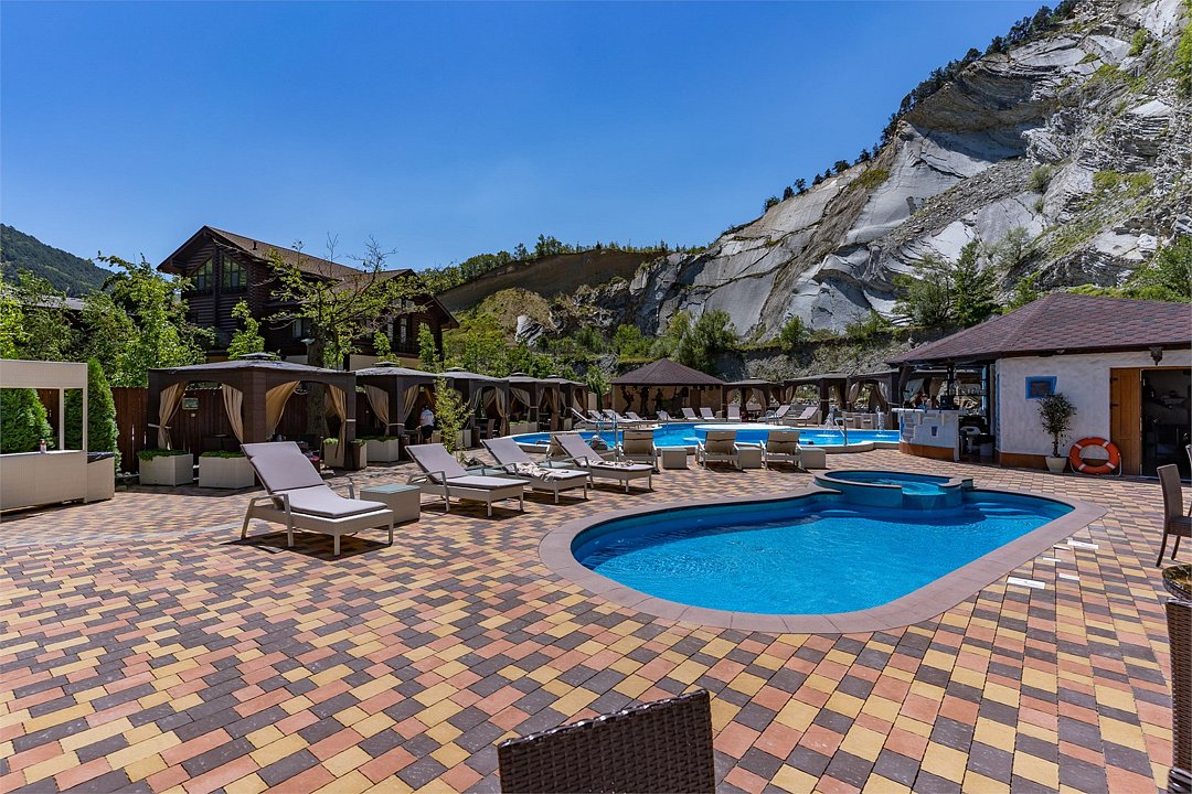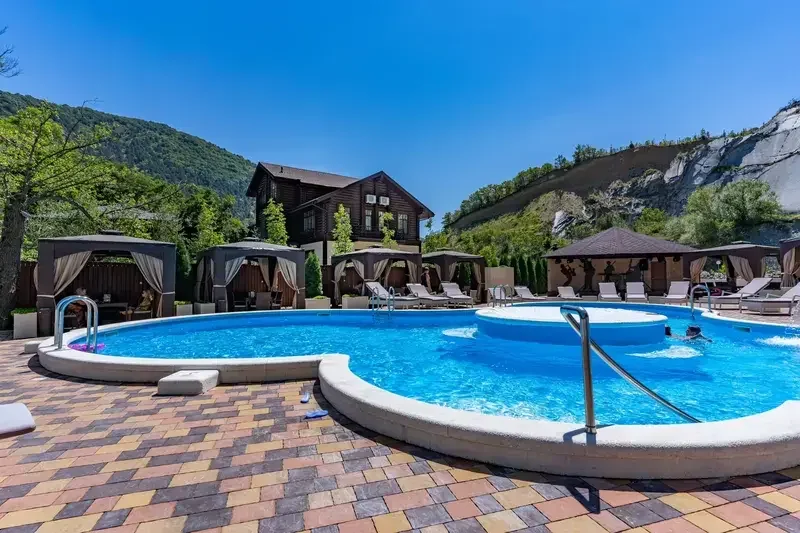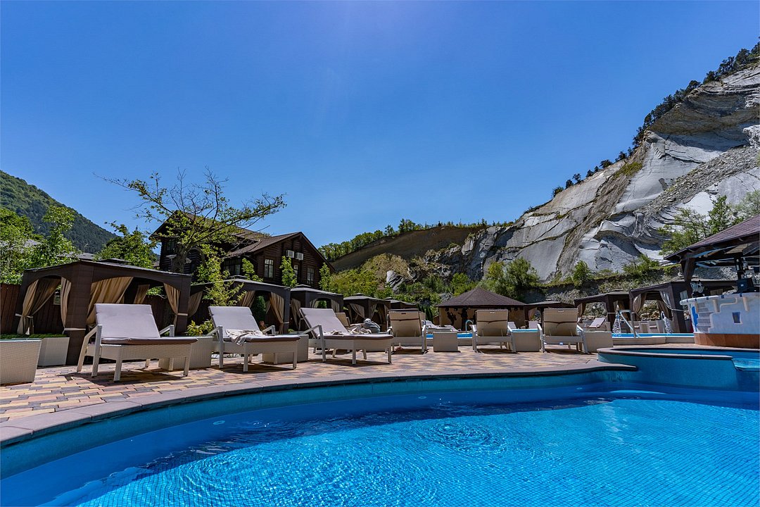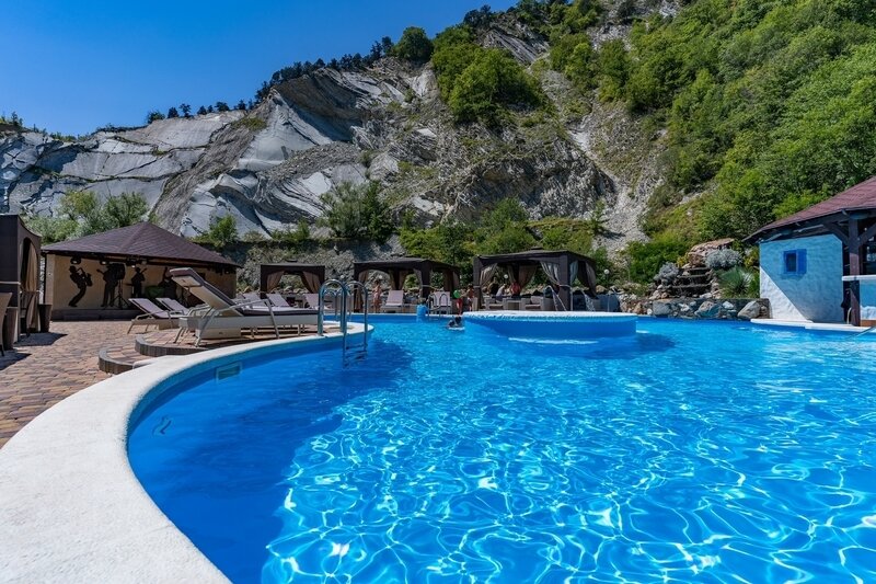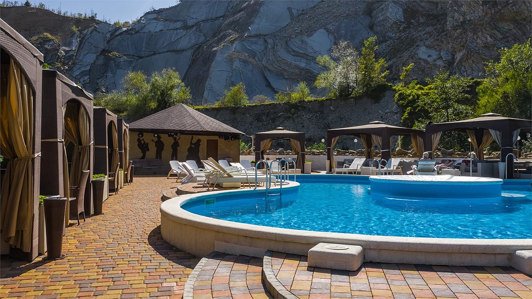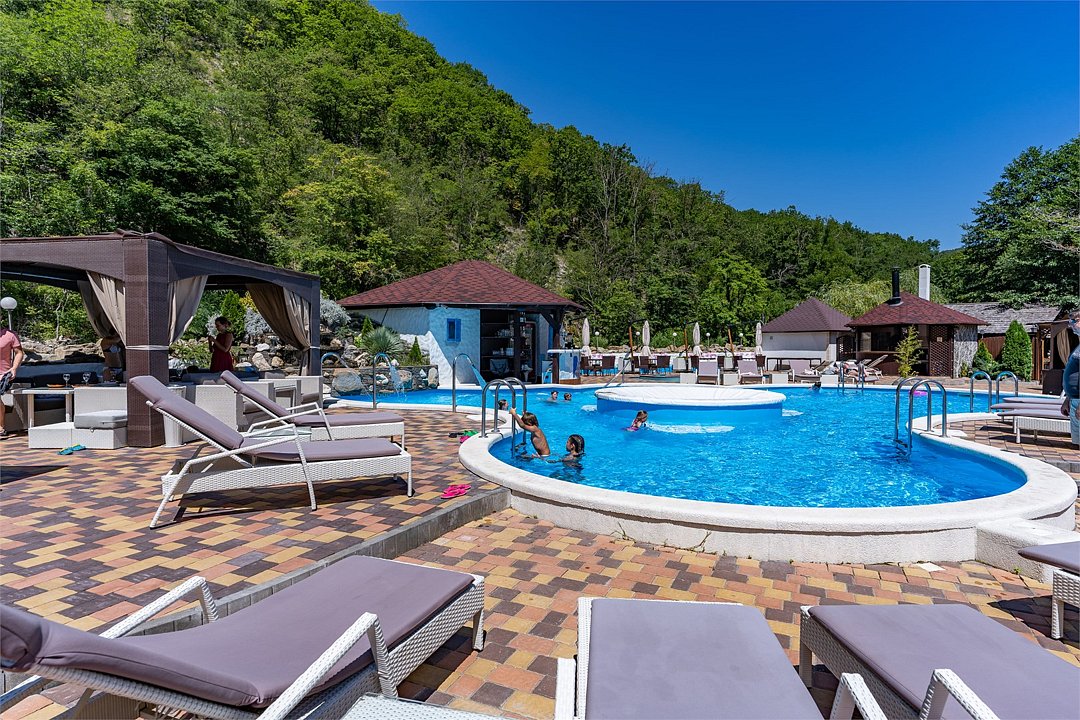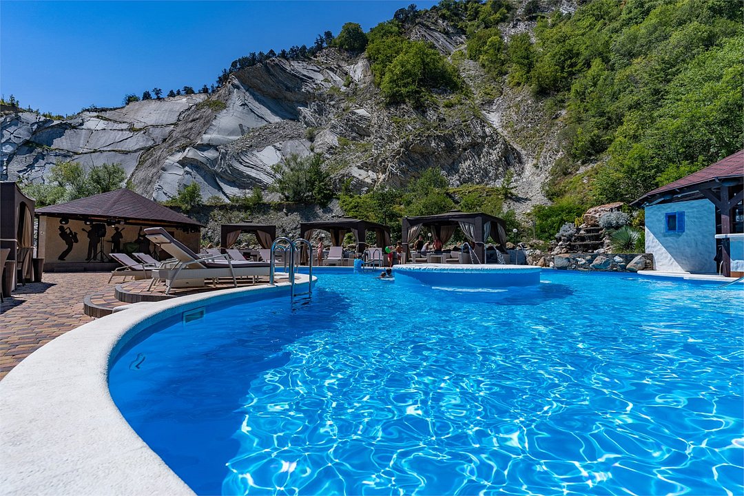 Тип бассейна: открытый бассейнВода в бассейне: подогреваемый бассейнРядом с бассейном: шезлонги, зонтики, полотенца, бар у бассейнаТемпература в бассейне: 35 °CНаслаждаться водными процедурами в термальном бассейне можно круглый год благодаря поддержанию комфортной температуры воды. Для удобства гостей предусмотрены отапливаемые зимние беседки-сферы, вместимостью от 8 до 24 человек. А летом – уютные беседки на 8-12 человек и столики с обслуживанием официантами по меню ресторана.