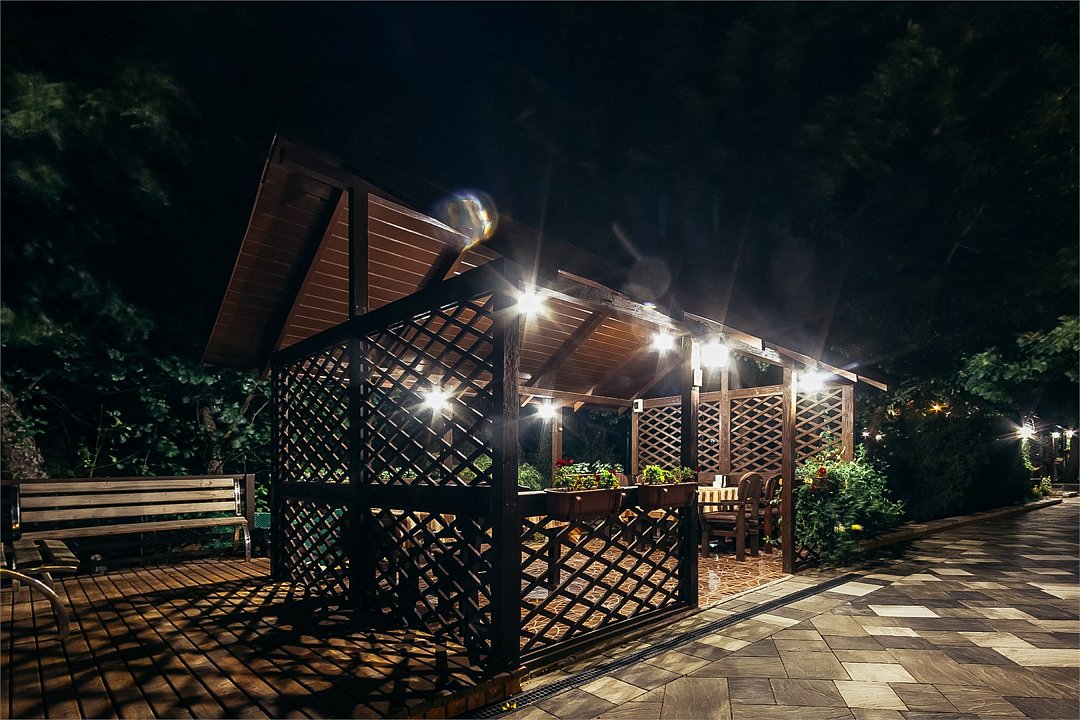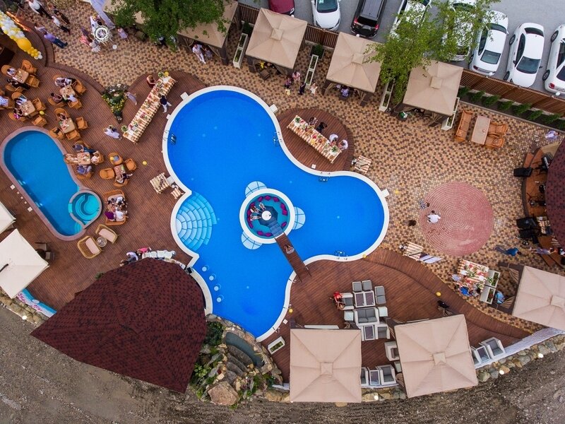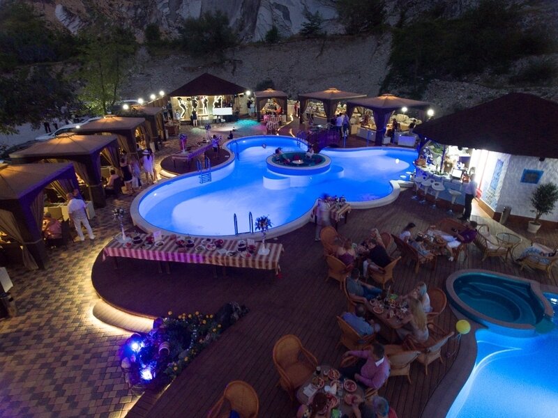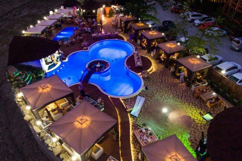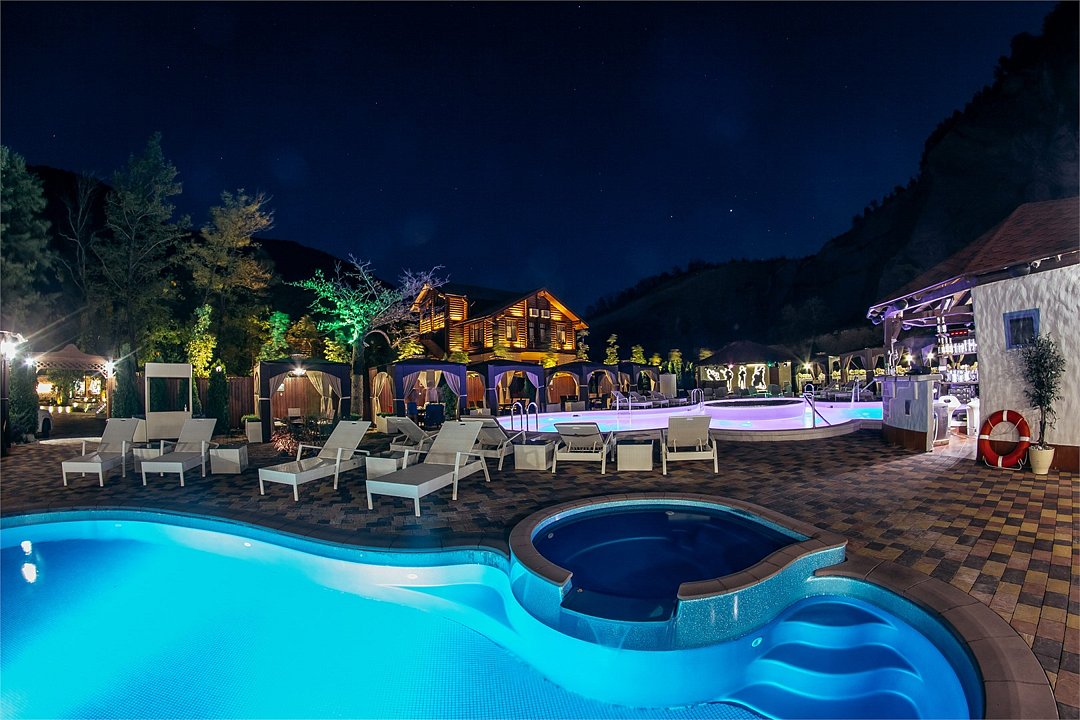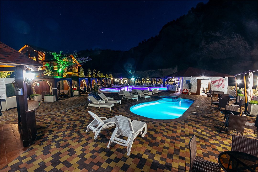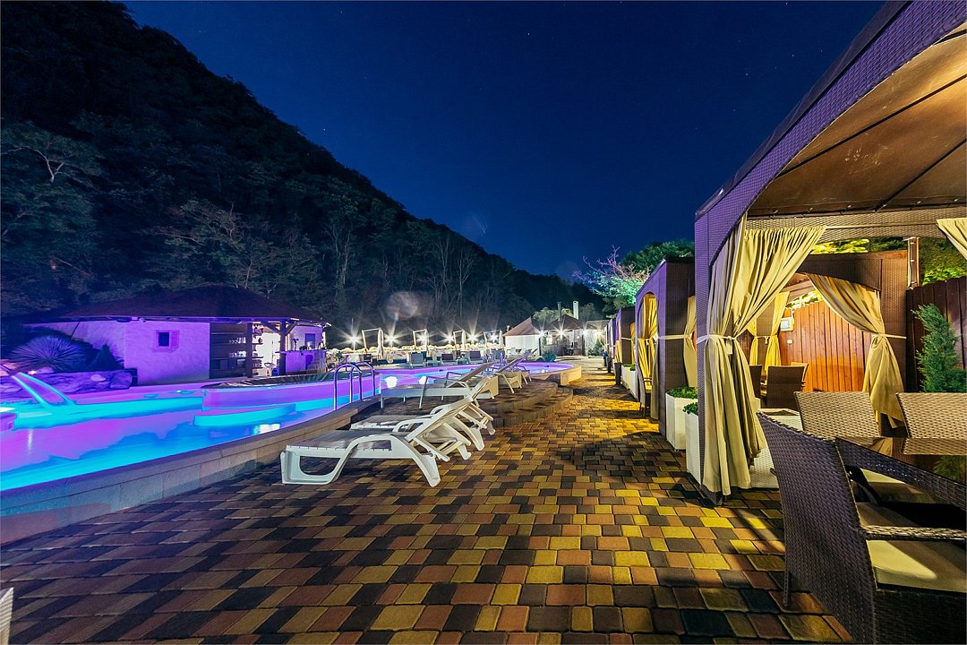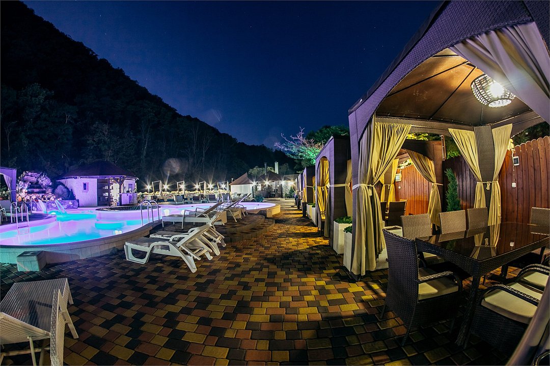 Читать полностьюНаслаждаться водными процедурами в термальном бассейне можно круглый год благодаря поддержанию комфортной температуры воды. Для удобства гостей предусмотрены отапливаемые зимние беседки-сферы, вместимостью от 8 до 24 человек. А летом – уютные беседки на 8-12 человек и столики с обслуживанием официантами по меню ресторана.