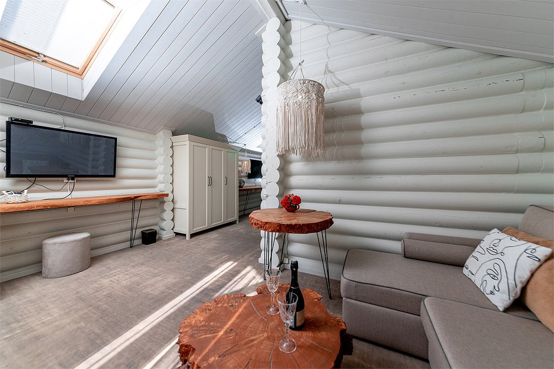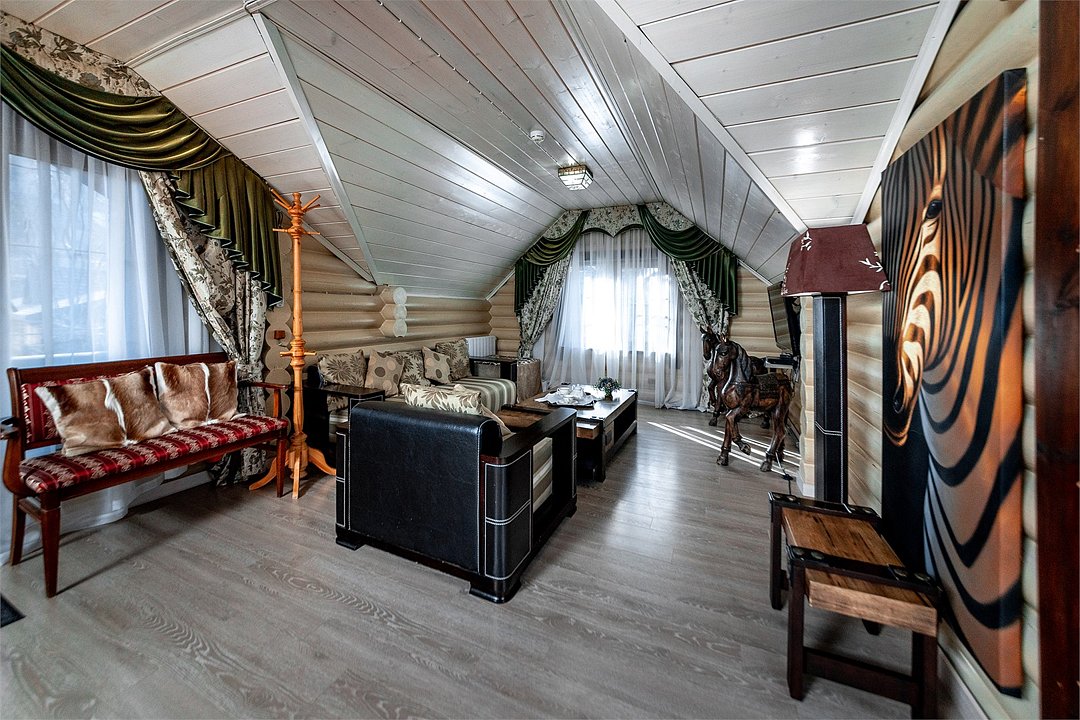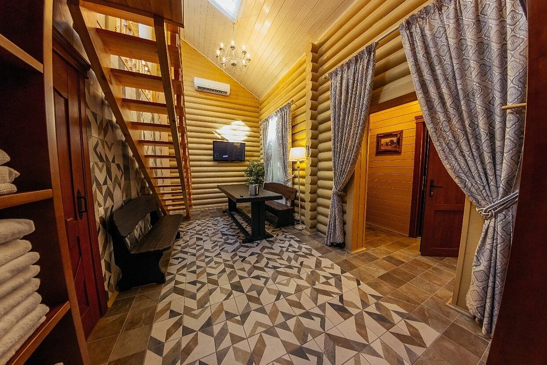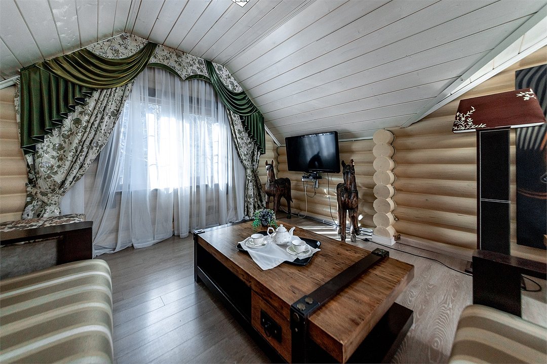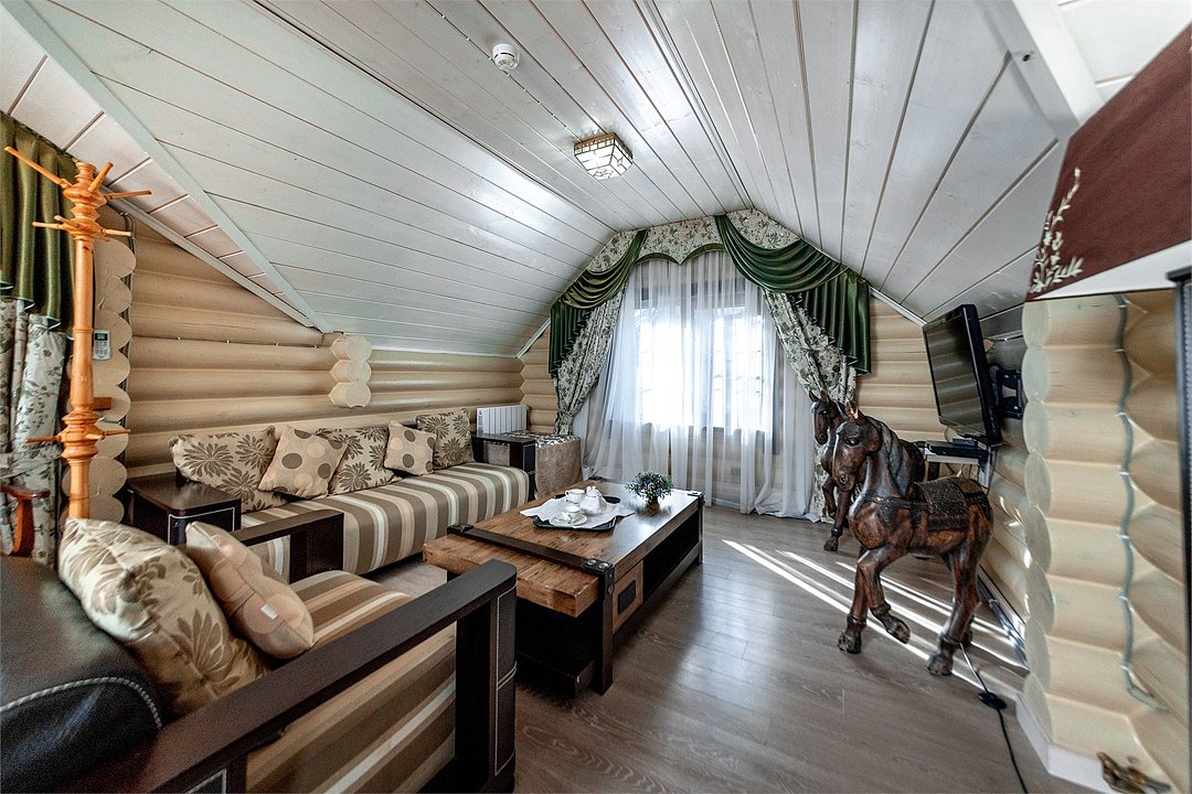 Мы рады предложить Вам удобные и уютные двухкомнатные номера категории "люкс" площадью 56 кв.м. Номера расположены на вторых этажах срубового дома и обладают индивидуальными выходами на балконы, что позволяет насладиться свежим воздухом и прекрасным видом на горы и зелень. При неизменной роскоши каждого из люксов, каждый из них обладает неподражаемым дизайном. Вы сможете выбрать для себя тот люкс, который особенно подходит вам и станет излюбленным местом для отдыха. Теплая цветовая гамма, уникальная комплектация, дизайнерская мебель создают особенную атмосферу в номерах. Стильная и просторная гостиная с мягким диваном и уютная спальня с комфортной кроватью, ванная комната и вся необходимая техника, имеющаяся в наличии , будут способствовать незабываемому отдыху.Услуги и удобства