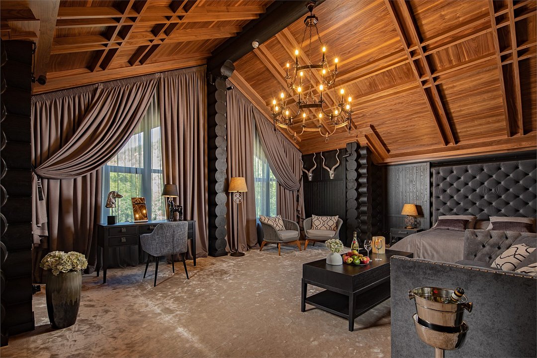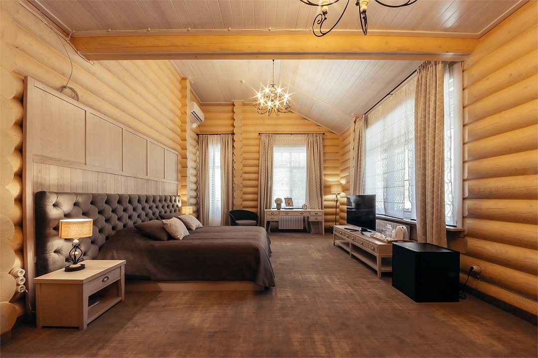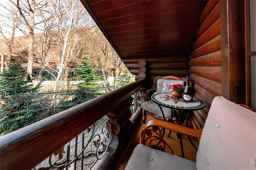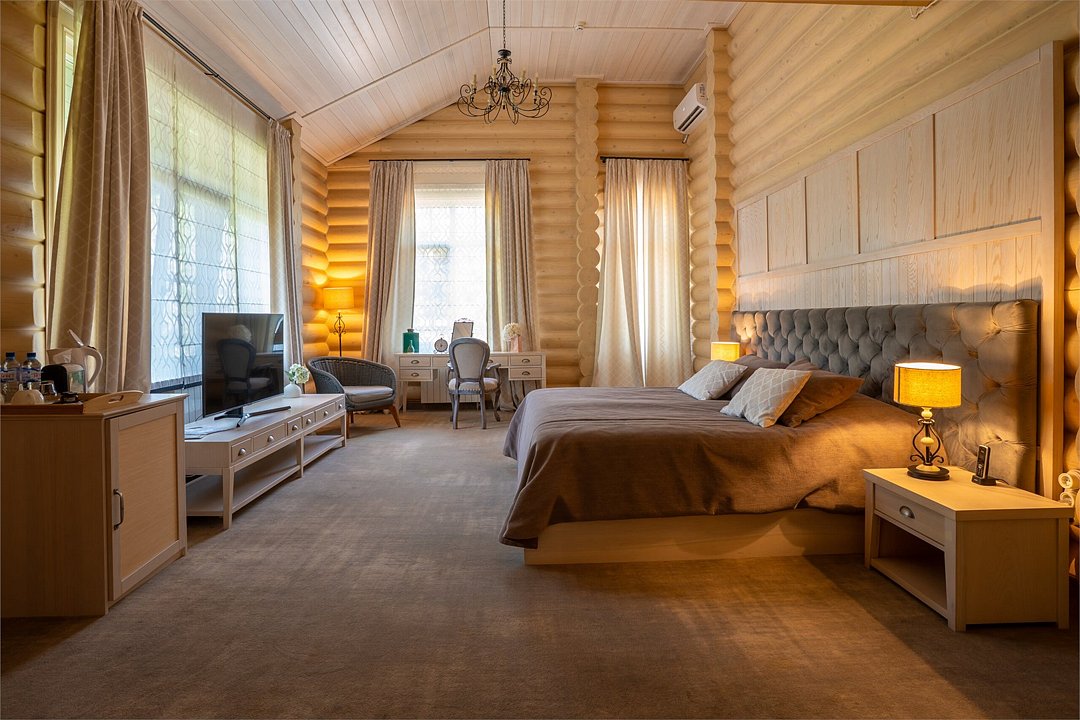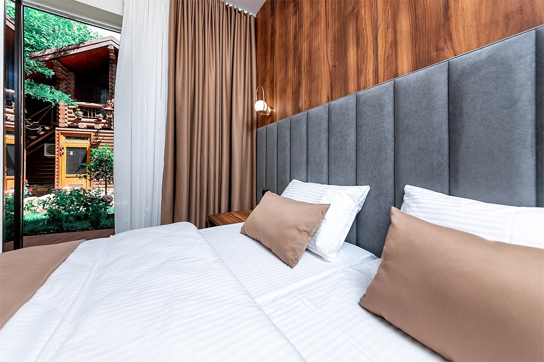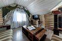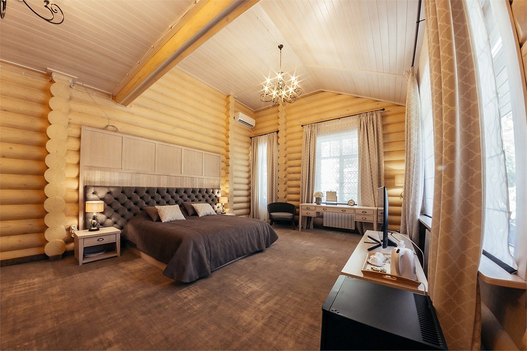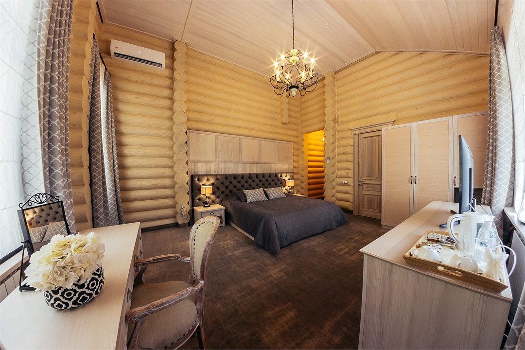 Мы рады предложить Вам удобные и уютные двухкомнатные номера категории "люкс" площадью 56 кв.м. Номера расположены на вторых этажах срубового дома и обладают индивидуальными выходами на балконы, что позволяет насладиться свежим воздухом и прекрасным видом на горы и зелень. При неизменной роскоши каждого из люксов, каждый из них наделен неподражаемым дизайном. Вы сможете выбрать для себя тот люкс, который особенно подходит вам и станет излюбленным местом для отдыха. Теплая цветовая гамма, уникальная комплектация, дизайнерская мебель создают особенную атмосферу в номерах. Стильная и просторная гостиная с мягким диваном и уютная спальня с комфортной кроватью, ванная комната и вся необходимая техника, имеющаяся в наличии , будут способствовать незабываемому отдыху.Услуги и удобства