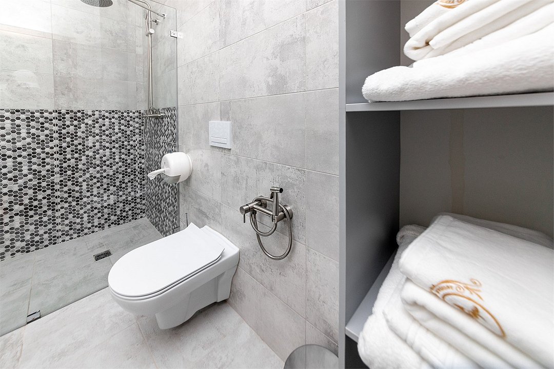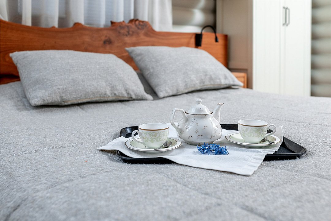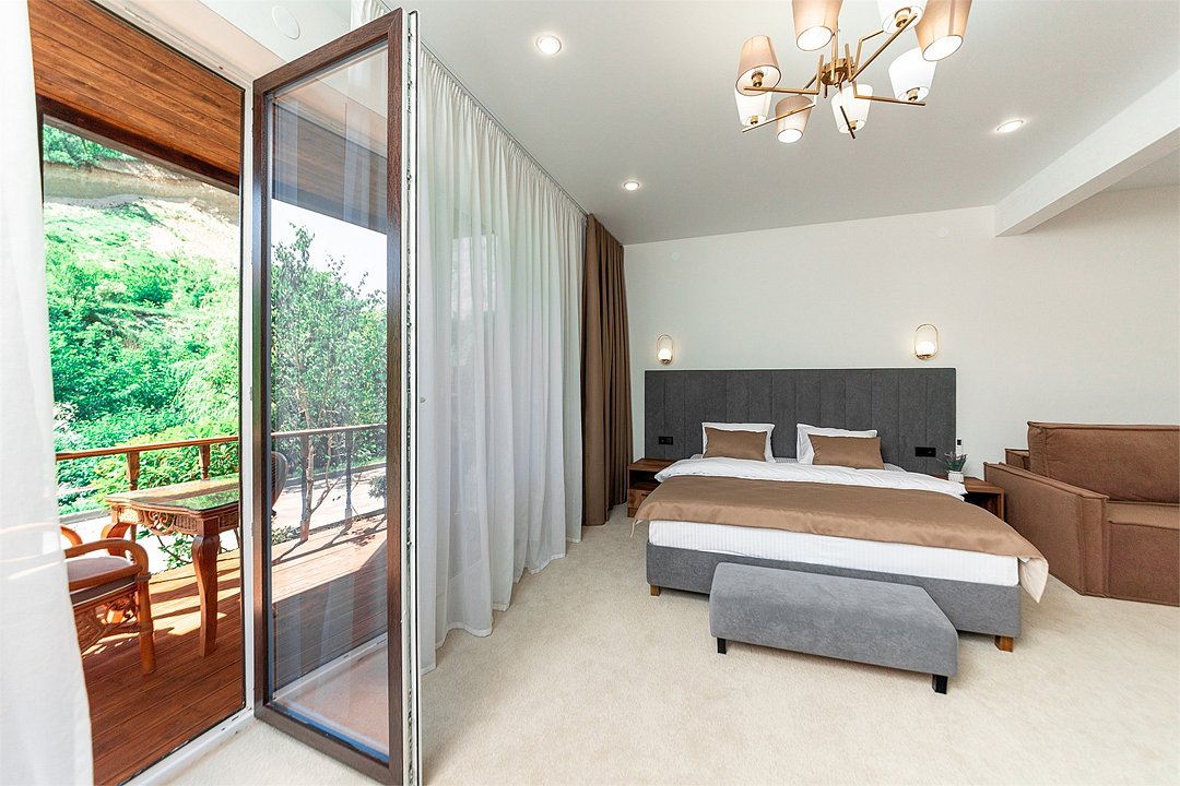 Роскошная обстановка данного номера повышенной комфортности придется по вкусу даже самым требовательным гостям, оставив надолго приятные воспоминания о минутах, проведенных здесь. Двухкомнатный номер общей площадью 67 кв.м. расположился на первом этаже нового дома и идеально подойдет для семейного отдыха , либо большим компаниям. Гостиная, спальня и ванная комната приятно поражают воображение своими размерами и изящным внутренним убранством, сочетающим лучшие классические традиции дизайна с современными предметами мебели и атрибутами декора. Наши гости могут в любое время насладиться кружечкой кофе на собственной террасе, где расположен мягкий уголок с мебелью . С зоны отдыха открывается прекрасный вид на горный пейзаж.Услуги и удобства
